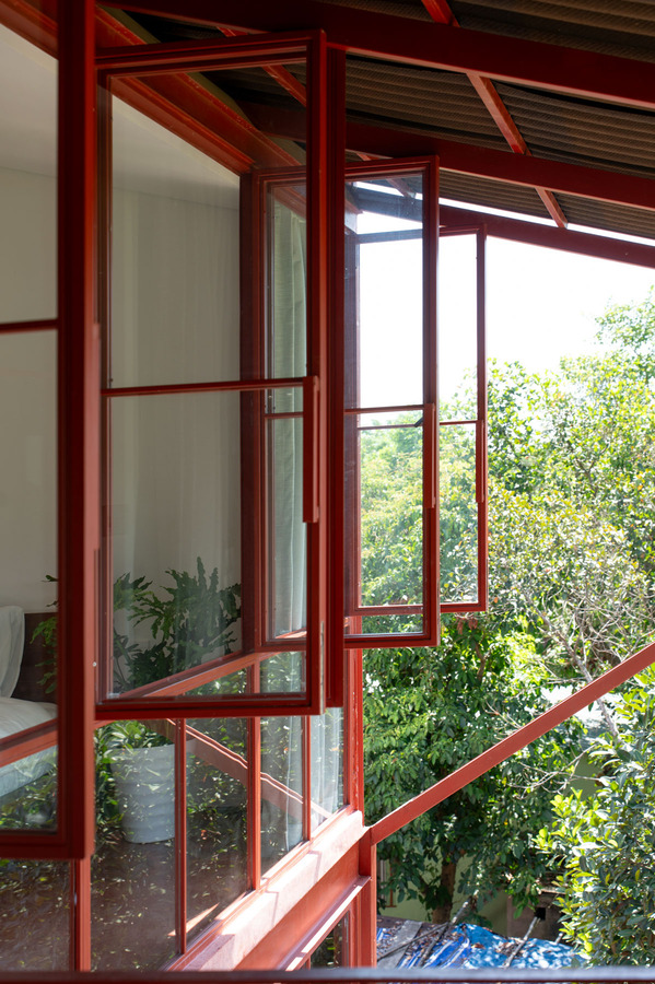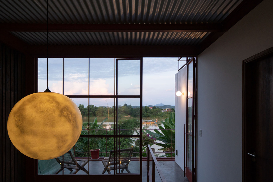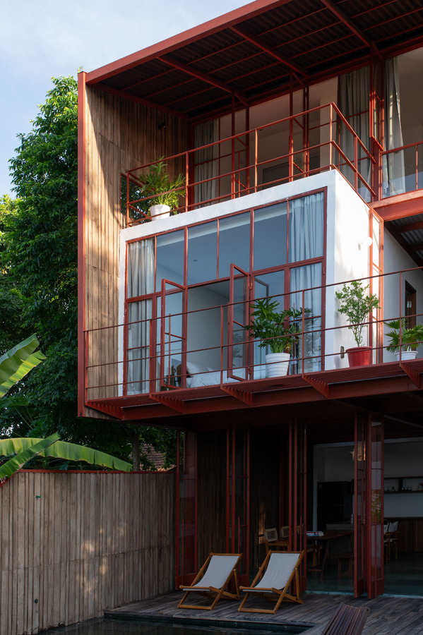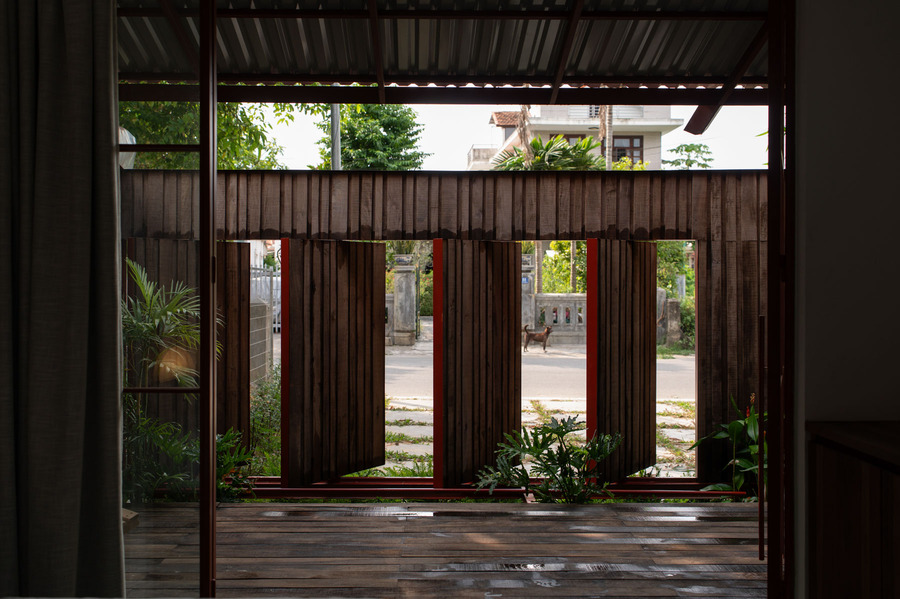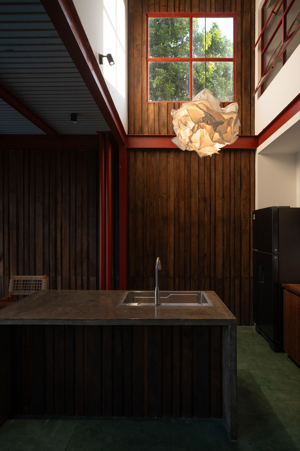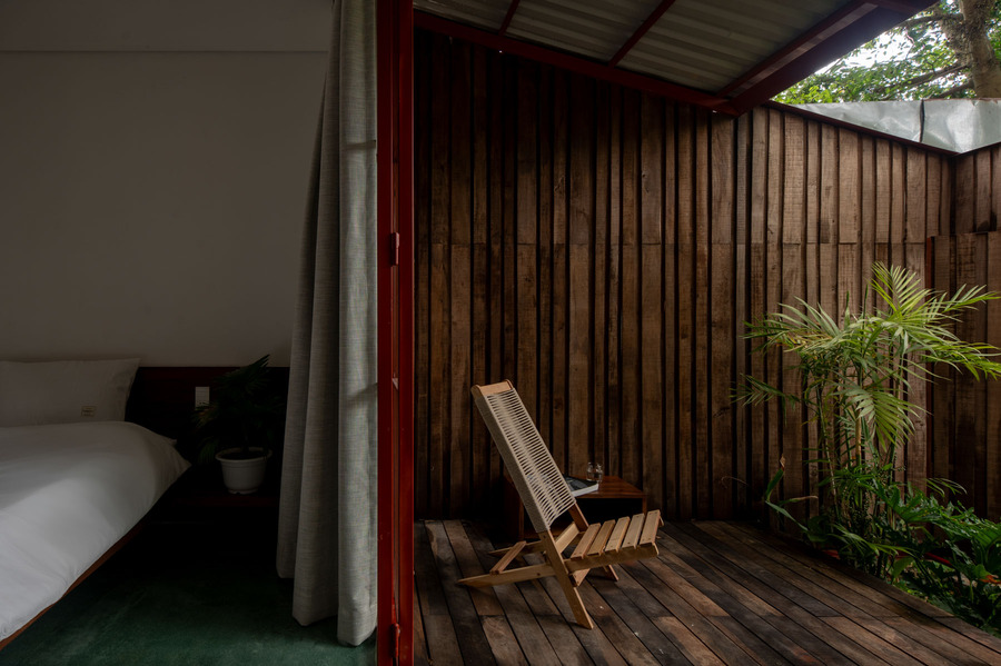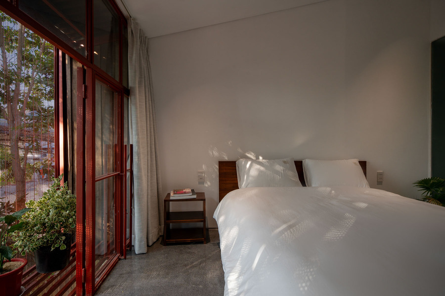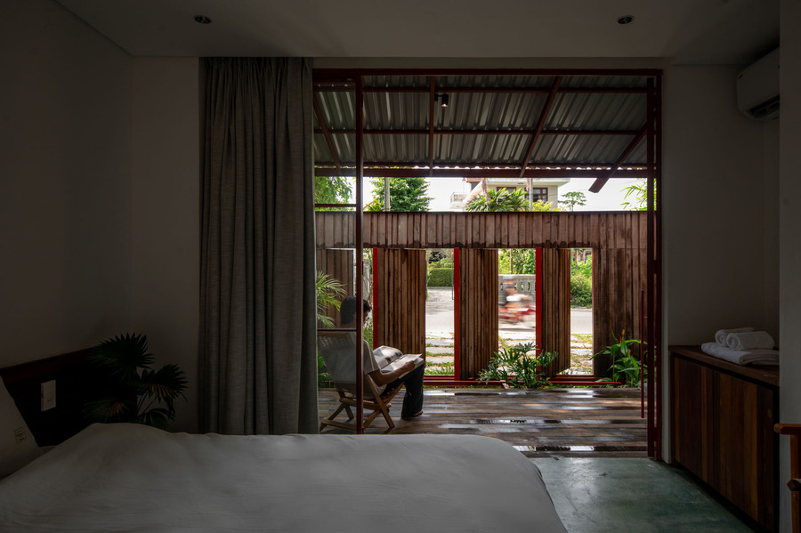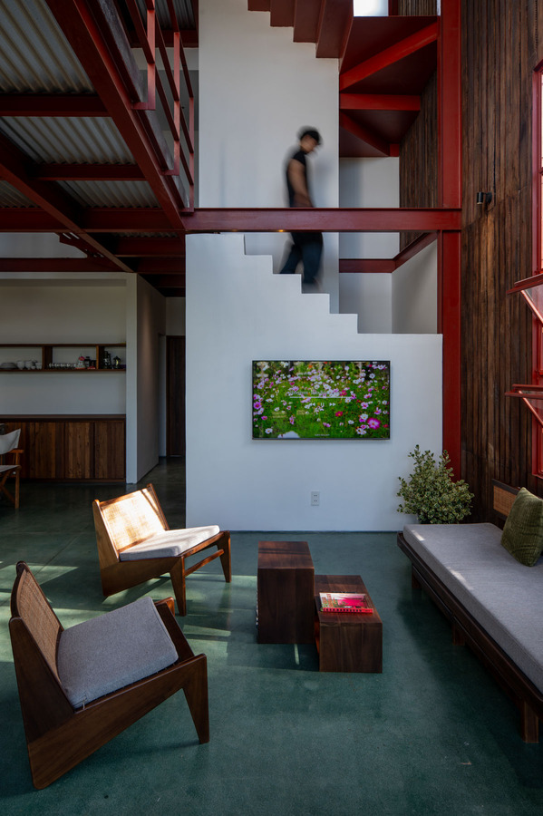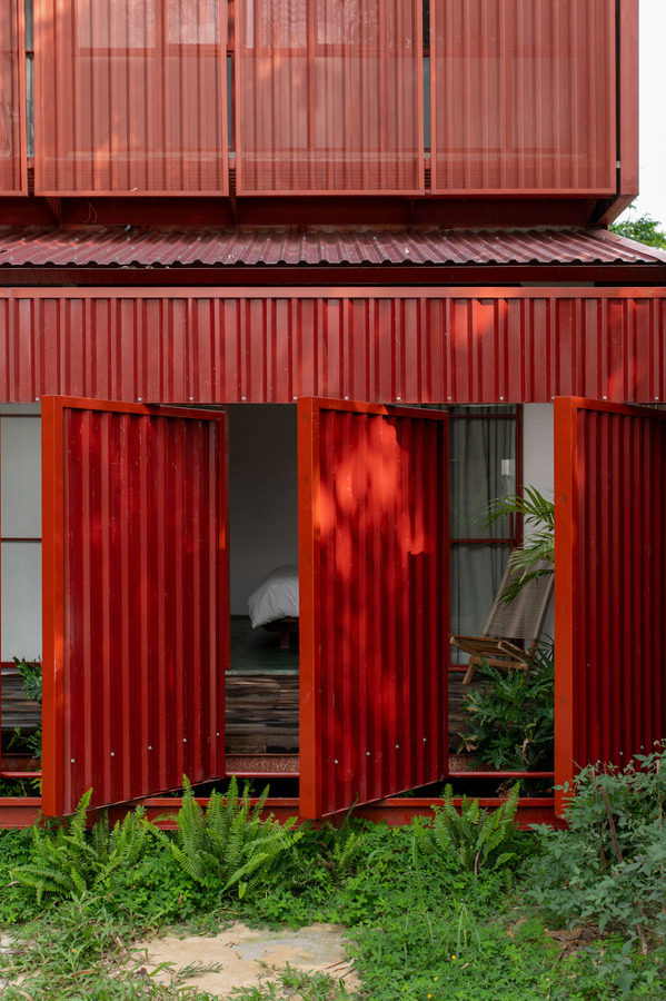 Về mặt thẩm mỹ, công trình không hòa tan vào sắc xanh bối cảnh. Sắc đỏ được sử dụng như một dấu hiệu nhận diện có chủ ý, tạo nên sự đối thoại giữa kiến trúc và thiên nhiên. Các vật liệu chủ đạo như bê tông, gỗ, thép và mái tôn đỏ được xử lý theo hướng thô mộc, để lộ bản chất vật liệu. Chúng không được lựa chọn vì sự hoàn hảo, mà vì khả năng lão hóa tự nhiên theo thời gian, qua đó giảm chi phí bảo trì và gia tăng giá trị thẩm mỹ bền vững.