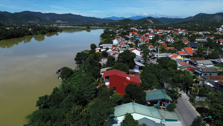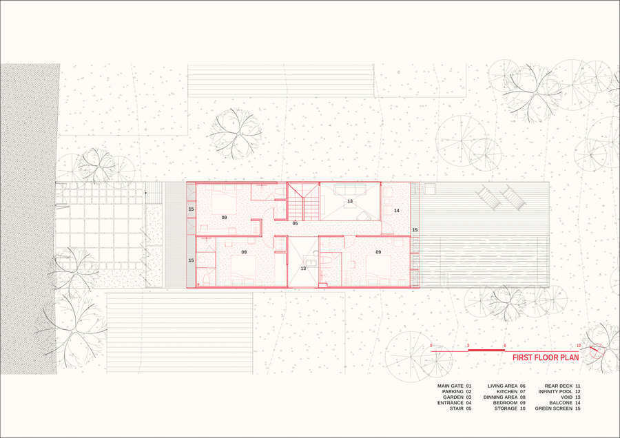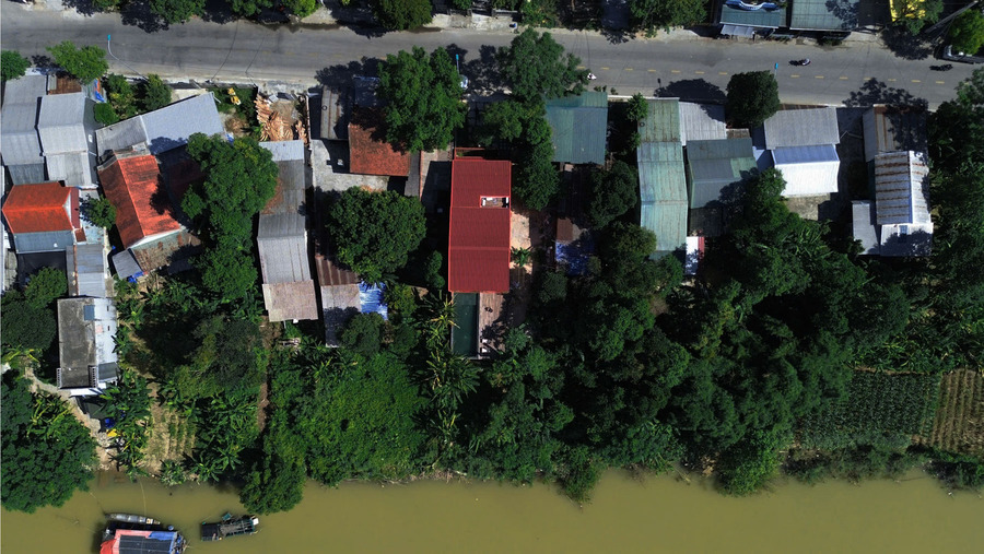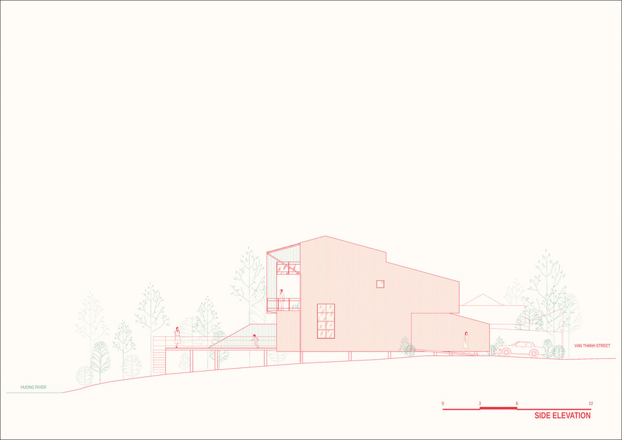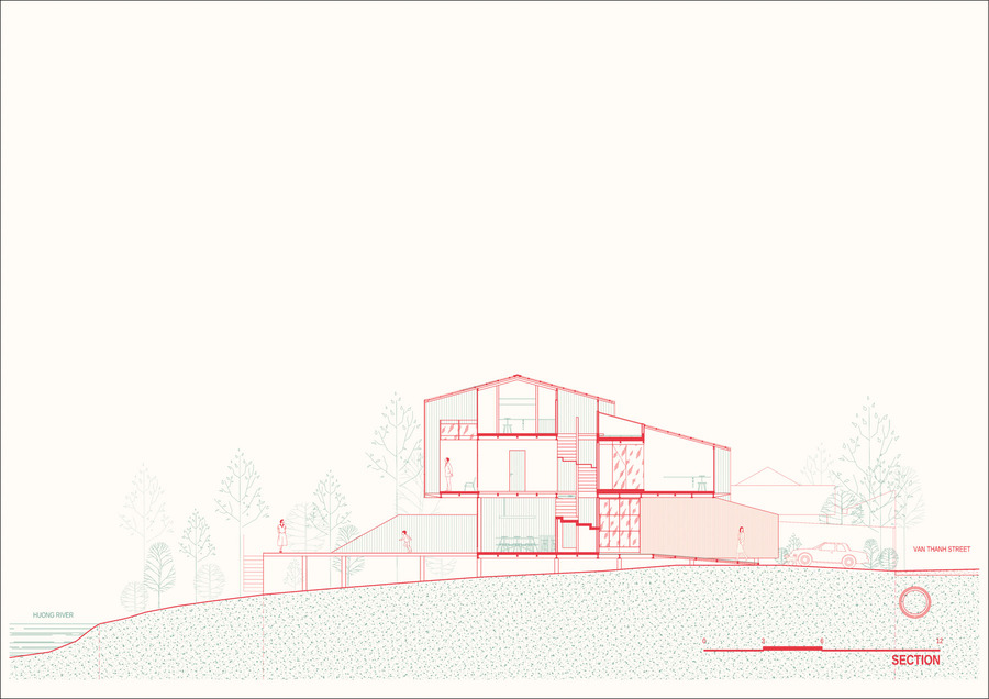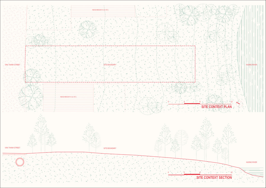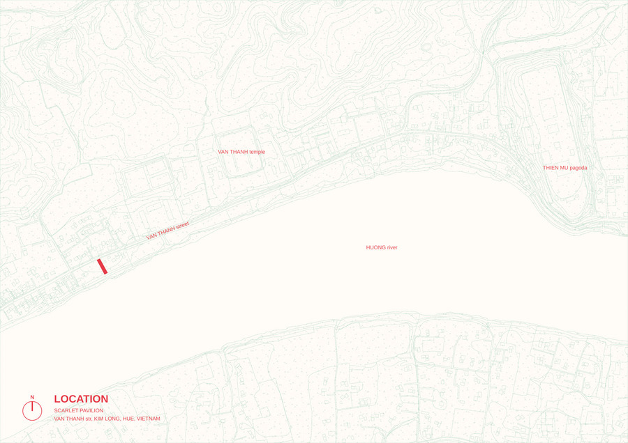 Khu đất có kích thước 7m × 35m với hai mặt mang tính chất đối lập rõ rệt: phía sau tiếp giáp sông Hương tĩnh lặng, trong khi phía trước là trục giao thông đô thị ồn ào và nhiều xáo trộn. Sự đối nghịch này trở thành tiền đề cho ý niệm thiết kế theo hướng khép kín có chọn lọc về phía đô thị và cởi mở hoàn toàn về phía thiên nhiên. Scarlet Pavilion không tạo ra các ranh giới cứng, mà được tổ chức như một chuỗi không gian chuyển tiếp, dẫn dắt người sử dụng rời xa náo động để tiến sâu vào những khoảng lặng yên tĩnh hơn. Kiến trúc đóng vai trò điều tiết và làm dịu sự chuyển đổi bối cảnh, đồng thời hỗ trợ thông gió tự nhiên và giảm nhu cầu sử dụng các giải pháp làm mát nhân tạo.