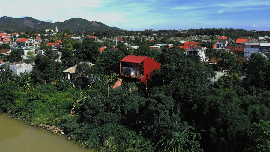 Scarlet Pavilion được hình thành như ngôi nhà thứ hai của một cặp vợ chồng trẻ tại Huế, đáp ứng nhu cầu nghỉ dưỡng cuối tuần kết hợp khai thác lưu trú quy mô nhỏ. Công trình tọa lạc trong một bối cảnh đặc biệt, với những ràng buộc nghiêm ngặt về quy hoạch cảnh quan ven sông, không cho phép xây dựng kiên cố. Thay vì xem đây là một hạn chế, nhóm thiết kế coi ràng buộc này như điểm khởi đầu cho tư duy kiến trúc, từ đó lựa chọn giải pháp nhà tiền chế như một cách tiếp cận nhẹ và linh hoạt, giúp giảm thiểu tác động lên khu đất và cho phép khả năng tháo lắp, hoàn nguyên trong tương lai.
