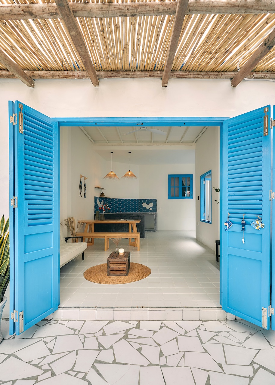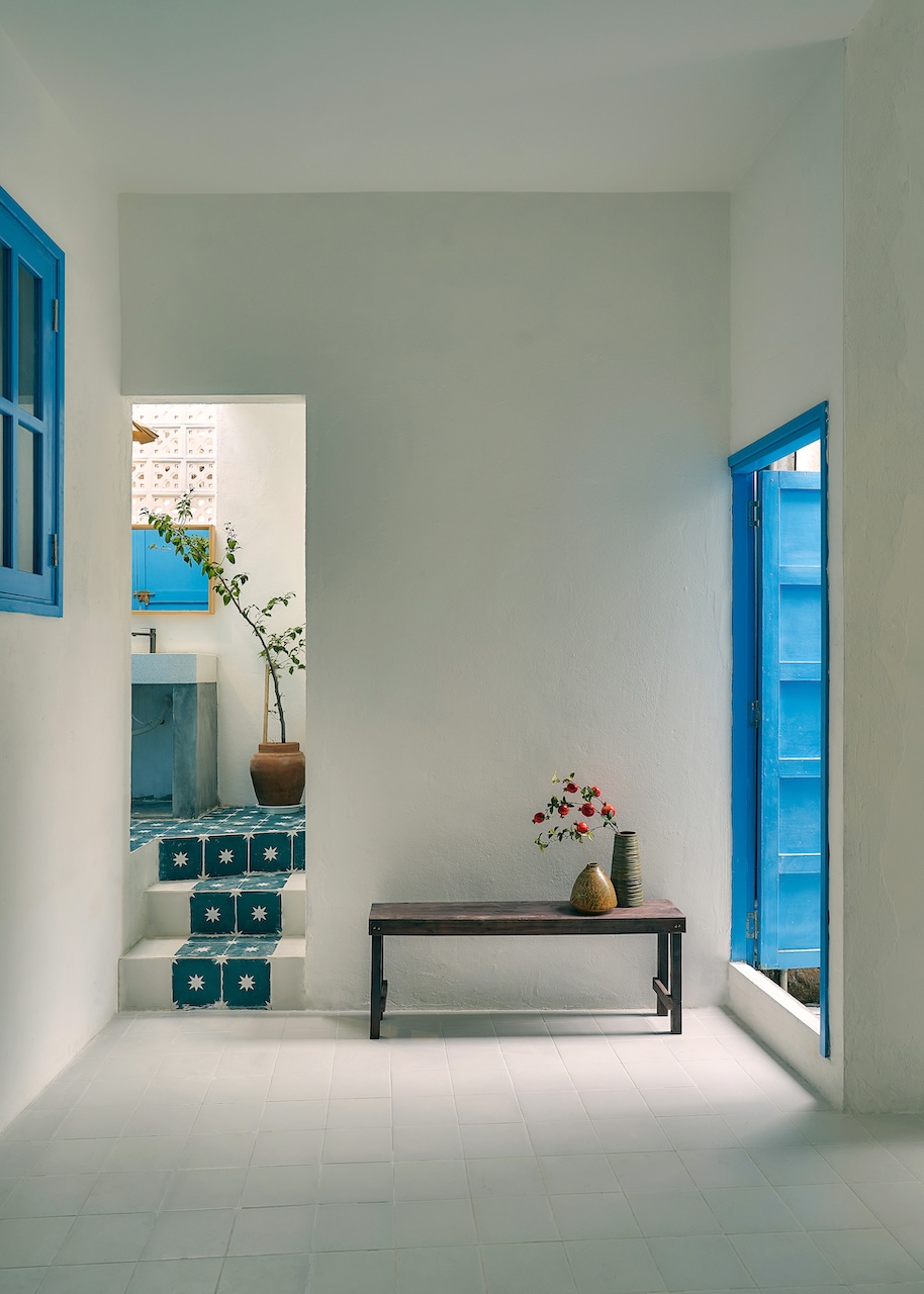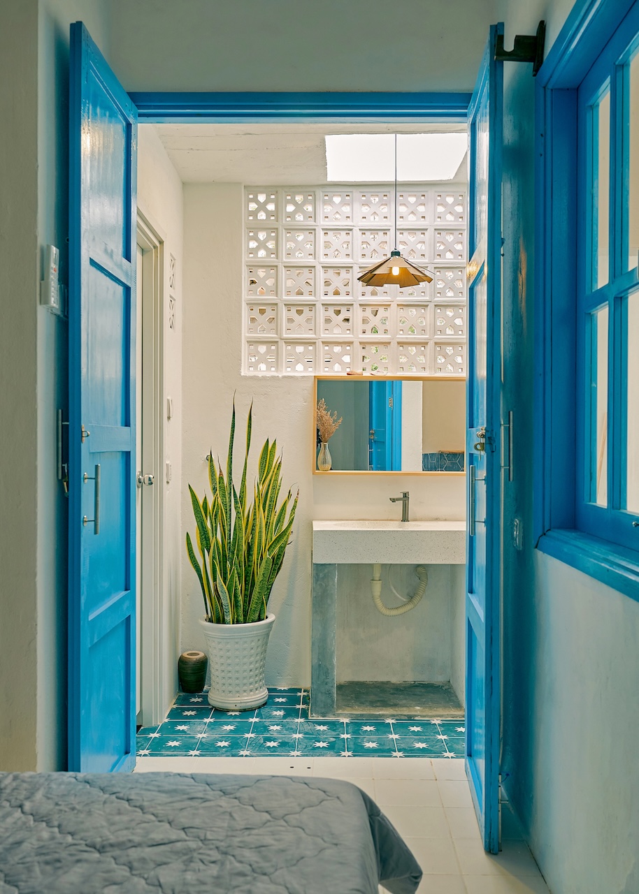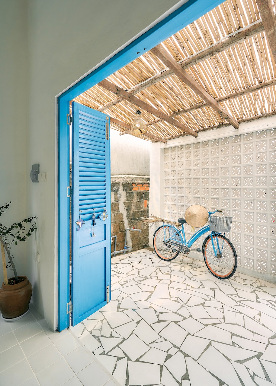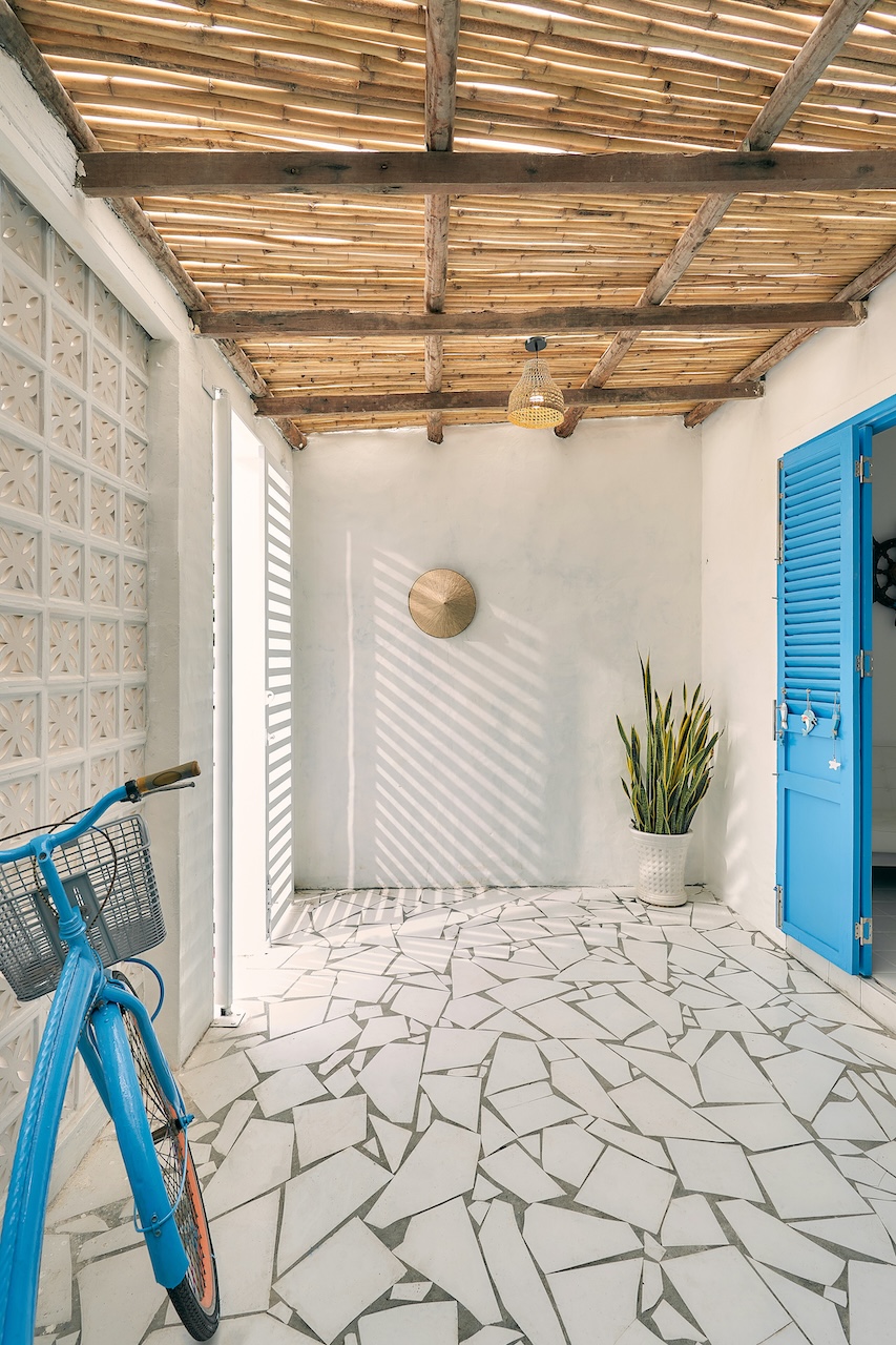 Chất liệu địa phương xuất hiện trong từng chi tiết, từ ngoại thất đến nội thất. Những bức tường gạch bông gió kết hợp hài hòa với nền gạch đồng màu, gợi nhắc về phong cách Địa Trung Hải quen thuộc. Các bức tường gồ ghề thô mộc cùng những ô cửa lớn giúp tối ưu ánh sáng tự nhiên và tạo sự thông thoáng, phù hợp với khí hậu vùng biển.