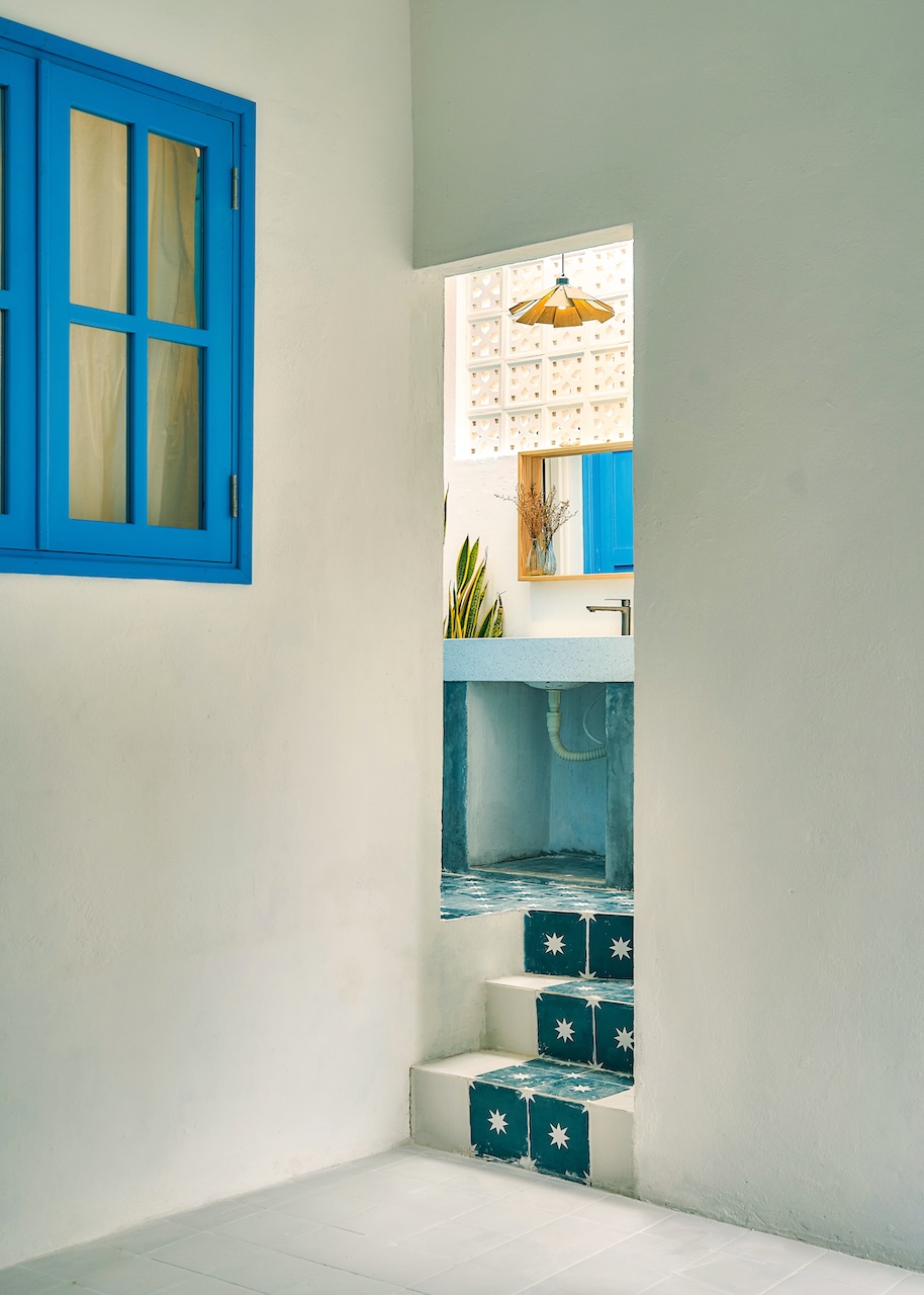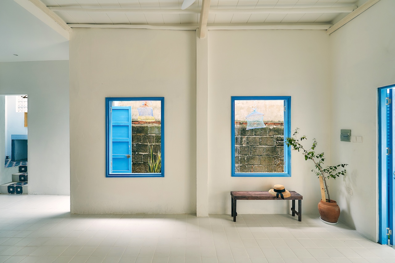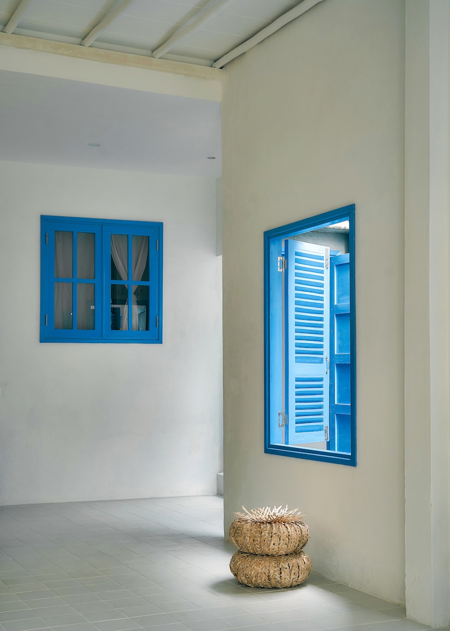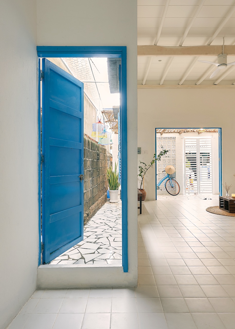 Chất liệu địa phương xuất hiện trong từng chi tiết, từ ngoại thất đến nội thất. Những bức tường gạch bông gió kết hợp hài hòa với nền gạch đồng màu, gợi nhắc về phong cách Địa Trung Hải quen thuộc. Các bức tường gồ ghề thô mộc cùng những ô cửa lớn giúp tối ưu ánh sáng tự nhiên và tạo sự thông thoáng, phù hợp với khí hậu vùng biển.