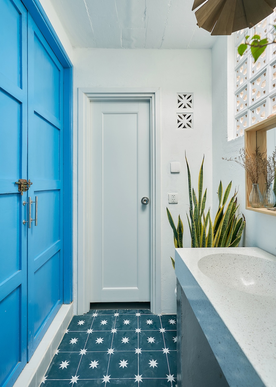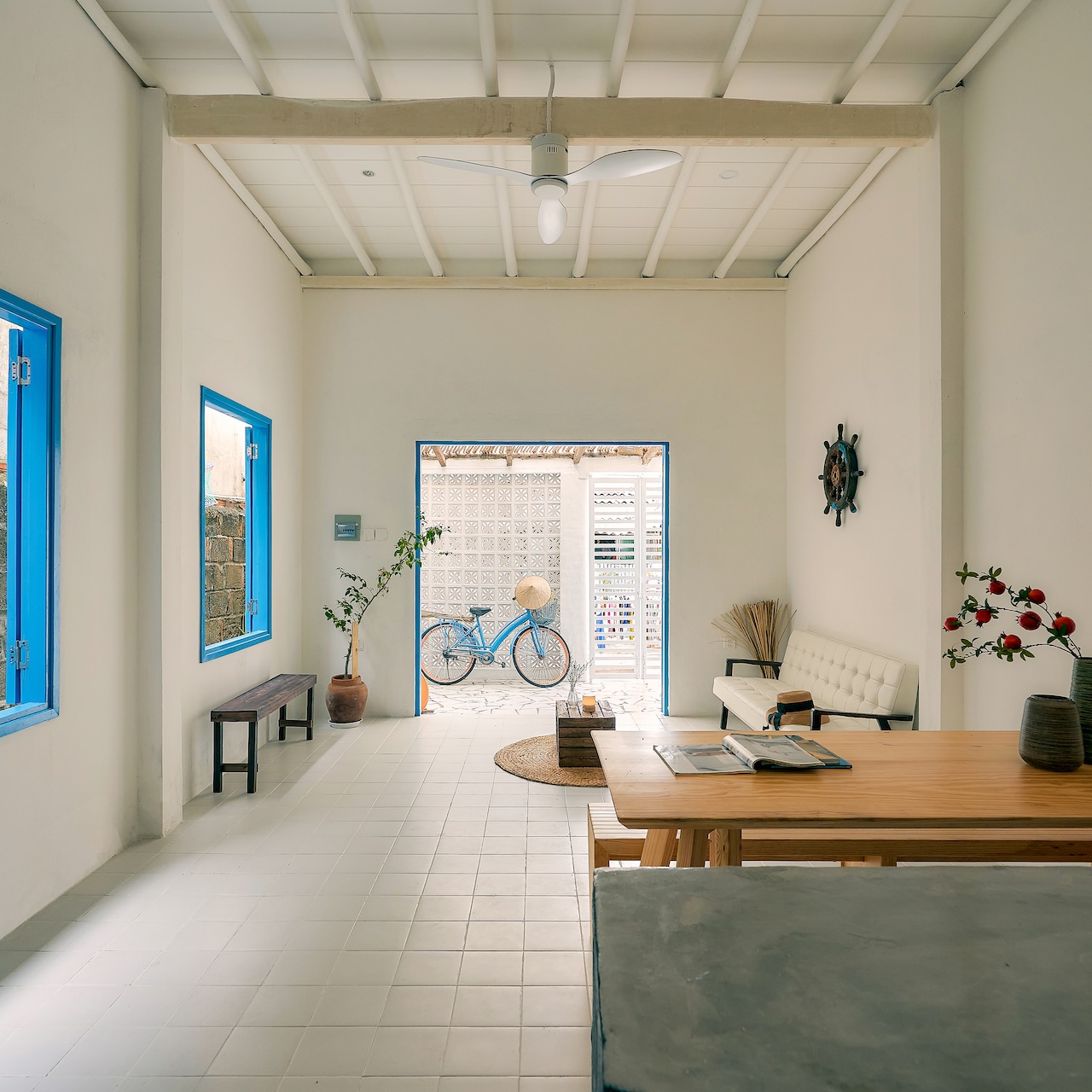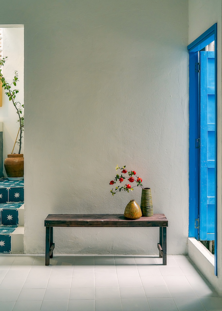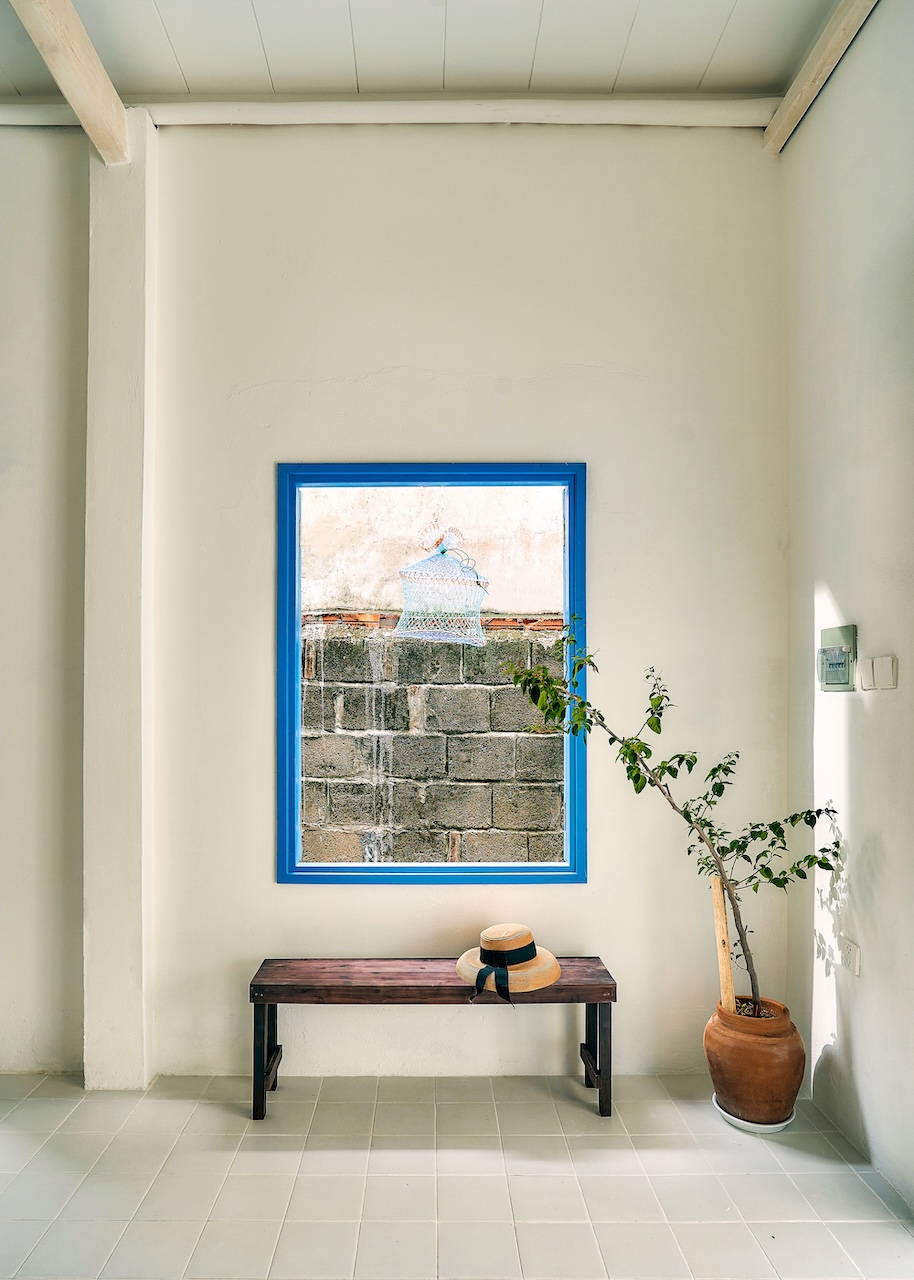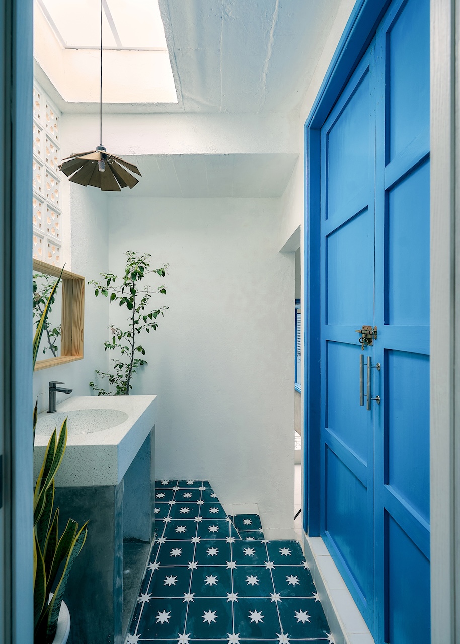 Chất liệu địa phương xuất hiện trong từng chi tiết, từ ngoại thất đến nội thất. Những bức tường gạch bông gió kết hợp hài hòa với nền gạch đồng màu, gợi nhắc về phong cách Địa Trung Hải quen thuộc. Các bức tường gồ ghề thô mộc cùng những ô cửa lớn giúp tối ưu ánh sáng tự nhiên và tạo sự thông thoáng, phù hợp với khí hậu vùng biển.