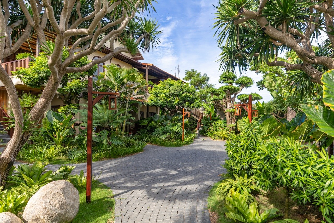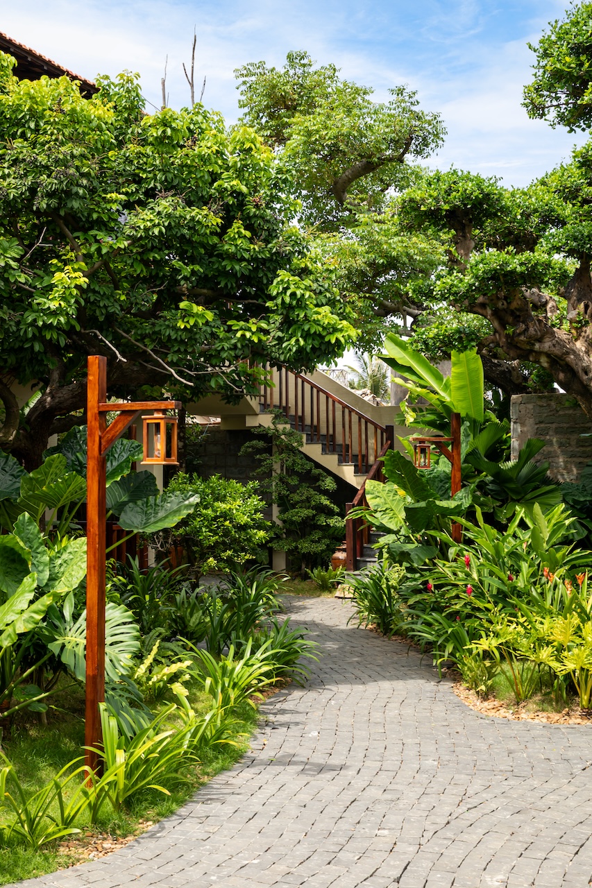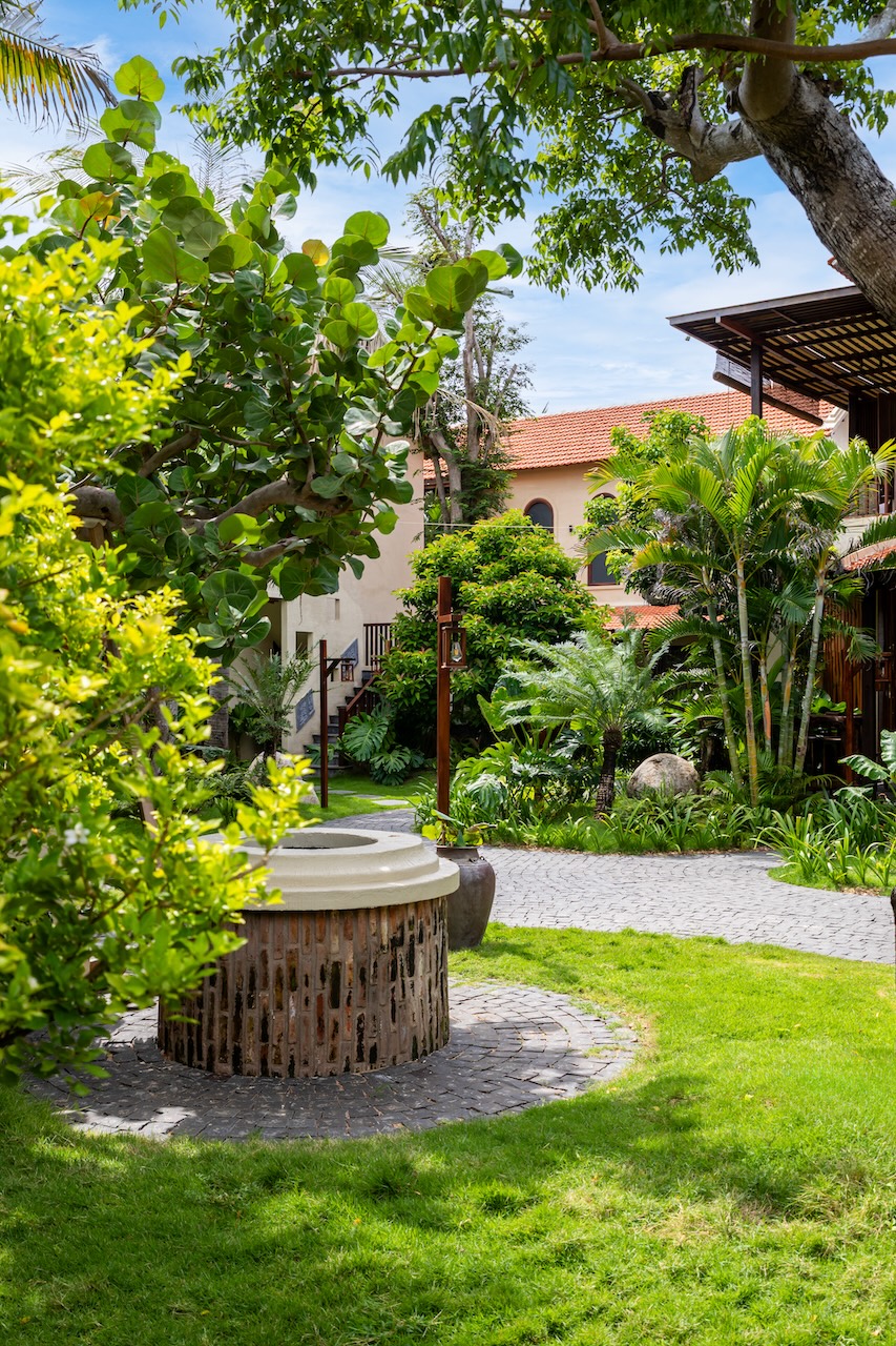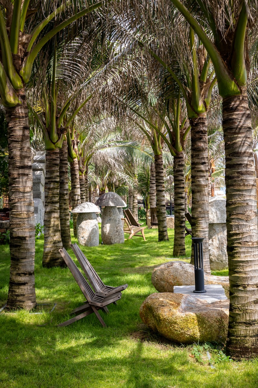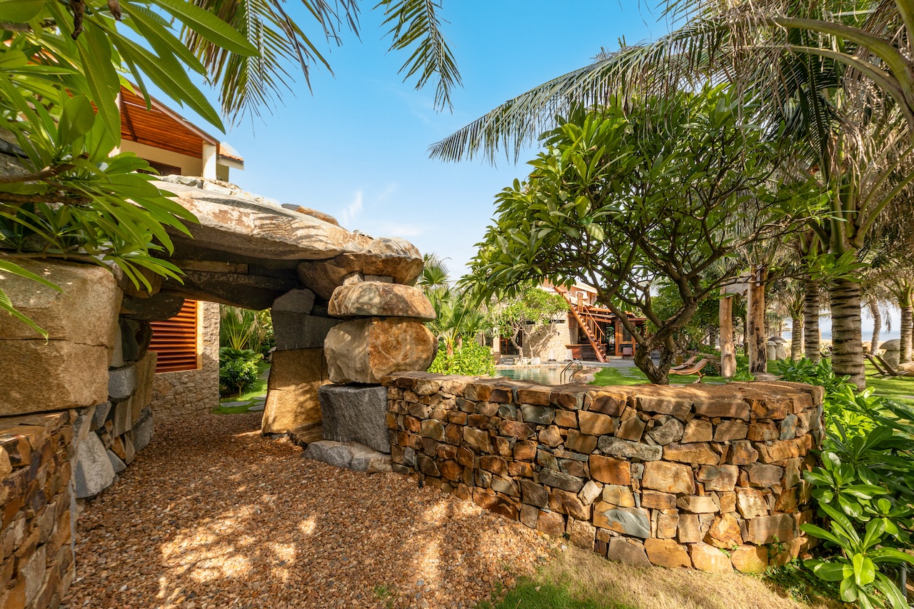 Từ vùng đất bỏ hoang, khu vườn được phủ xanh trở lại bằng các loài cây bản địa như dừa, nhãn rừng, bàng biển, duối, phát tài núi… tạo nên hệ sinh thái xanh gắn kết con người với thiên nhiên, đồng thời gợi lại ký ức thân thuộc của người con xa quê. Những hàng rào đá thấp được giữ nguyên như một biểu tượng của sự cởi mở, thân thiện và phóng khoáng của người dân miền biển.
