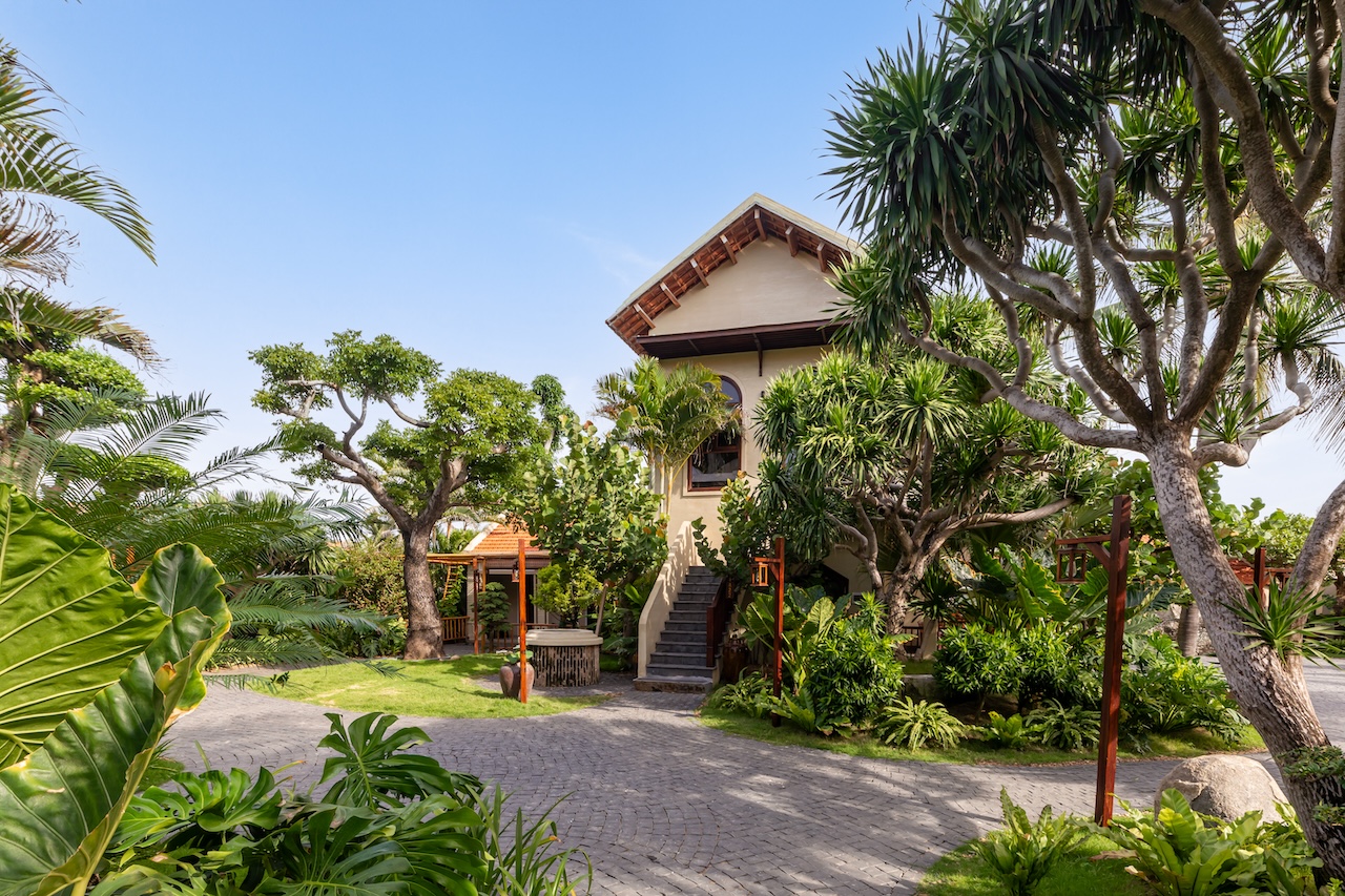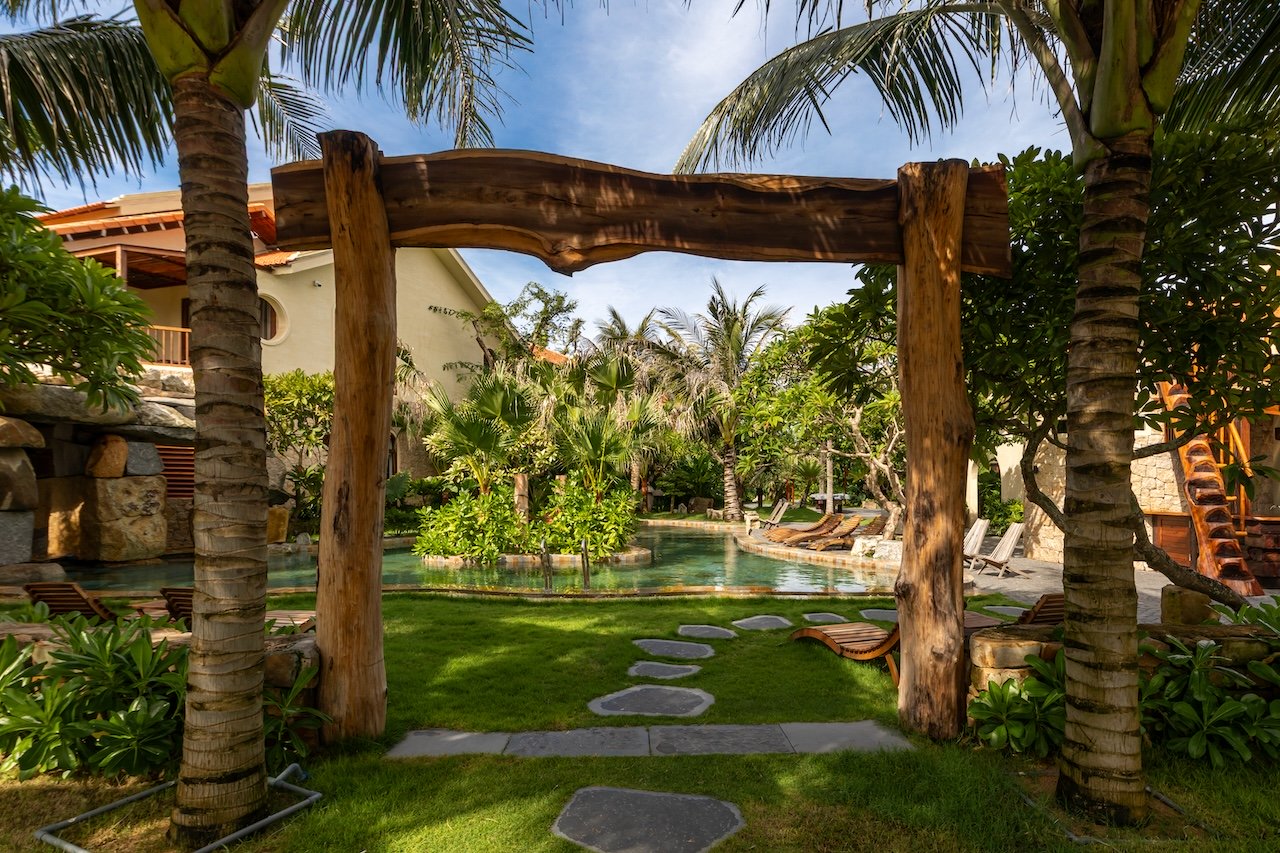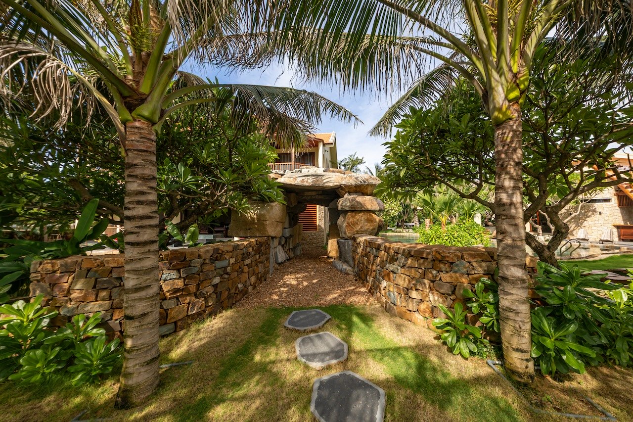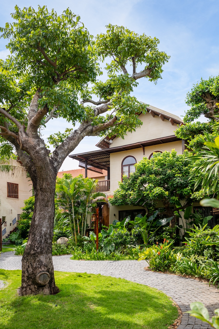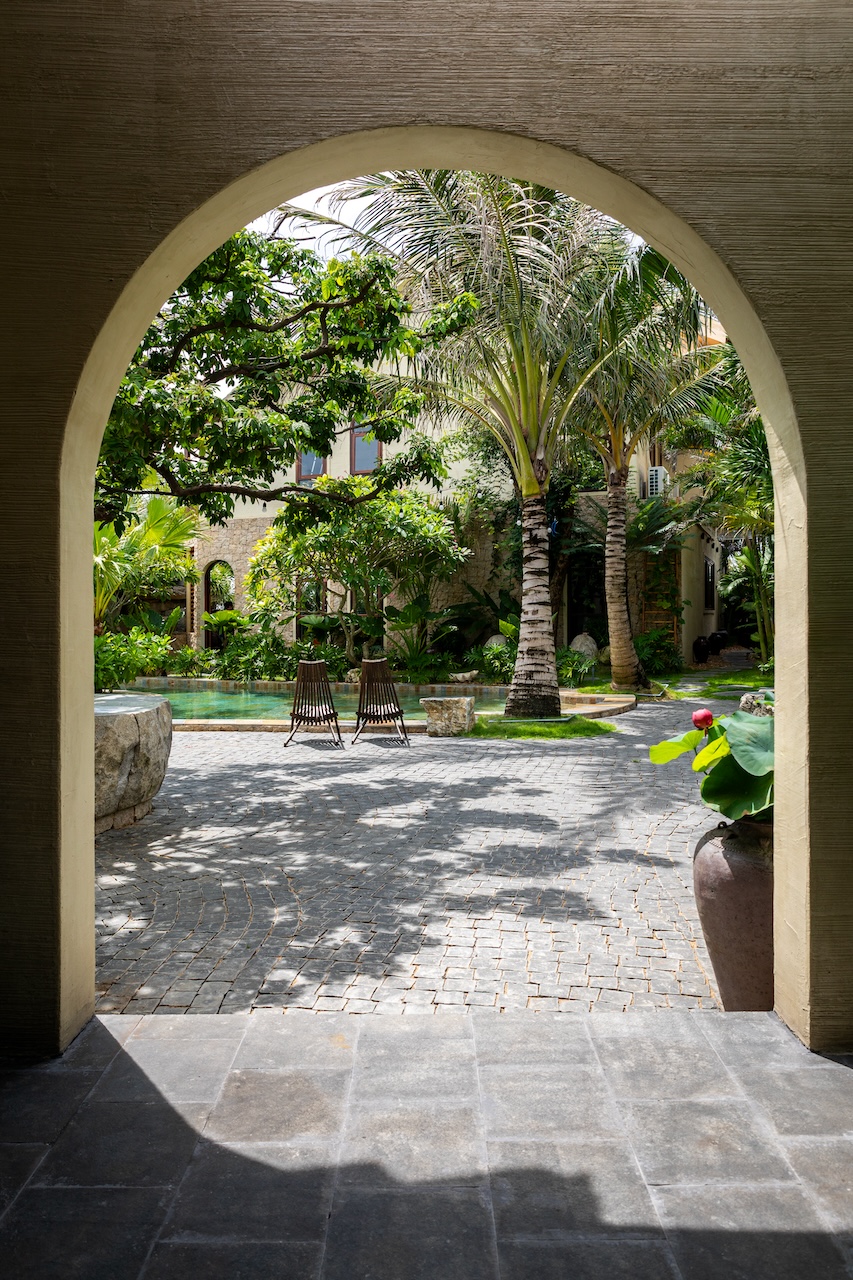 Từ vùng đất bỏ hoang, khu vườn được phủ xanh trở lại bằng các loài cây bản địa như dừa, nhãn rừng, bàng biển, duối, phát tài núi… tạo nên hệ sinh thái xanh gắn kết con người với thiên nhiên, đồng thời gợi lại ký ức thân thuộc của người con xa quê. Những hàng rào đá thấp được giữ nguyên như một biểu tượng của sự cởi mở, thân thiện và phóng khoáng của người dân miền biển.