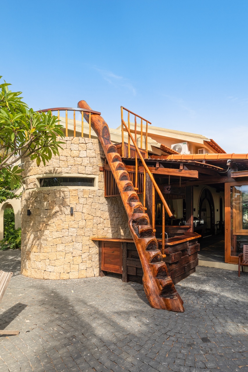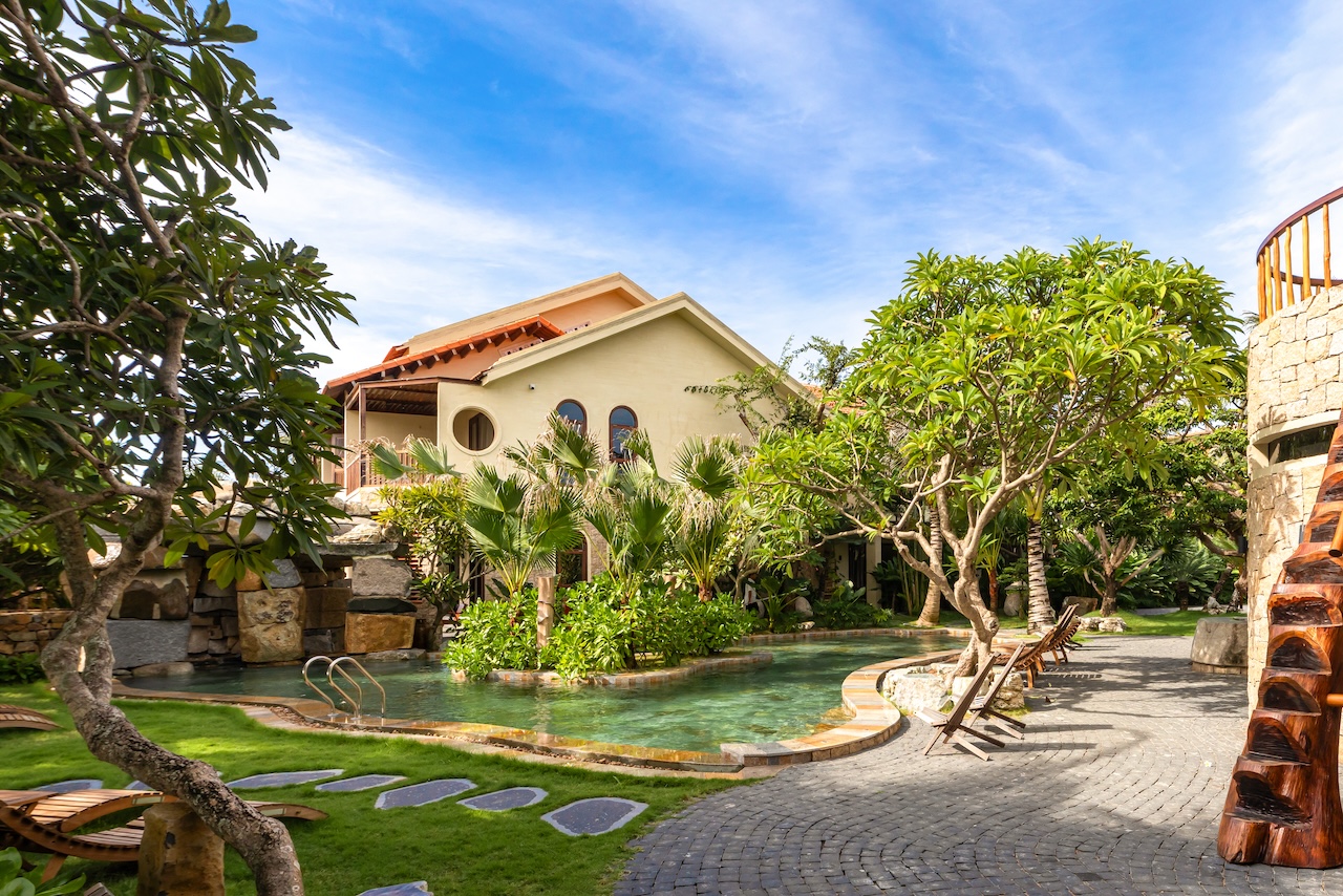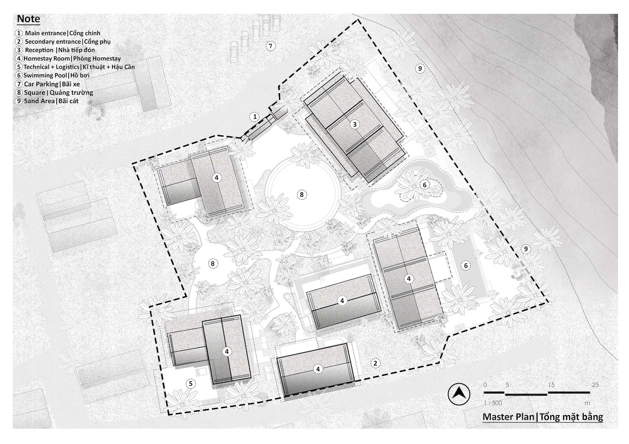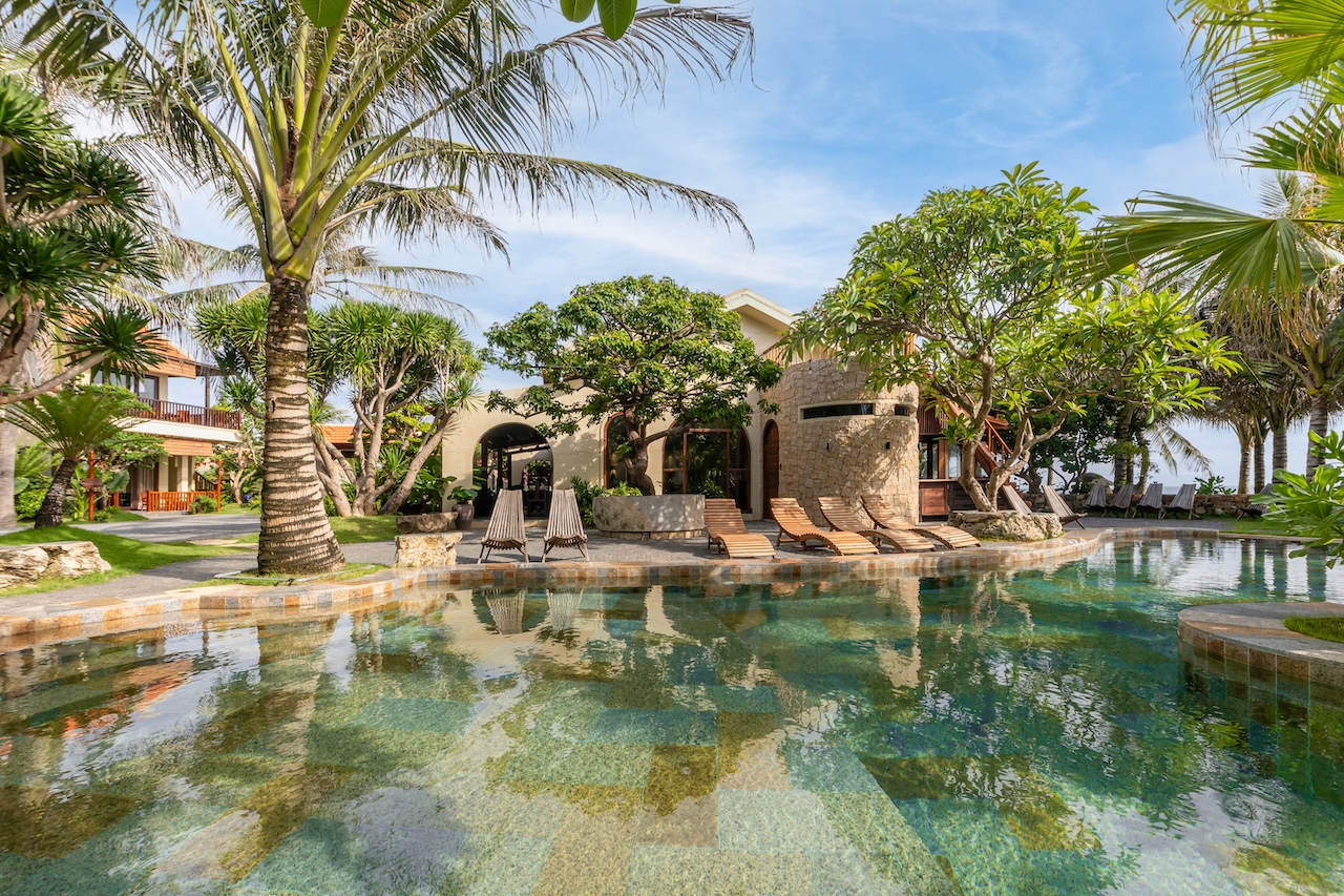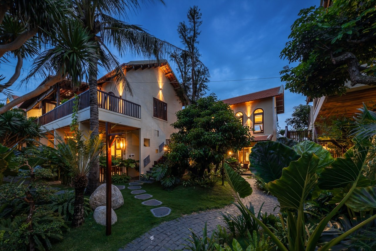Từ vùng đất bỏ hoang, khu vườn được phủ xanh trở lại bằng các loài cây bản địa như dừa, nhãn rừng, bàng biển, duối, phát tài núi… tạo nên hệ sinh thái xanh gắn kết con người với thiên nhiên, đồng thời gợi lại ký ức thân thuộc của người con xa quê. Những hàng rào đá thấp được giữ nguyên như một biểu tượng của sự cởi mở, thân thiện và phóng khoáng của người dân miền biển.