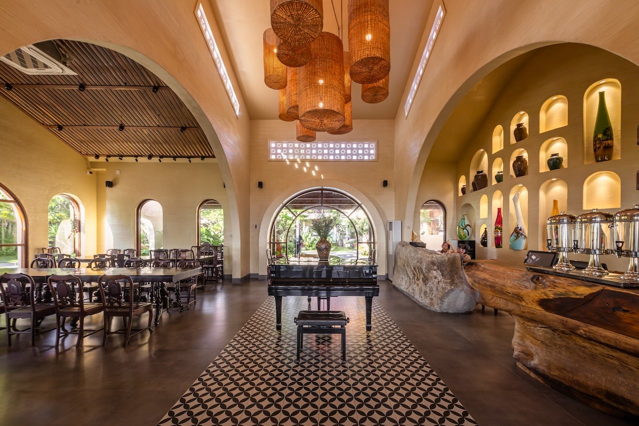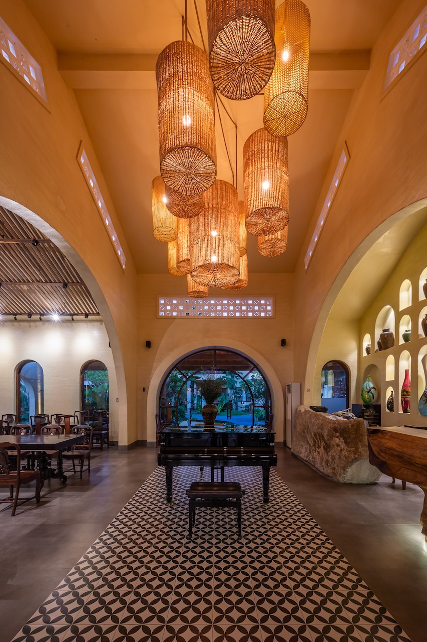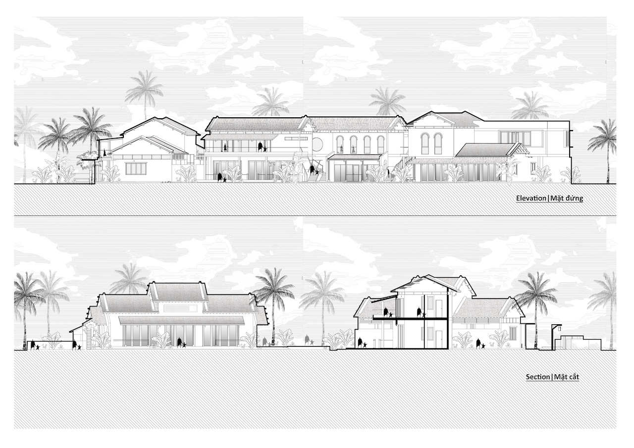 Hệ mái ngói đất nung – một biểu tượng kiến trúc địa phương – được giữ nguyên nhưng cải tiến để phù hợp với khí hậu miền Trung đầy gió bão. Từng viên ngói được tăng gờ liên kết, tạo độ khít chặt, đồng thời thiết kế hai lớp mái giúp cách nhiệt và chống thấm hiệu quả. Xen giữa các không gian là những khoảng sân, giếng trời và khu trưng bày nhỏ – nơi kể lại câu chuyện của gốm Quảng Đức, dòng gốm truyền thống nổi tiếng của Phú Yên đã thất truyền hơn 300 năm, từng góp phần định hình văn hóa và đời sống vùng đất này, tương tự như gốm Bàu Trúc (Ninh Thuận) hay gốm Thanh Hà (Quảng Nam).