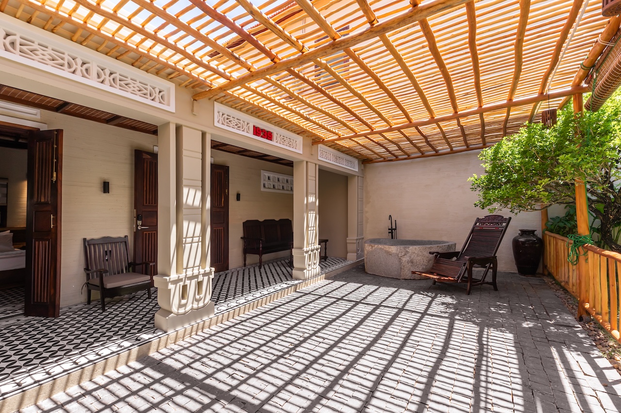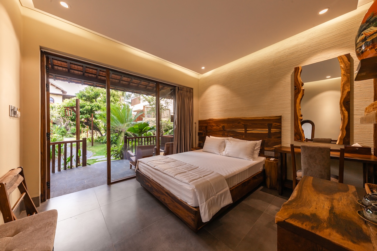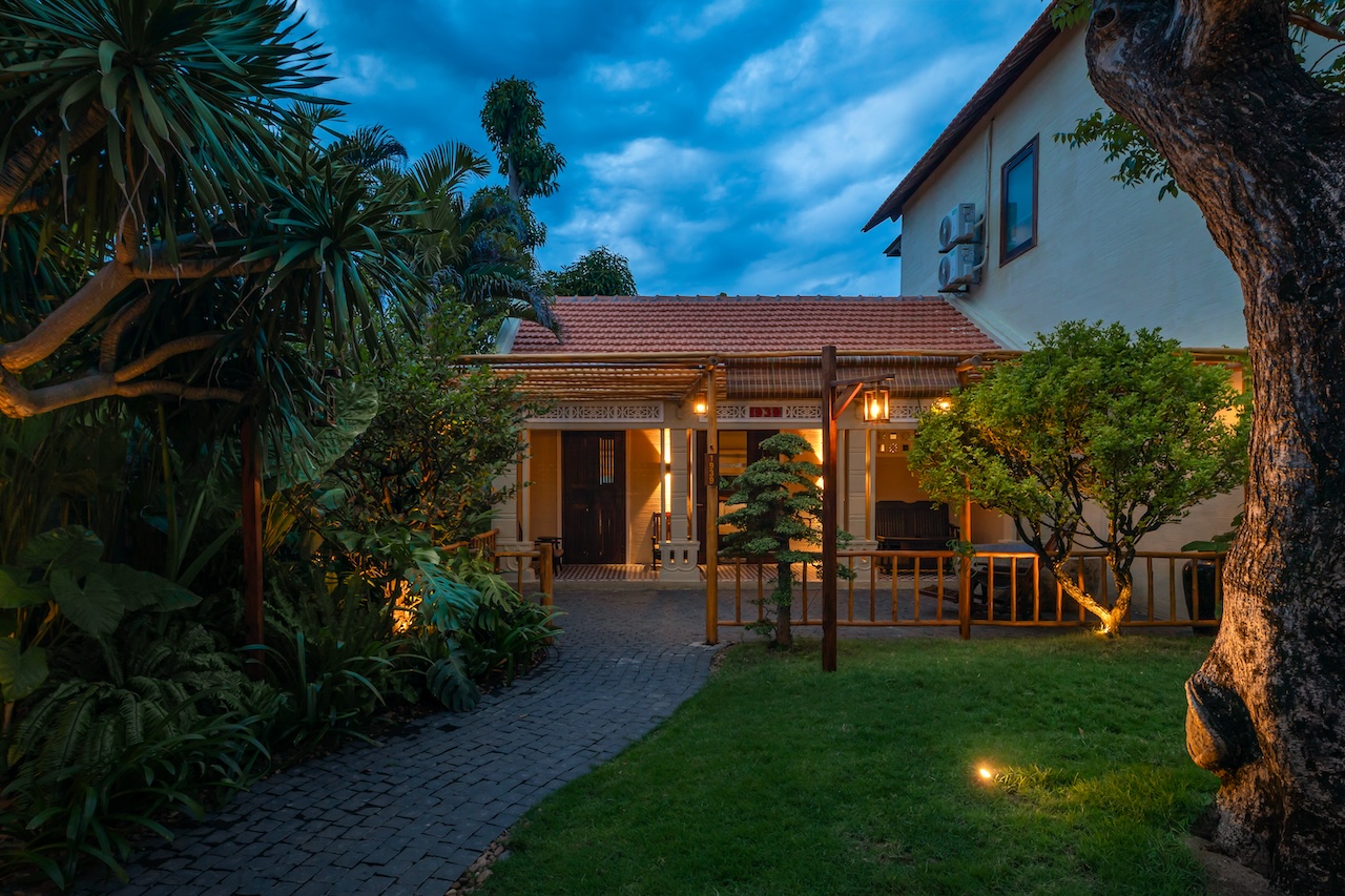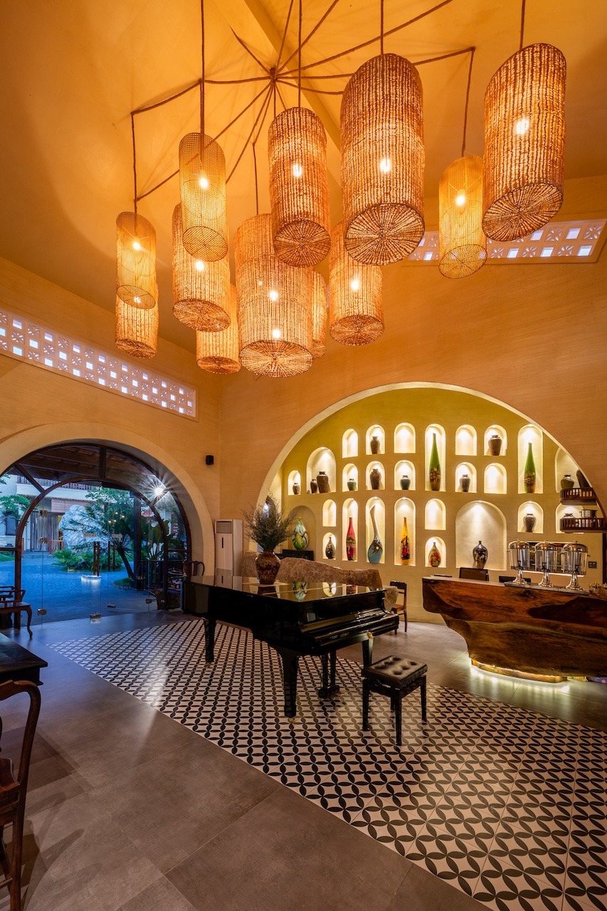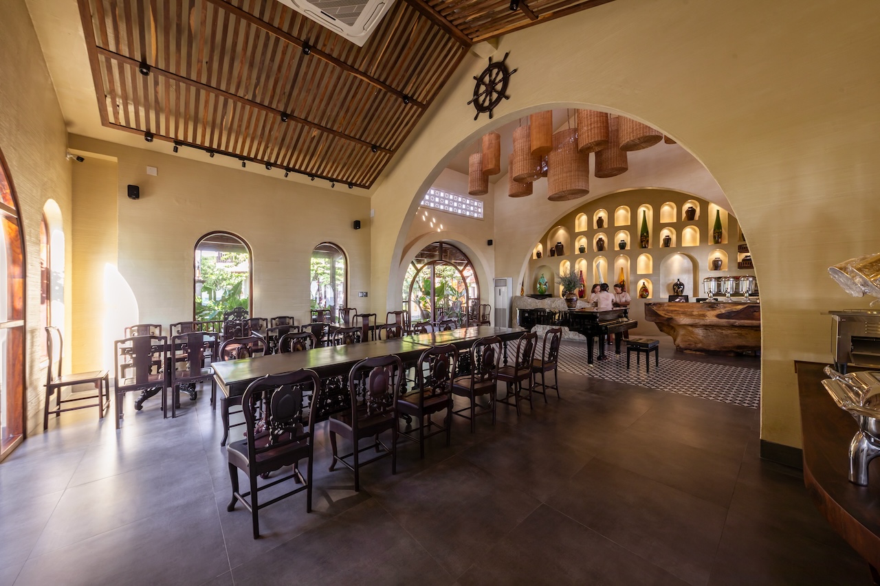 Những ngôi nhà cũ được bảo tồn, trùng tu và cải tạo với tinh thần “tái sinh trong tiếp nối”. Kiến trúc hiện đại được hòa vào nét truyền thống thông qua vật liệu và kỹ thuật bản địa. Nền sân, đường dạo không bị bê tông hóa mà được lát bằng đá bazan chẻ tay – loại đá đặc trưng của vùng đất này, vừa thô mộc vừa thân thiện với môi trường. Tường được trát bằng đất sét tự nhiên, cửa và nội thất hoàn toàn không sử dụng kim loại, mà làm từ gỗ muồng và gỗ tà vẹt – loại gỗ tái chế từ đường ray xe lửa cũ, mang đến độ bền chắc và gợi lại ký ức xưa cũ.