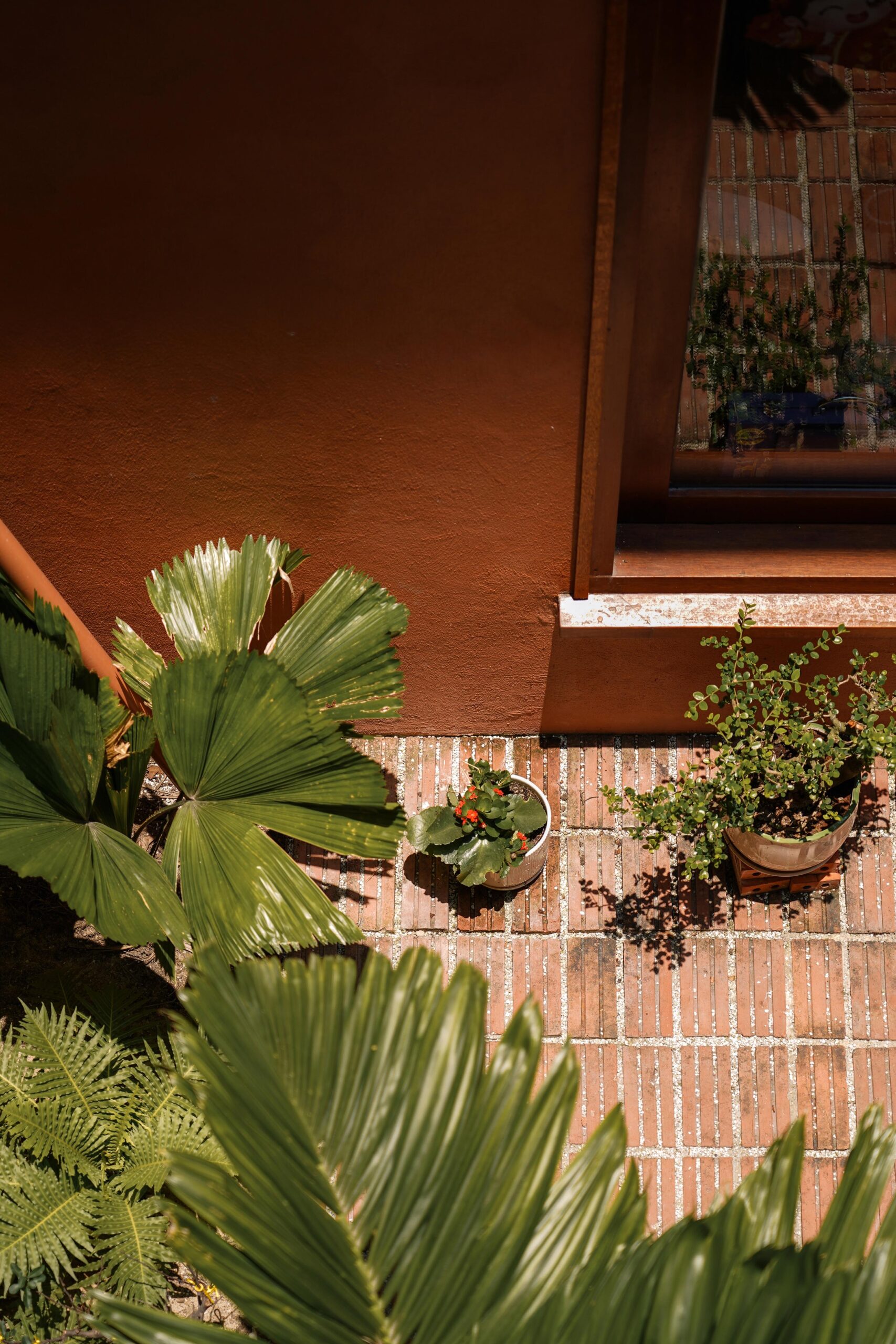 Nằm ở phía trước khu đất, ngôi nhà của cha mẹ mở ra với một khu vườn nhỏ ngập ánh nắng – một khoảng dừng nhẹ để chuyển tiếp từ nhịp sống bên ngoài vào không gian riêng tư. Mặt tiền gạch với cách xây xiên và các ô cửa xoay tạo nên sự cân bằng tinh tế giữa kín đáo và cởi mở. Hệ mái che bằng tre và mái tôn màu đất nung không chỉ bảo vệ công trình khỏi khí hậu khắc nghiệt, mà còn già đi một cách tự nhiên, mang theo dấu vết của thời gian.