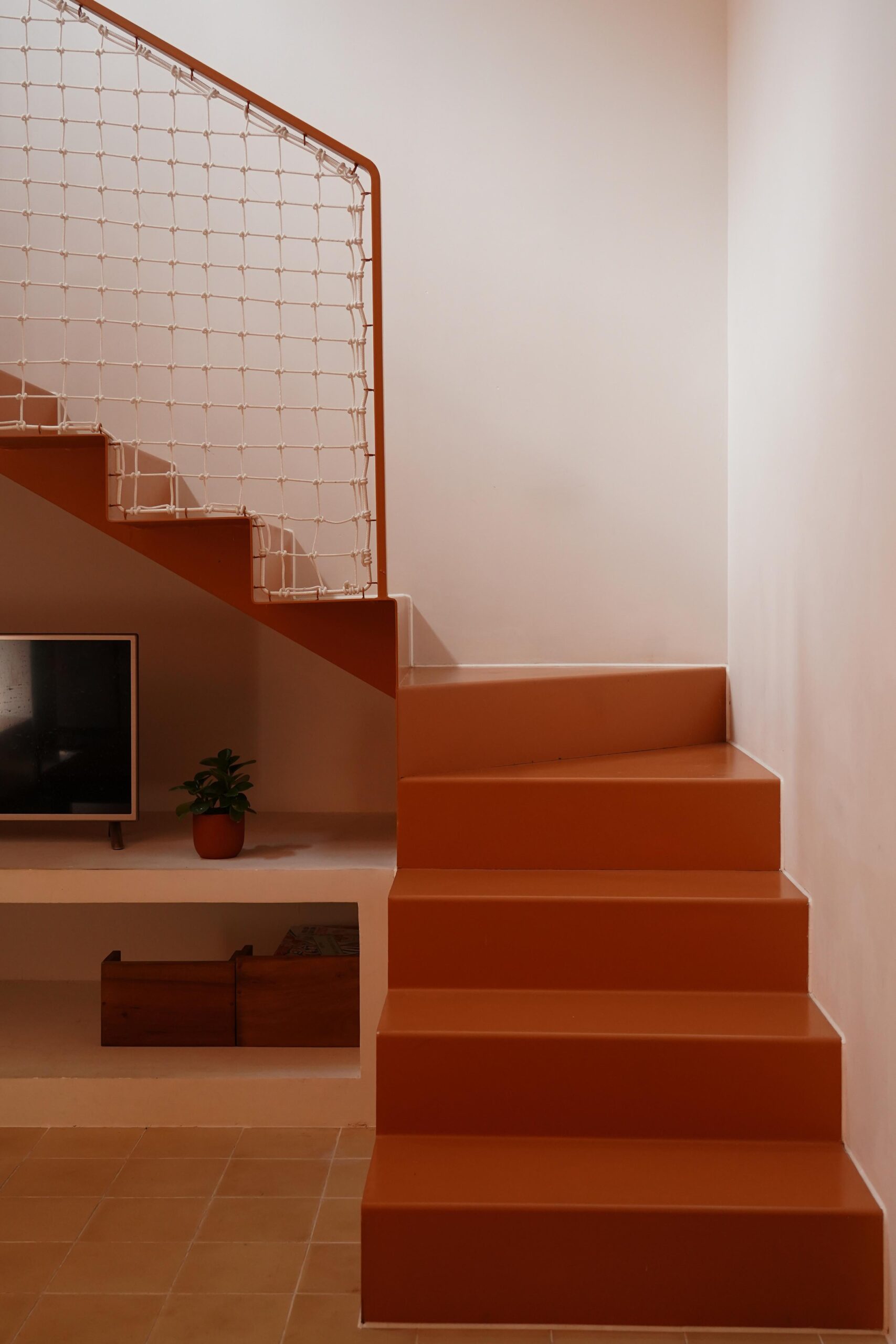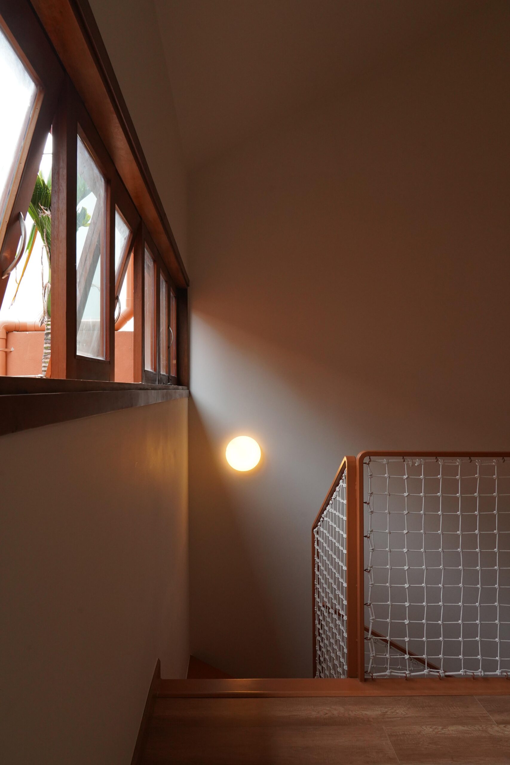 Tầng trệt bao gồm khu sinh hoạt – bếp kết hợp, một phòng ngủ nhỏ và phòng tắm, với hệ lưu trữ âm tường và nội thất đa năng cho phép không gian được tái cấu trúc linh hoạt theo nhu cầu. Một cầu thang thép mảnh, kết hợp lan can dây đan thủ công, dẫn lên một chiếu nghỉ nhỏ – nơi dành cho cầu nguyện, vui chơi hay đơn giản là một khoảnh khắc dừng chân.