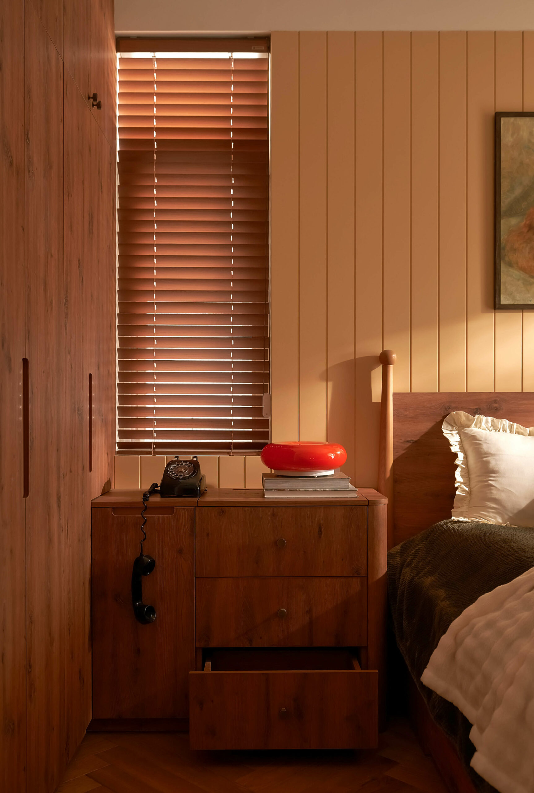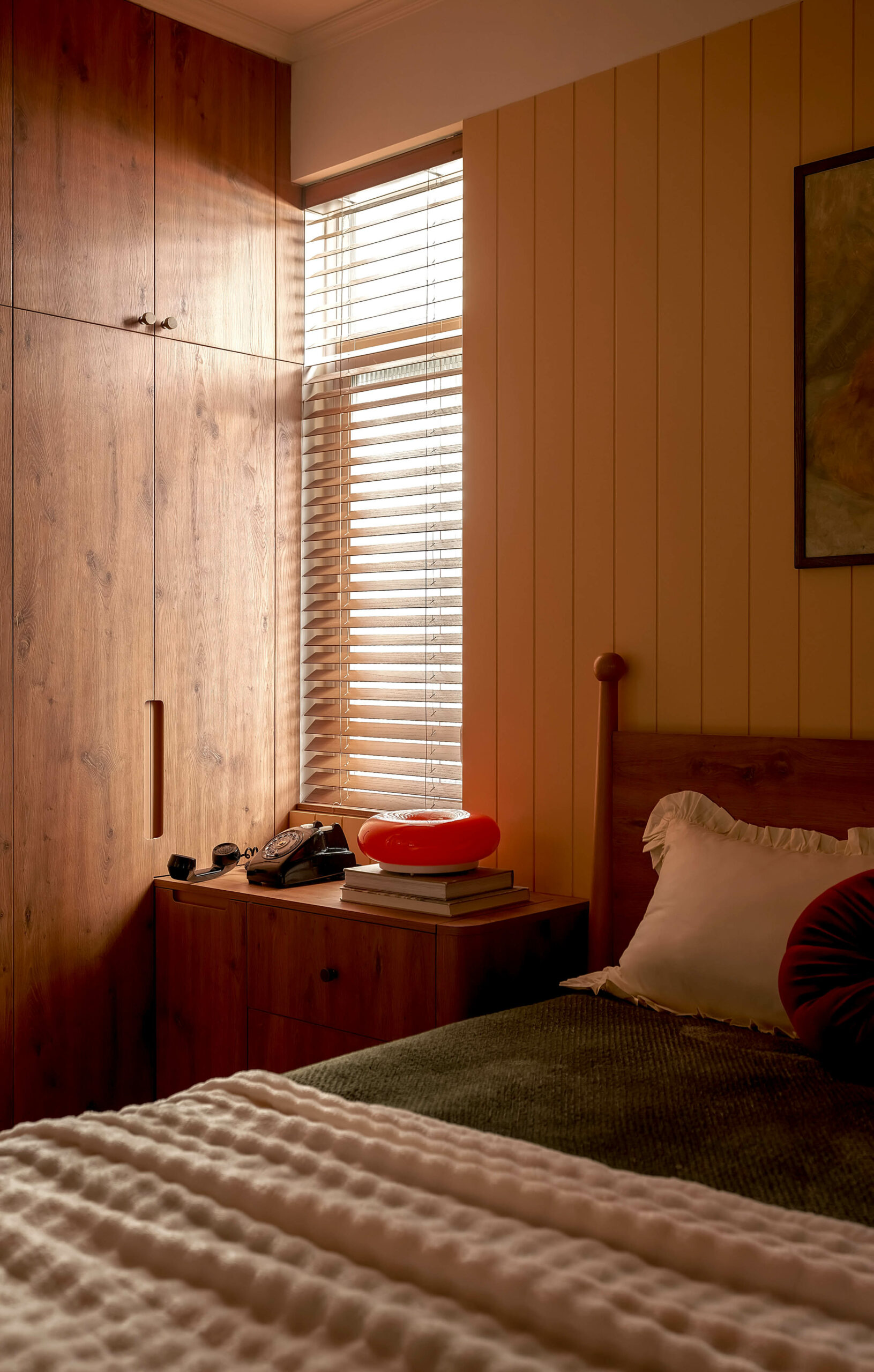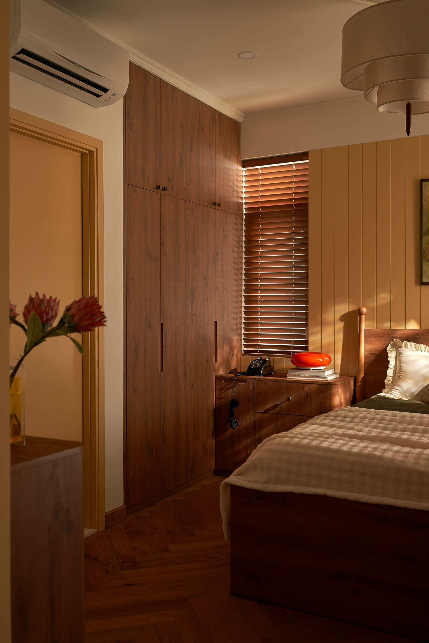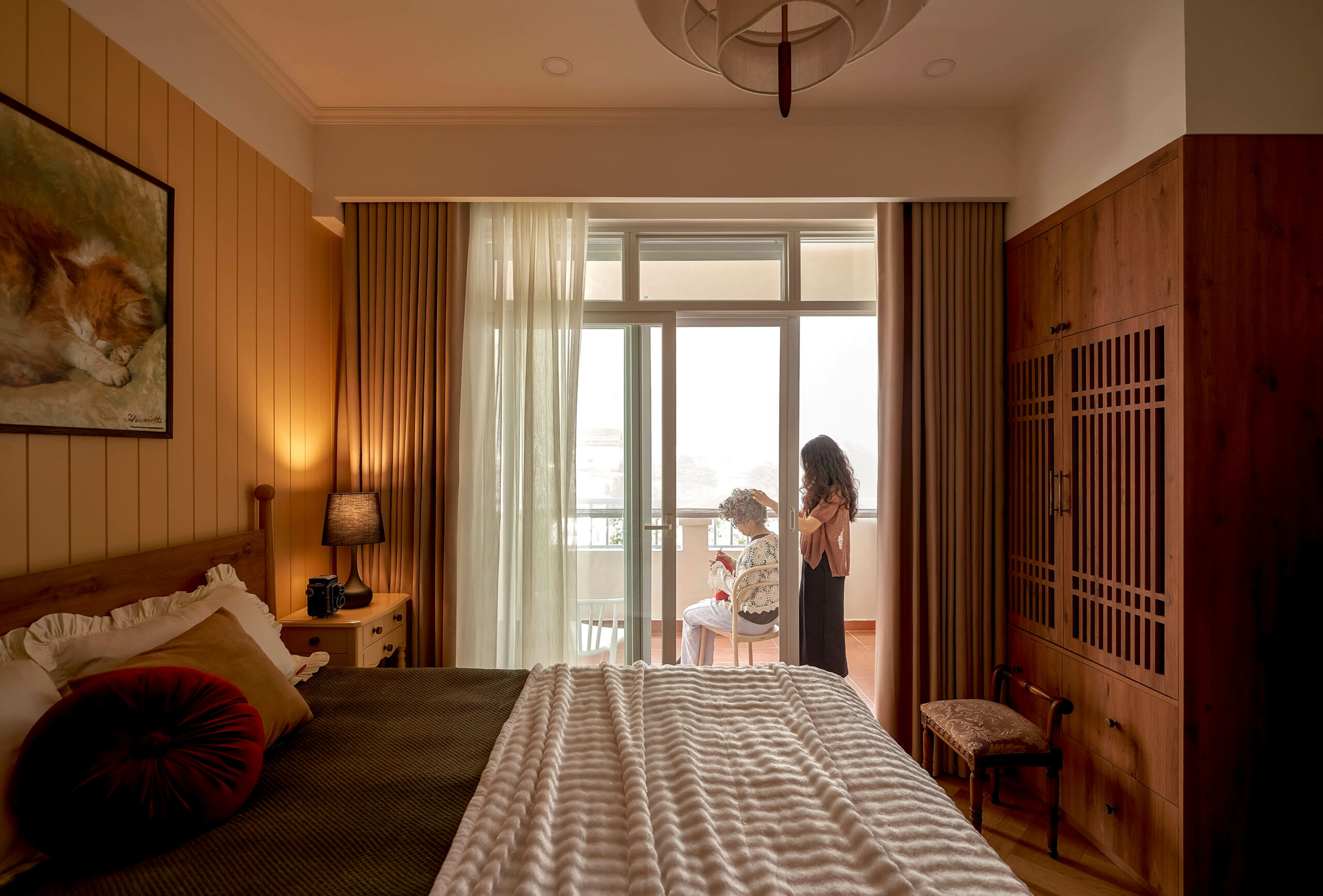 Phòng ngủ mẹ là trang sách mang nhiều dấu vết thời gian nhất. Chiếc tủ gỗ cũ được giữ lại, cùng những món đồ trang trí bên trong đã gắn bó suốt nhiều năm, như những nếp gấp quen thuộc nhắc nhớ về quá khứ. Không gian lặng lẽ gìn giữ ký ức, để người sống bên trong có thể sống chậm ở lại với những thói quen thân quen và những hồi ức đời thường.