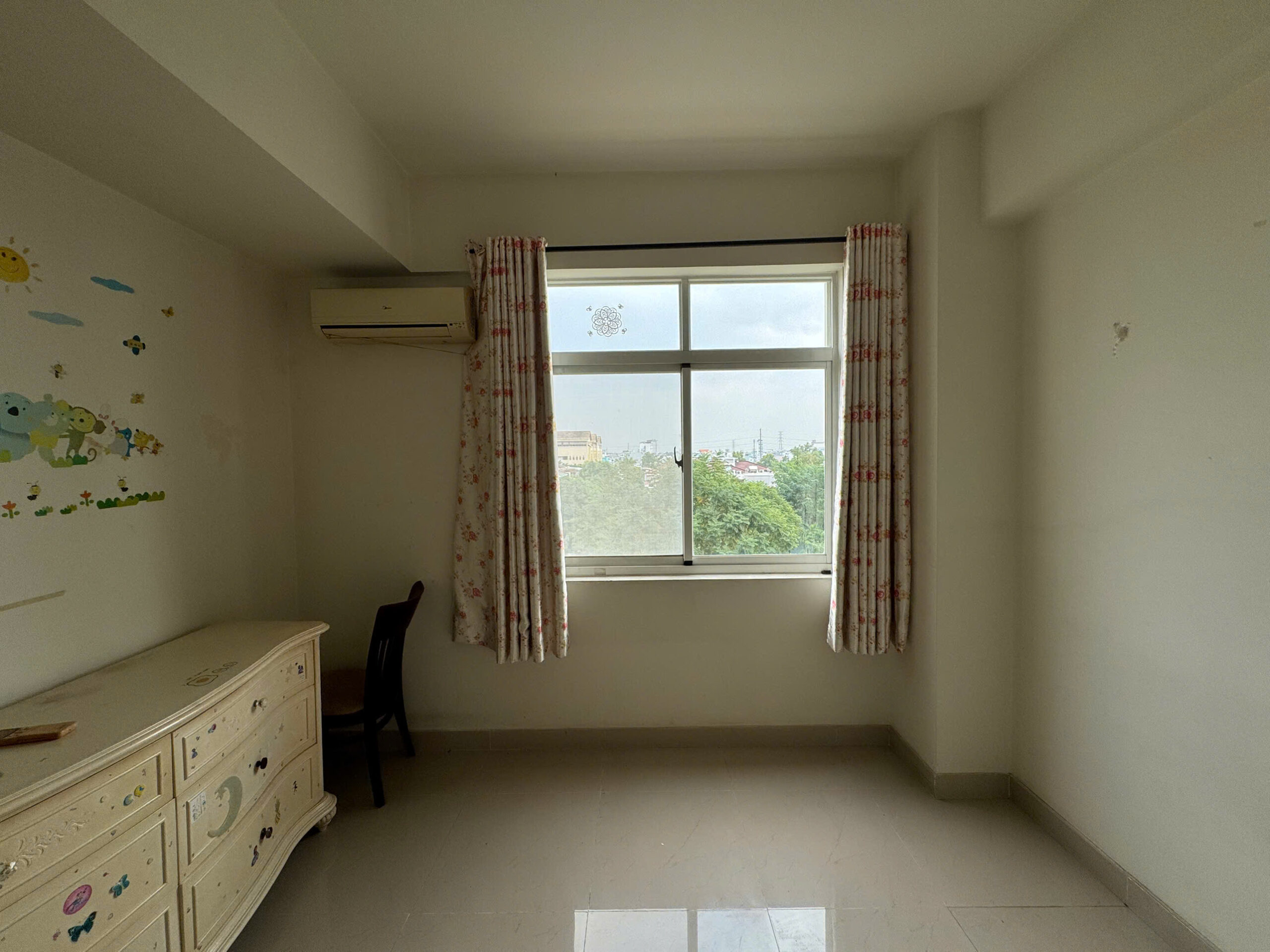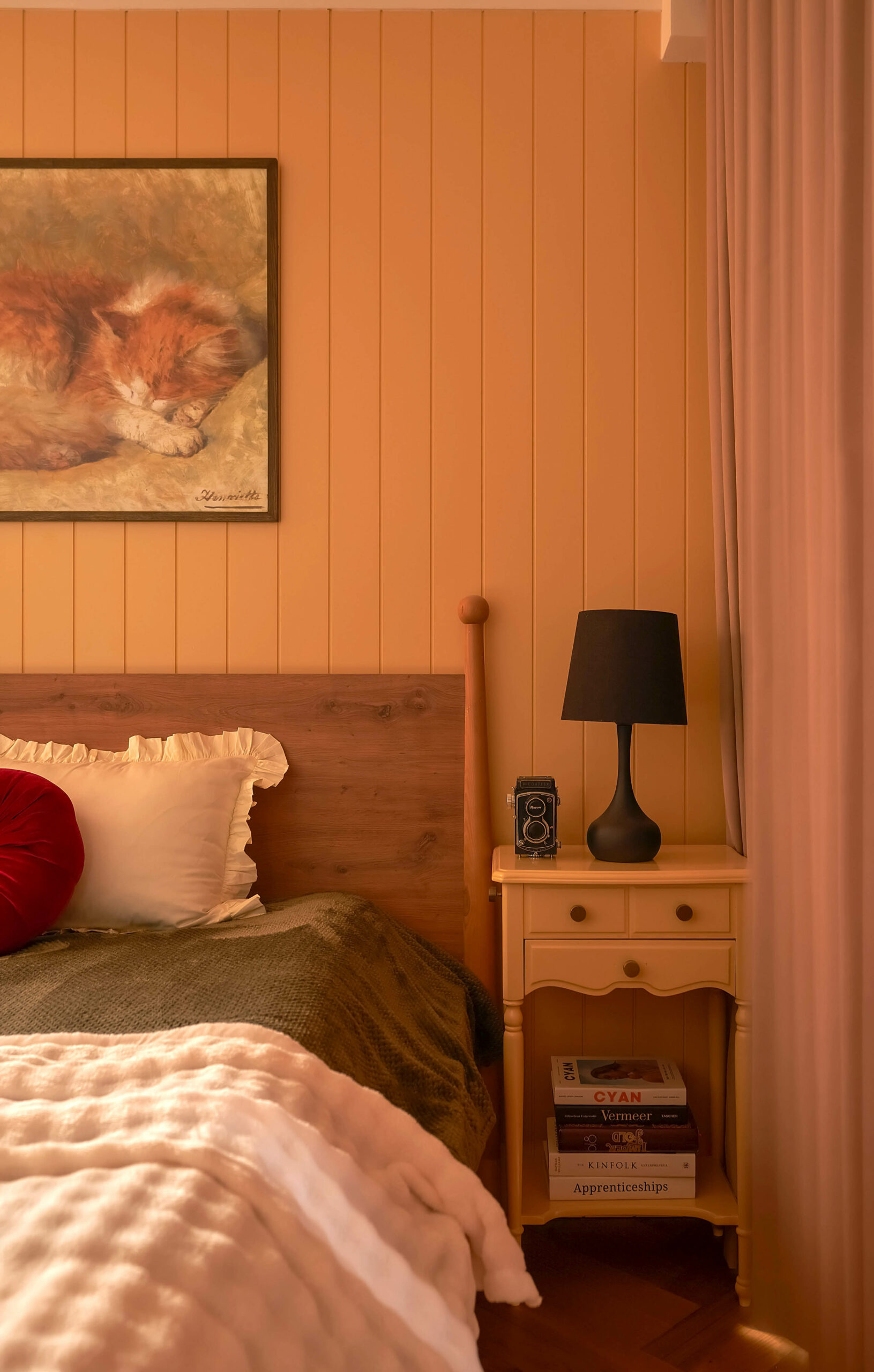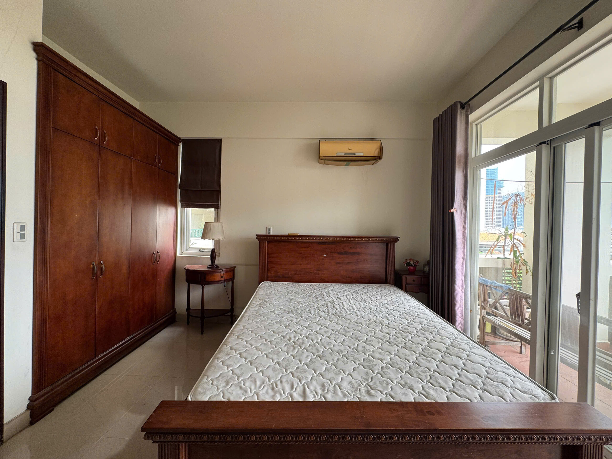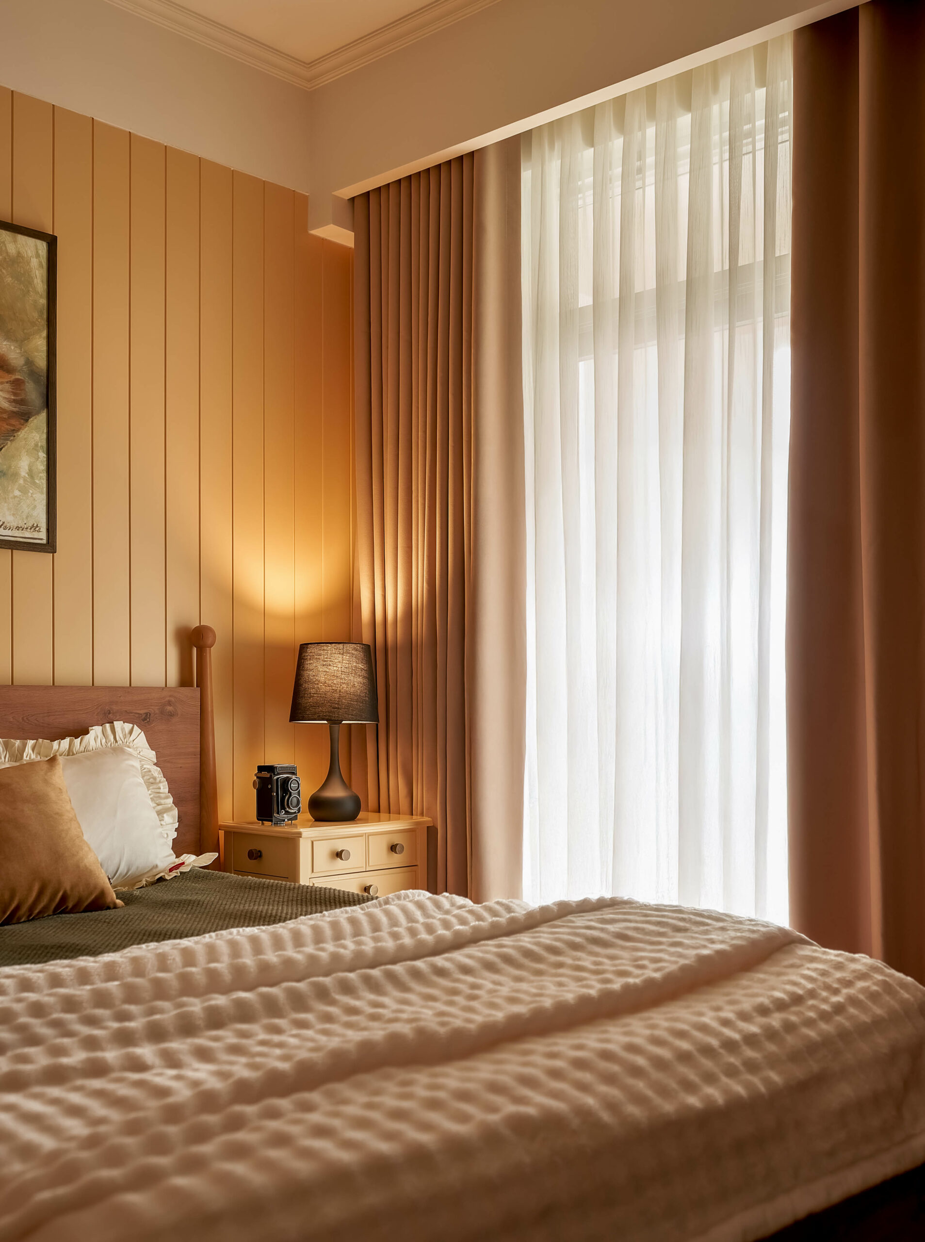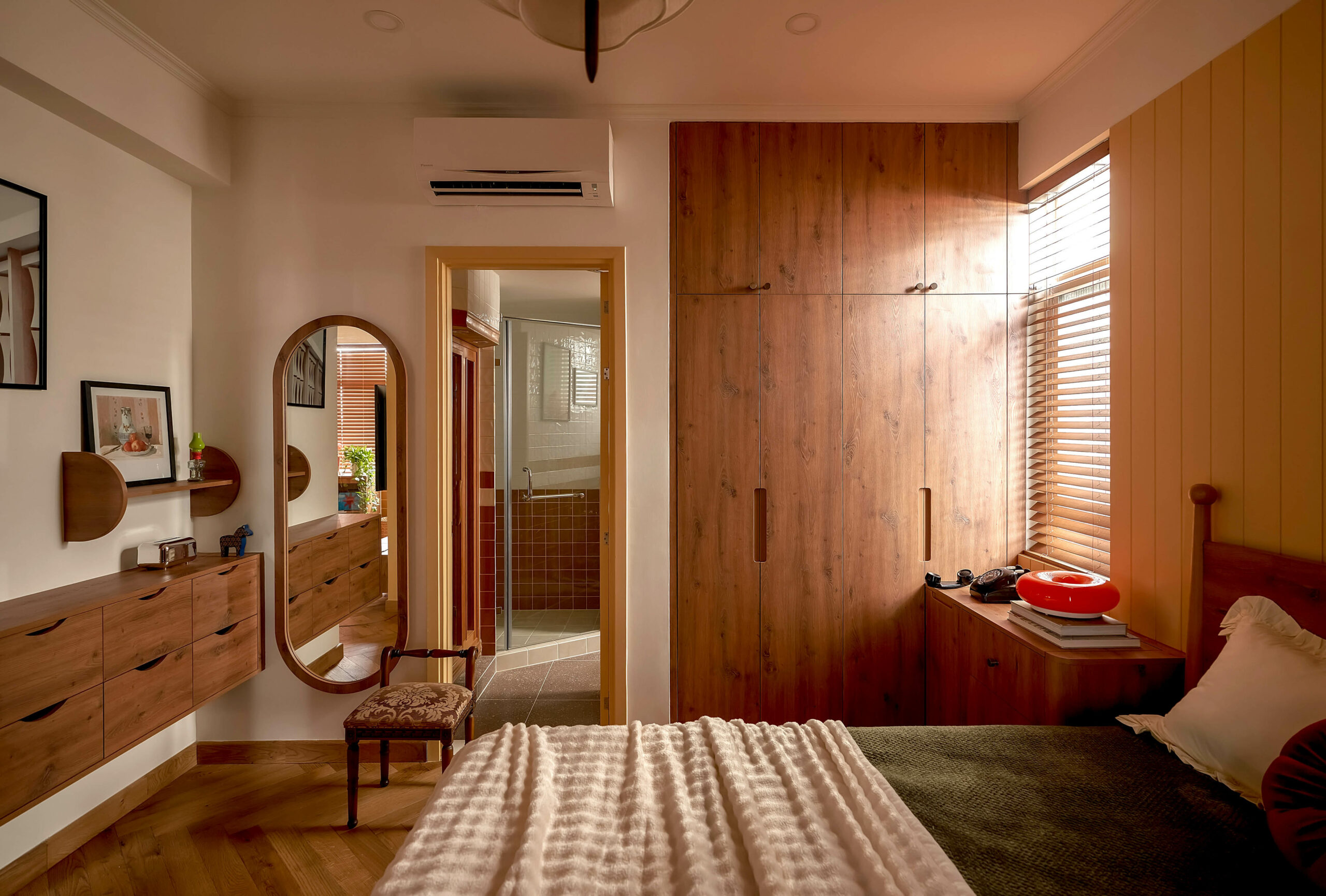 Phòng ngủ mẹ là trang sách mang nhiều dấu vết thời gian nhất. Chiếc tủ gỗ cũ được giữ lại, cùng những món đồ trang trí bên trong đã gắn bó suốt nhiều năm, như những nếp gấp quen thuộc nhắc nhớ về quá khứ. Không gian lặng lẽ gìn giữ ký ức, để người sống bên trong có thể sống chậm ở lại với những thói quen thân quen và những hồi ức đời thường.