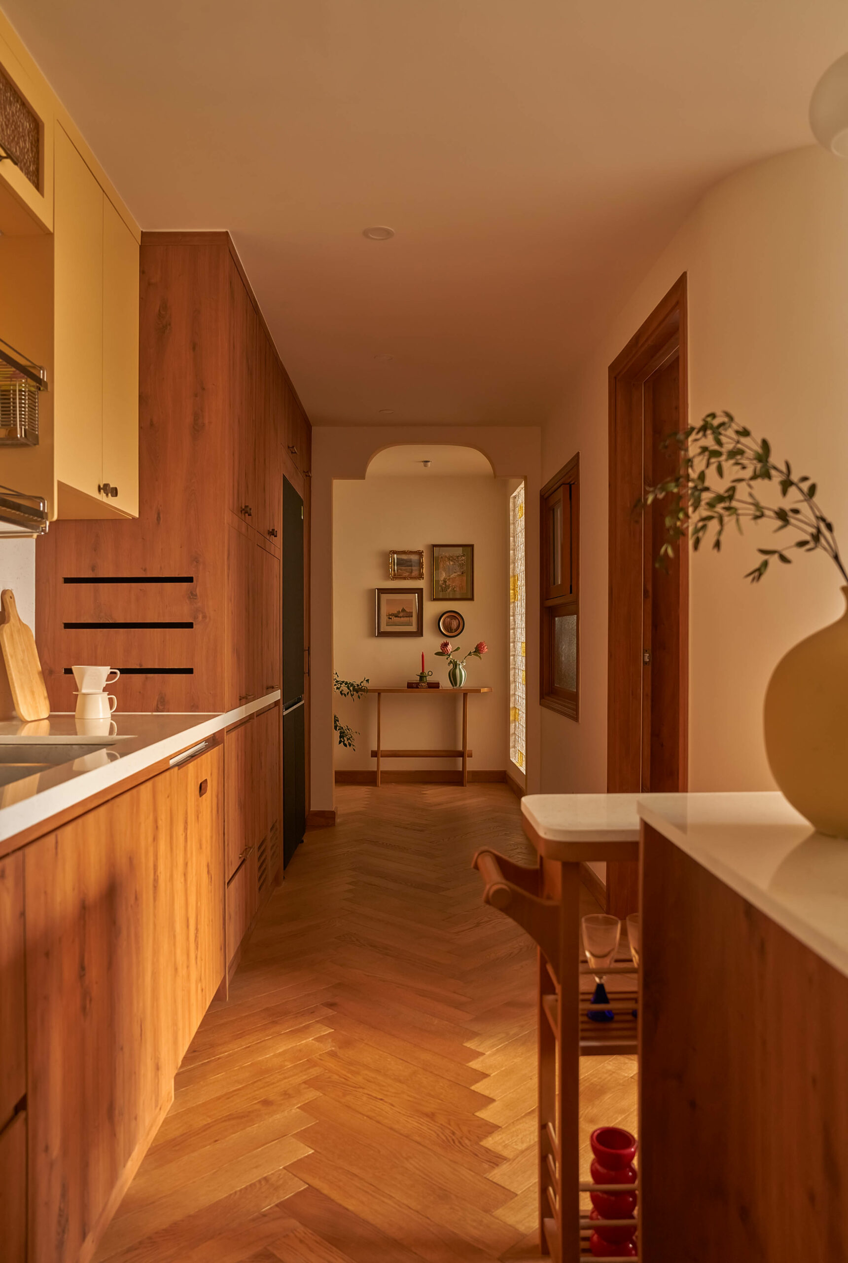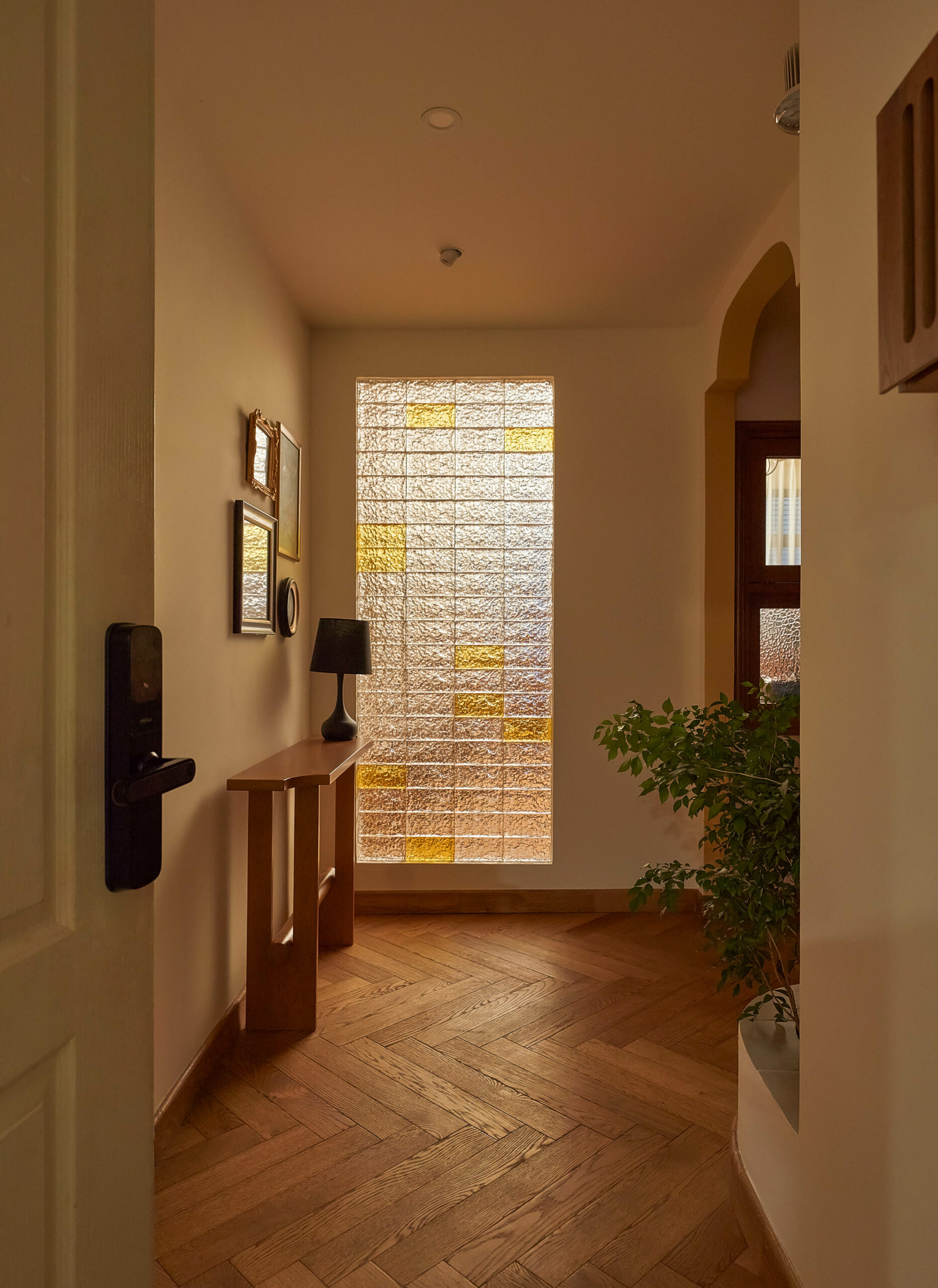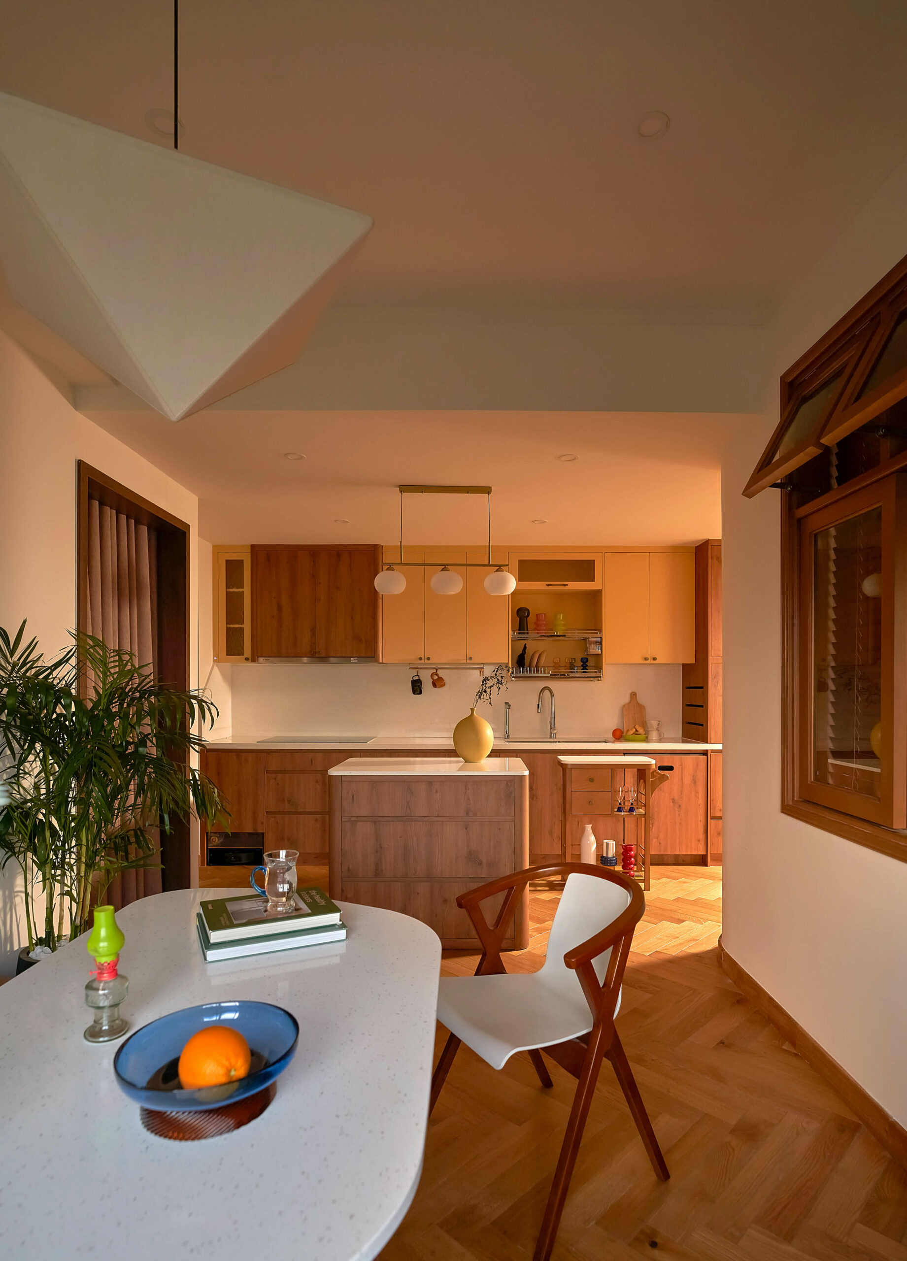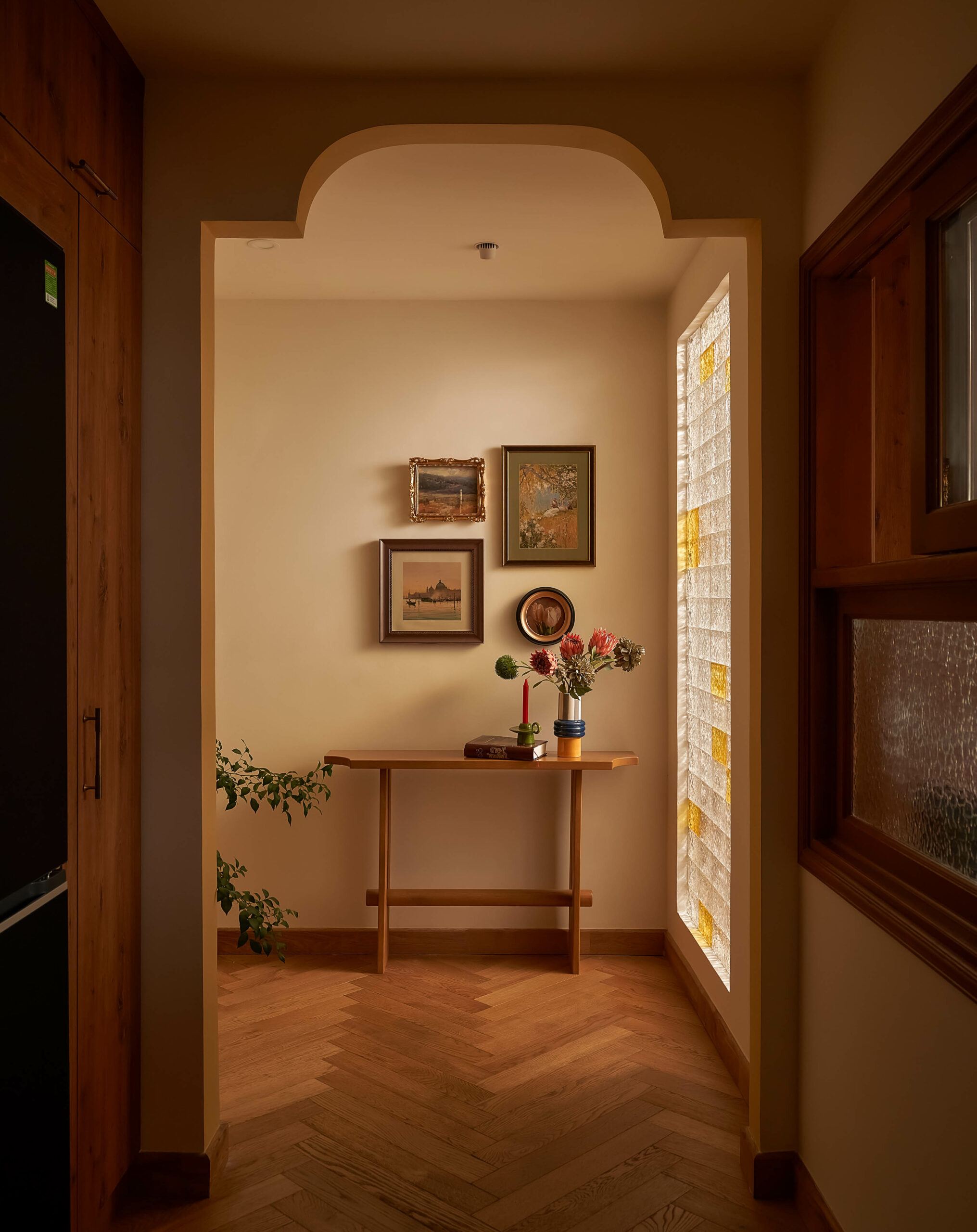 Ngay khi bước qua ngưỡng cửa, cuốn sách không gian được mở ra bằng một nhịp chậm. Ánh sáng len qua các lớp kính màu, rơi xuống nền gỗ xương cá và dẫn lối bằng những đường cong mềm mại. Bàn console nhỏ cùng các khung ảnh treo tường hiện diện như những dòng chữ đầu tiên, chưa trọn vẹn nhưng đủ gợi mở, nơi quá khứ và hiện tại bắt đầu đối thoại trong tinh thần Mid-Century Modern.