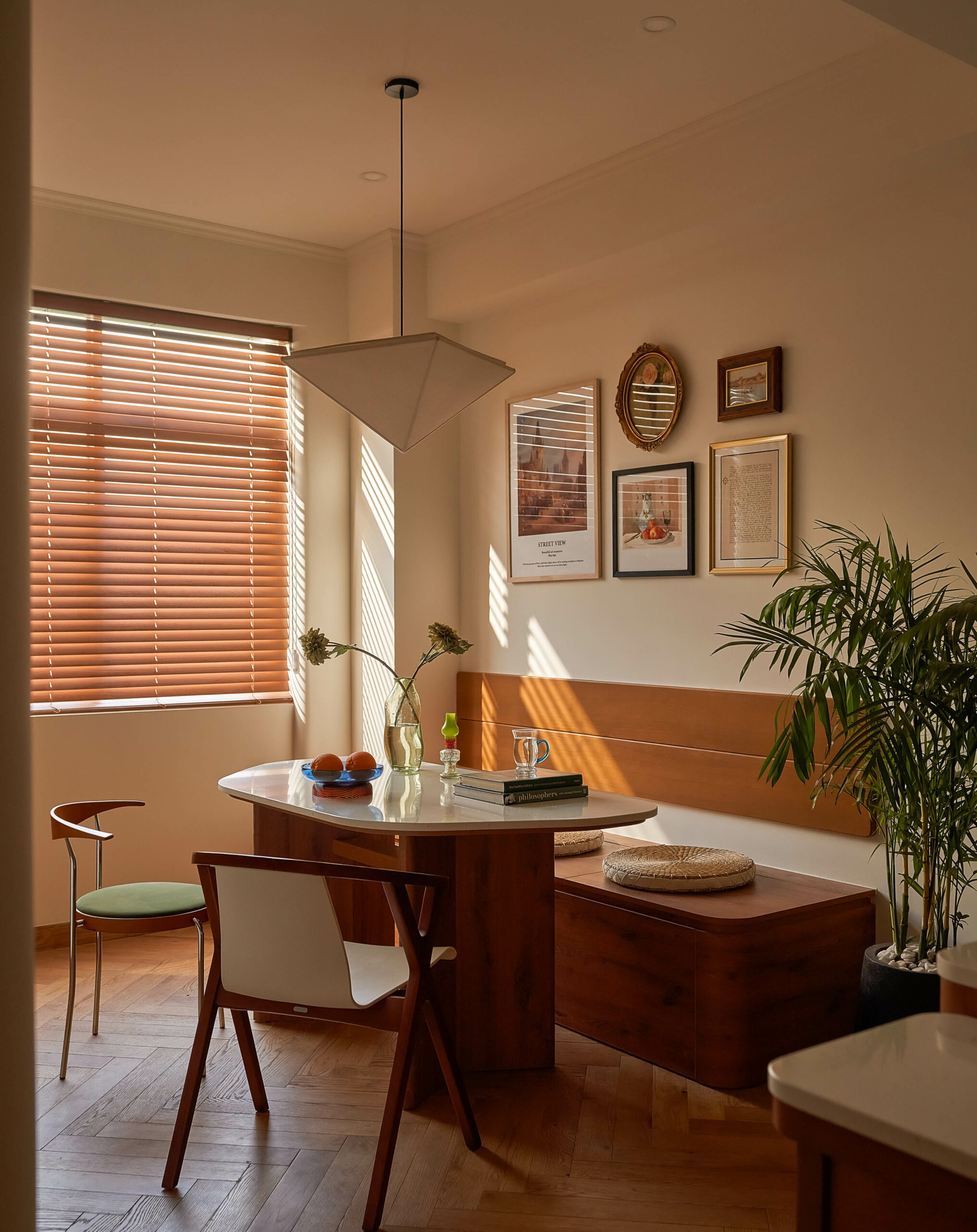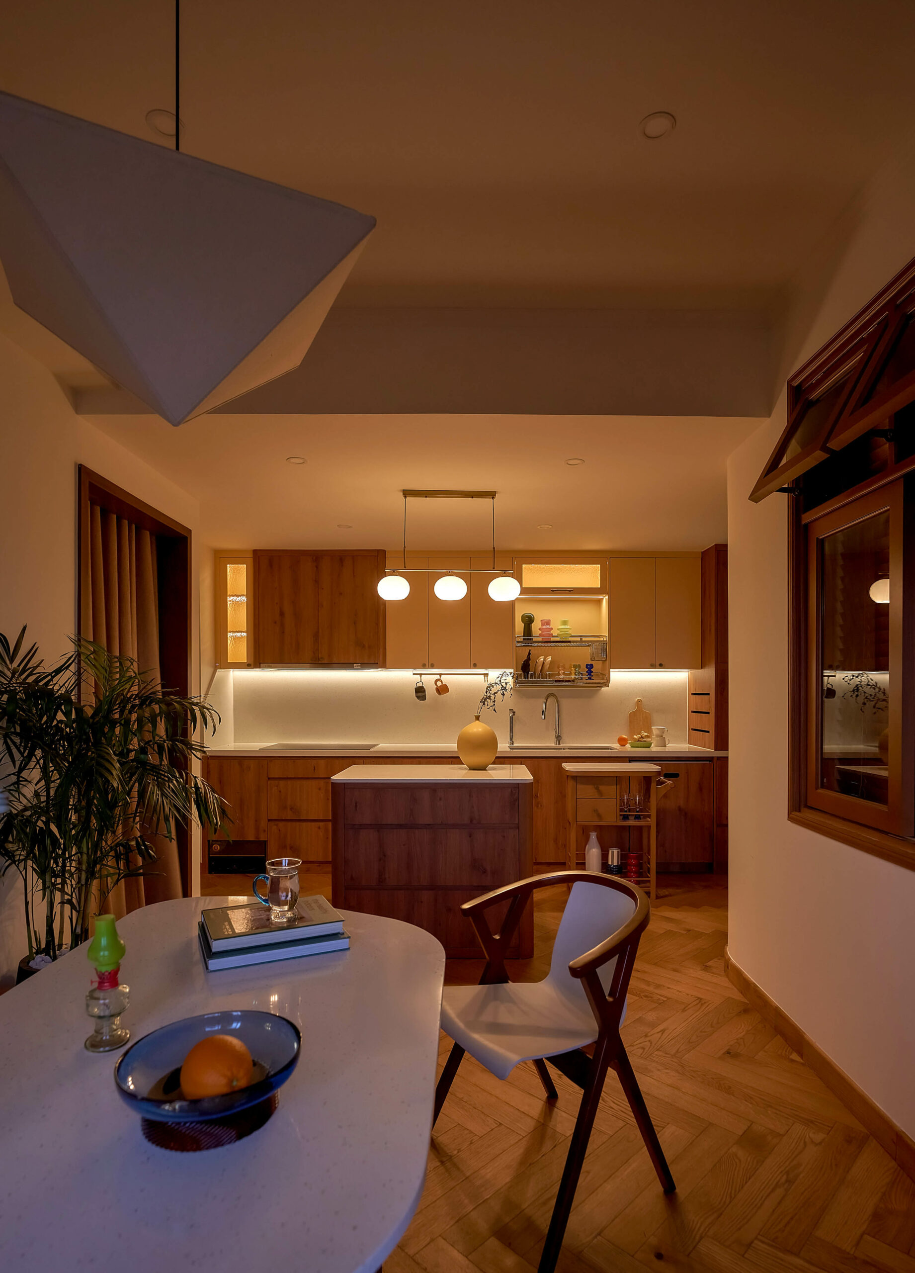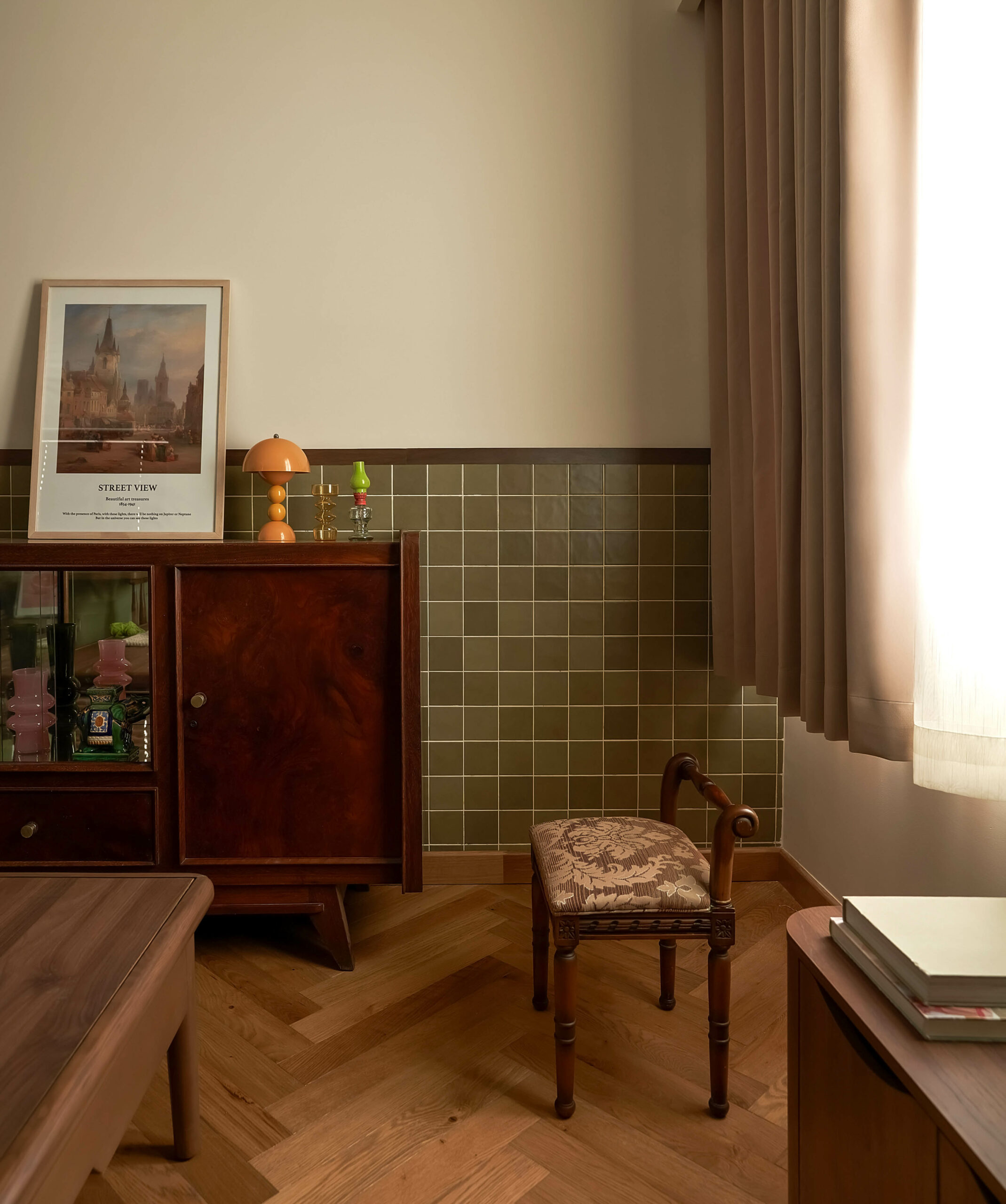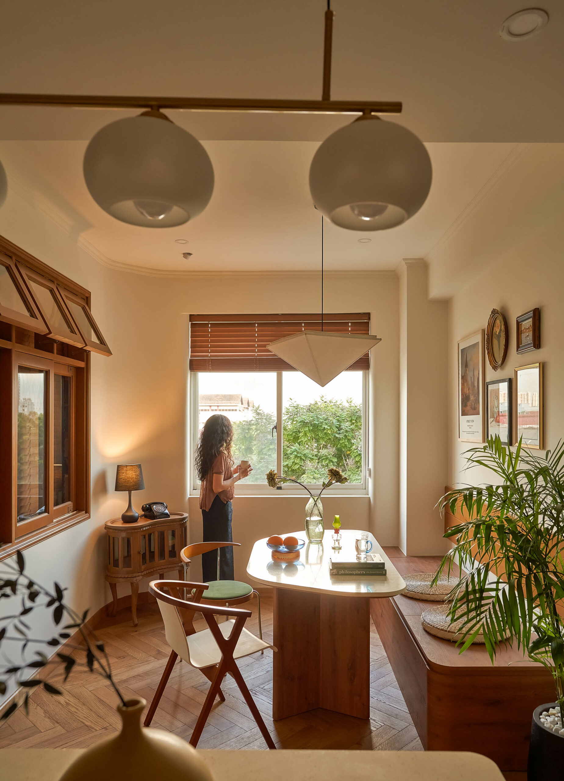 Ngay khi bước qua ngưỡng cửa, cuốn sách không gian được mở ra bằng một nhịp chậm. Ánh sáng len qua các lớp kính màu, rơi xuống nền gỗ xương cá và dẫn lối bằng những đường cong mềm mại. Bàn console nhỏ cùng các khung ảnh treo tường hiện diện như những dòng chữ đầu tiên, chưa trọn vẹn nhưng đủ gợi mở, nơi quá khứ và hiện tại bắt đầu đối thoại trong tinh thần Mid-Century Modern.