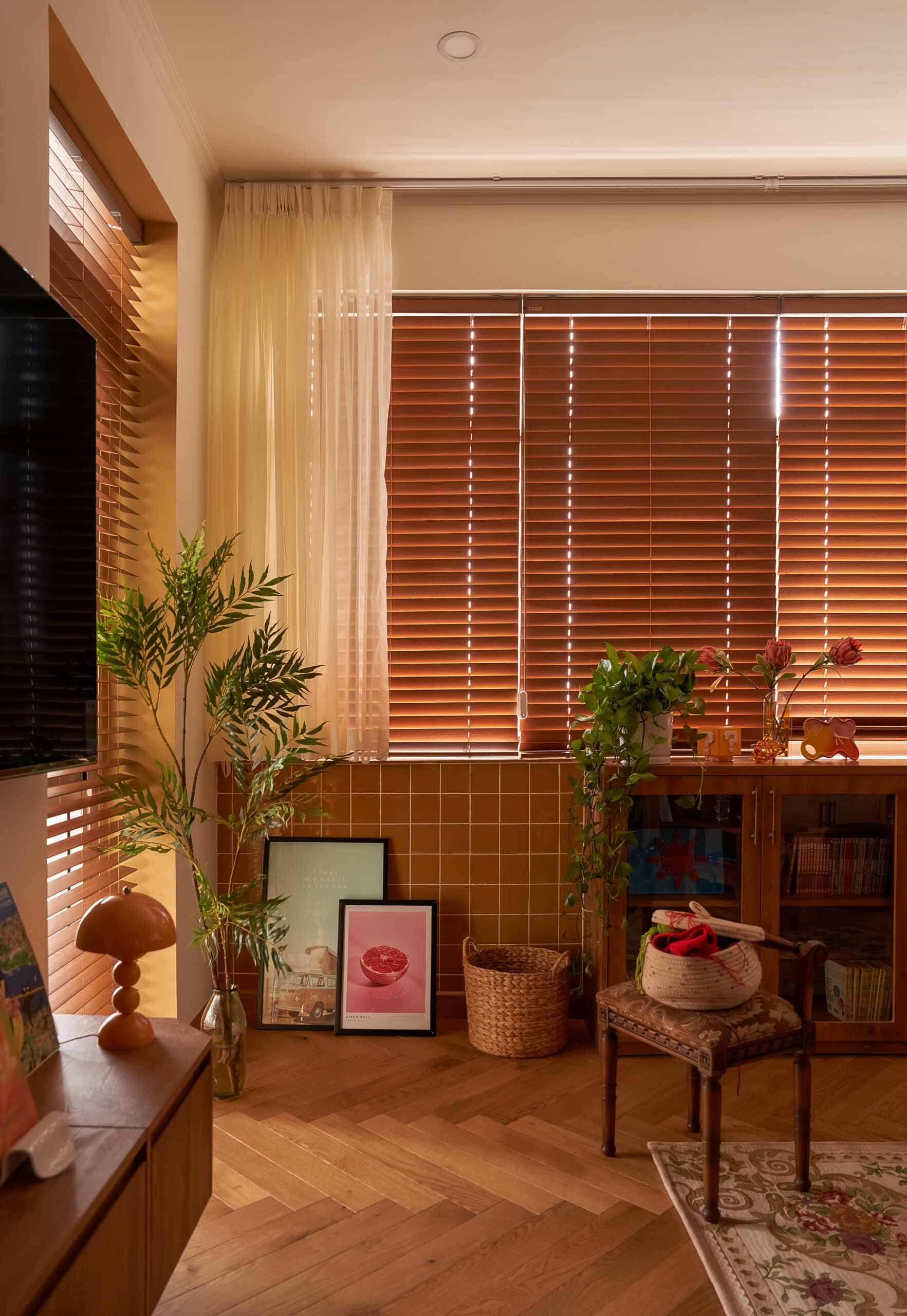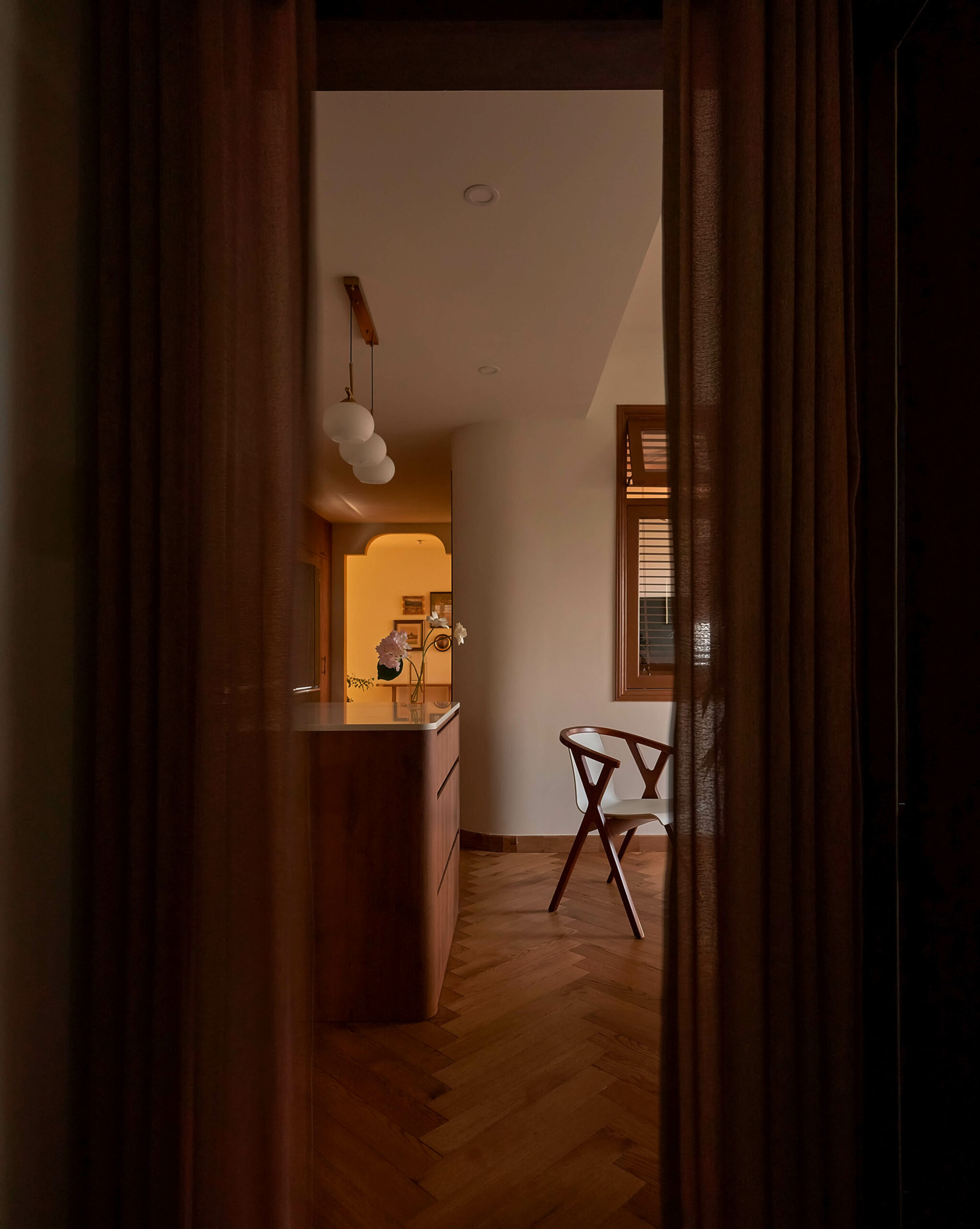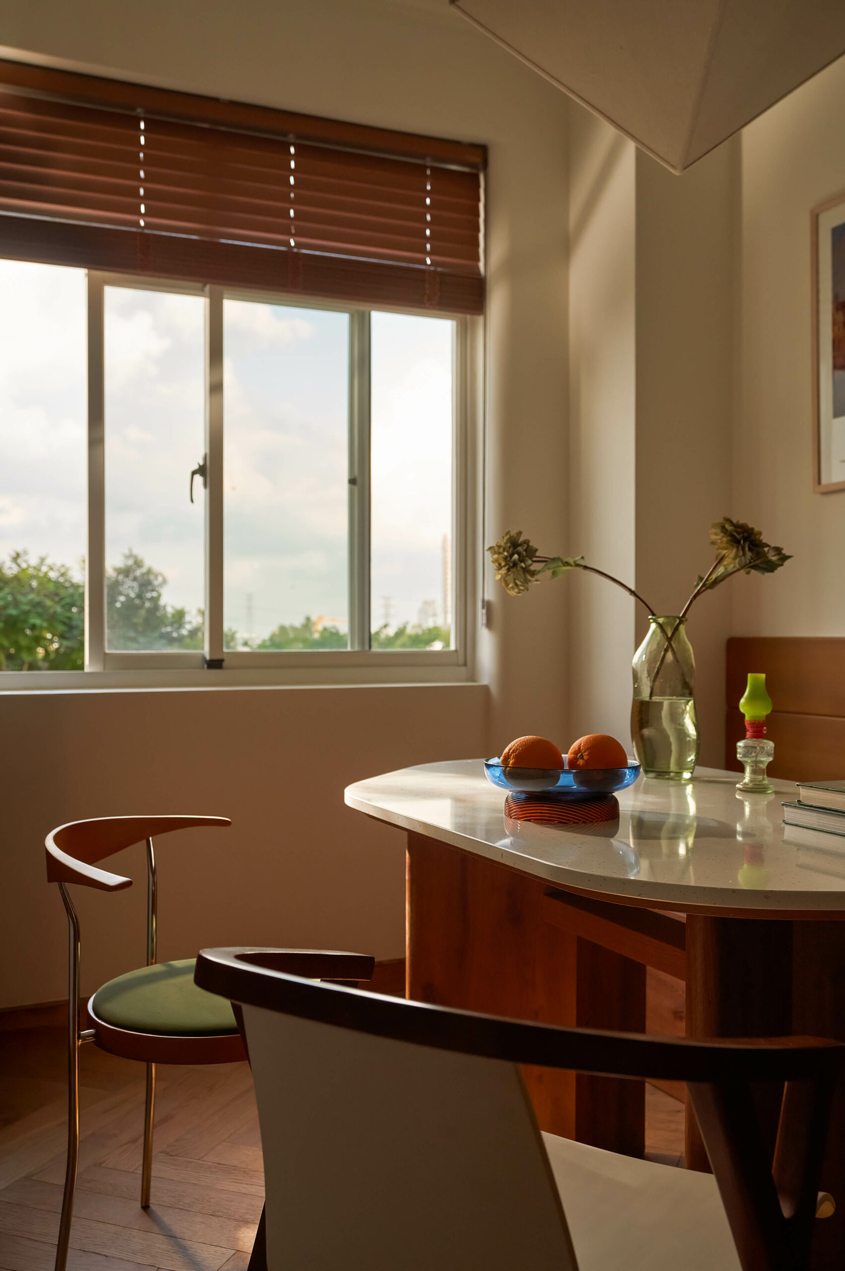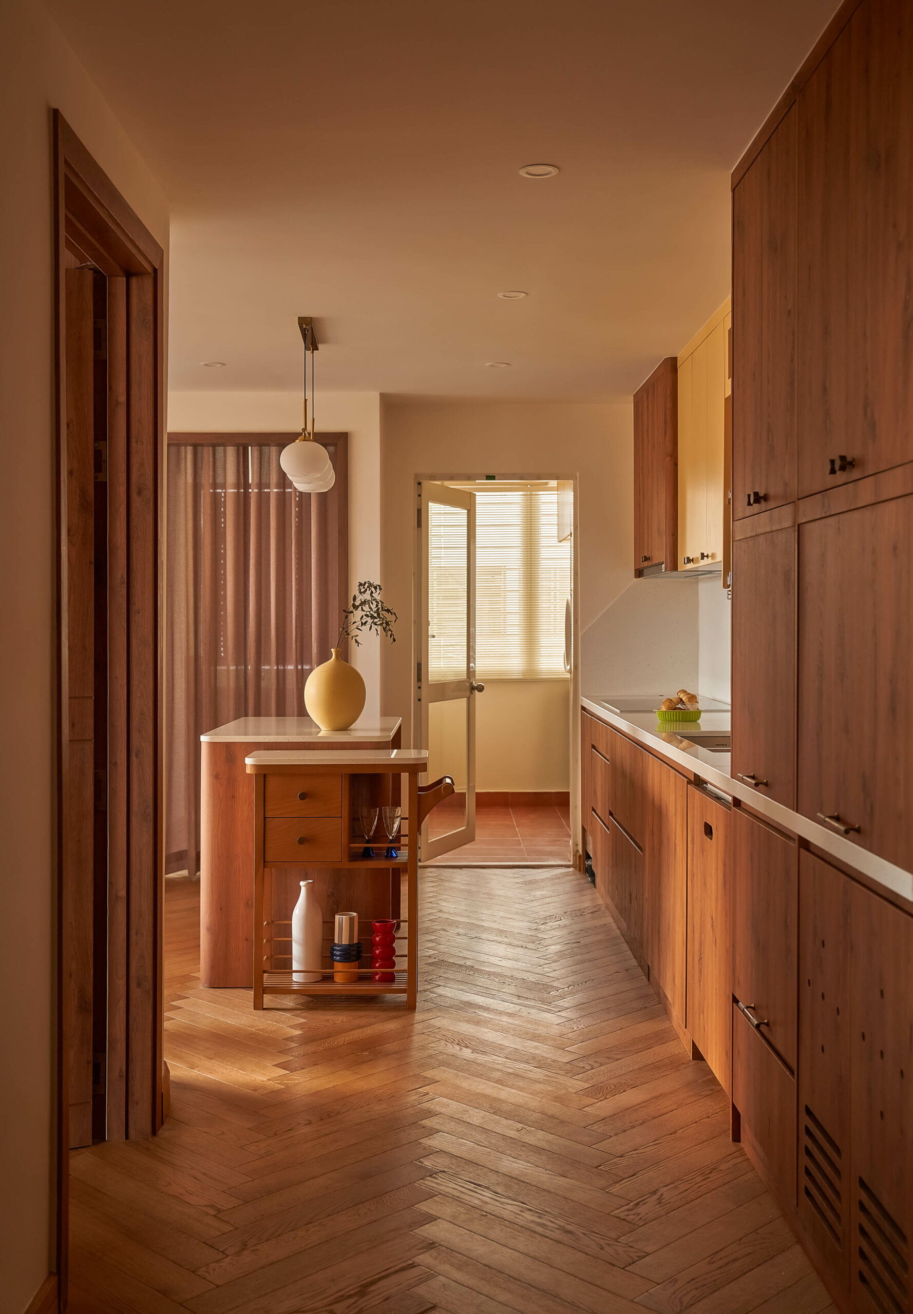 Ngay khi bước qua ngưỡng cửa, cuốn sách không gian được mở ra bằng một nhịp chậm. Ánh sáng len qua các lớp kính màu, rơi xuống nền gỗ xương cá và dẫn lối bằng những đường cong mềm mại. Bàn console nhỏ cùng các khung ảnh treo tường hiện diện như những dòng chữ đầu tiên, chưa trọn vẹn nhưng đủ gợi mở, nơi quá khứ và hiện tại bắt đầu đối thoại trong tinh thần Mid-Century Modern.