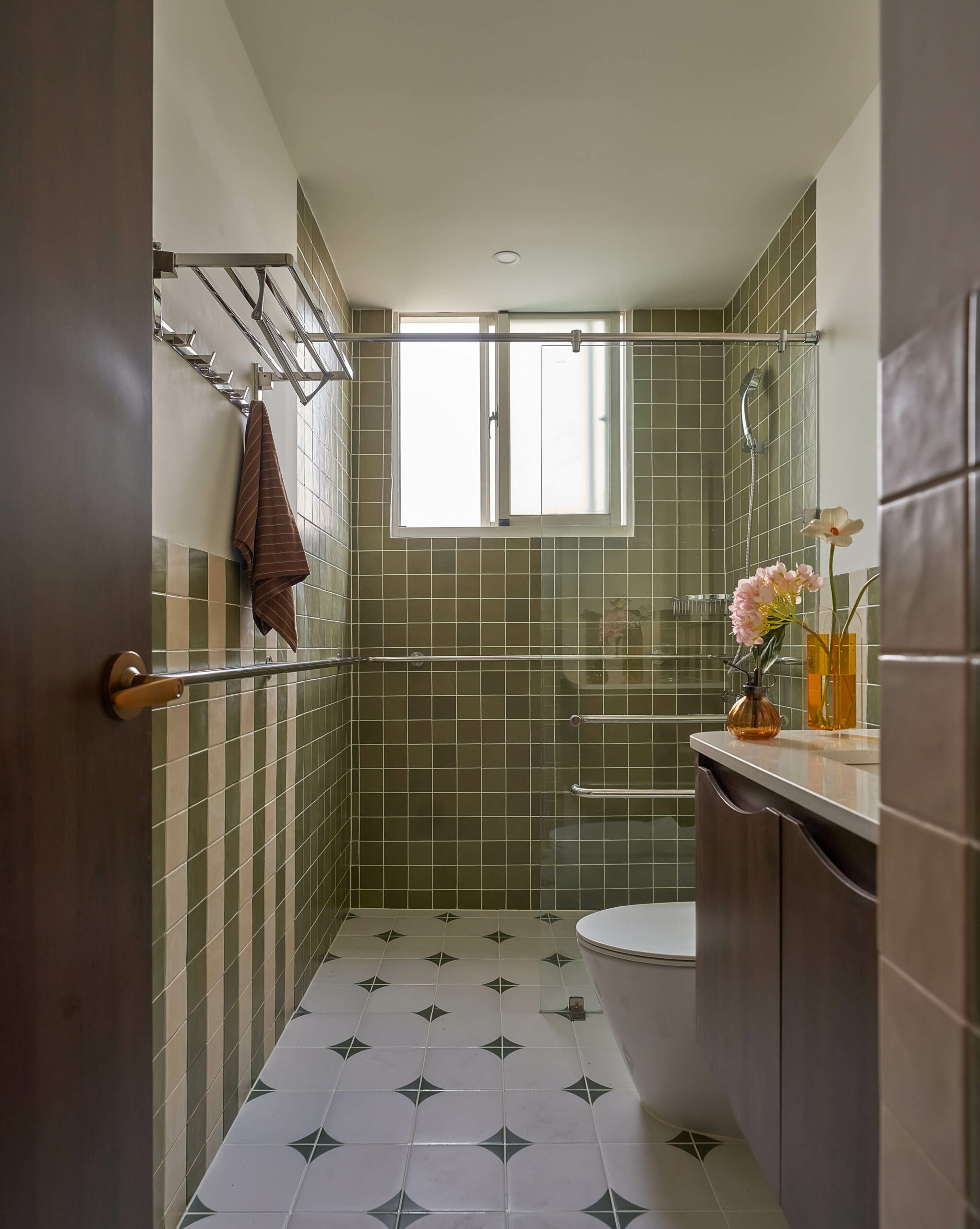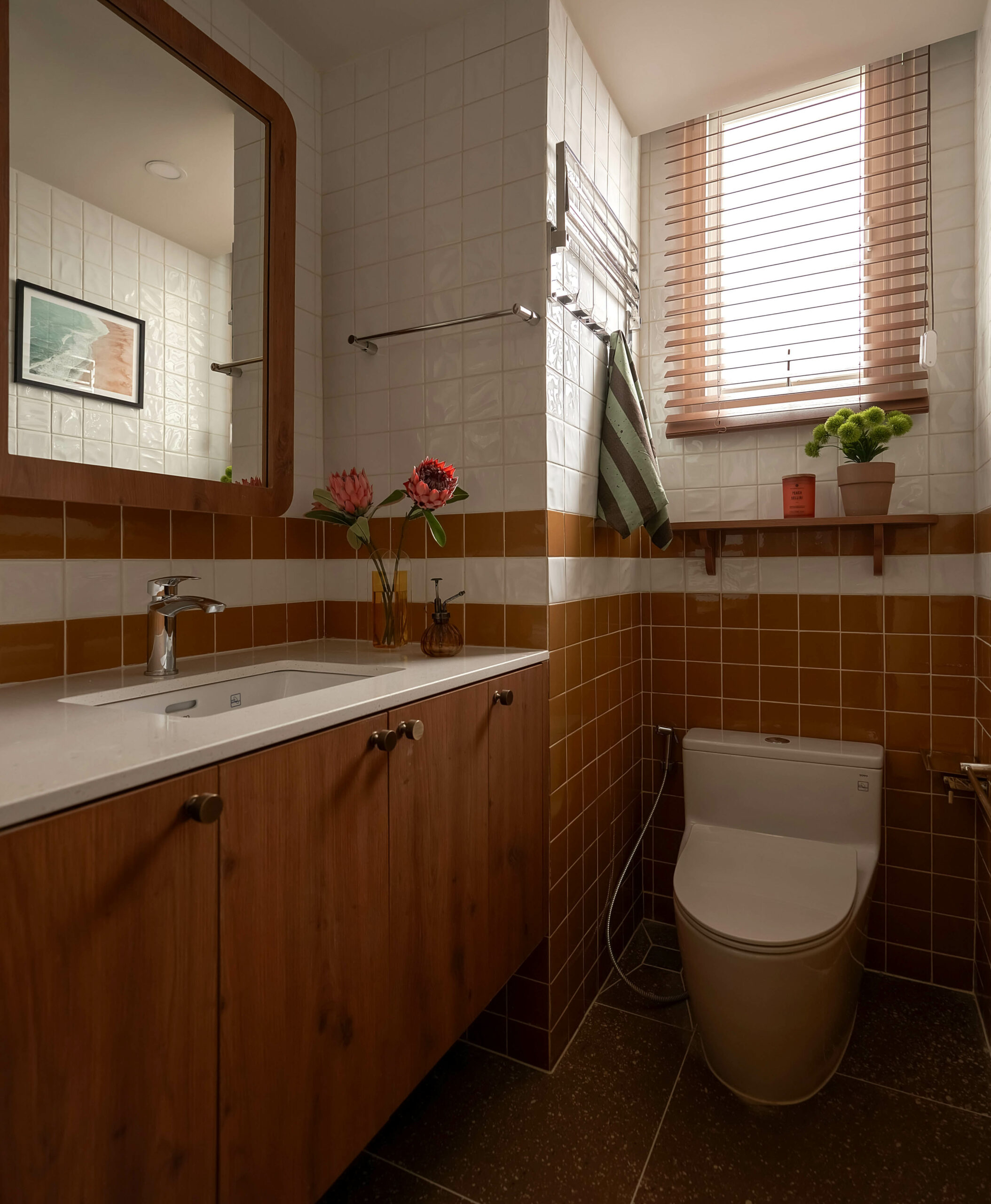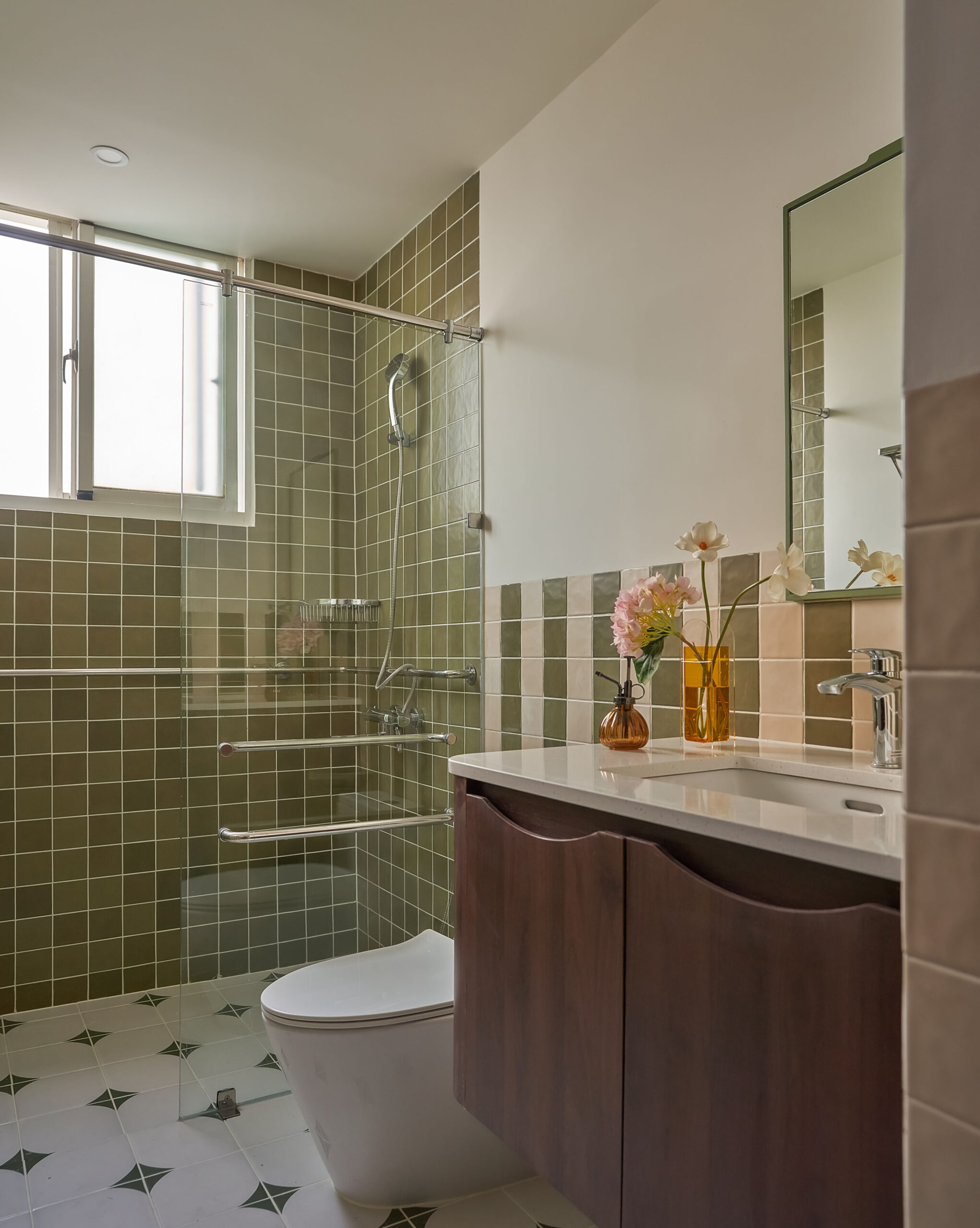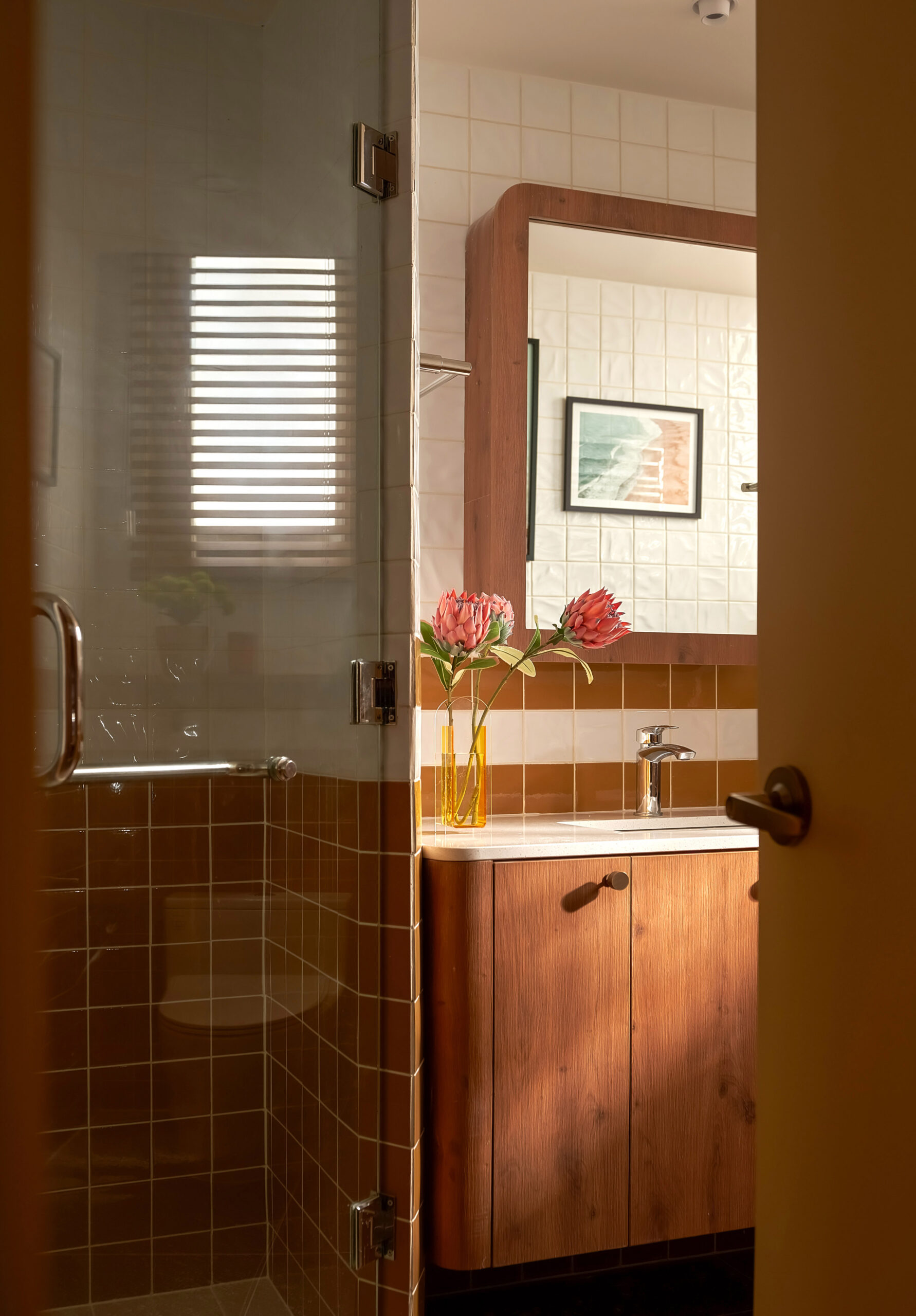 Ngay khi bước qua ngưỡng cửa, cuốn sách không gian được mở ra bằng một nhịp chậm. Ánh sáng len qua các lớp kính màu, rơi xuống nền gỗ xương cá và dẫn lối bằng những đường cong mềm mại. Bàn console nhỏ cùng các khung ảnh treo tường hiện diện như những dòng chữ đầu tiên, chưa trọn vẹn nhưng đủ gợi mở, nơi quá khứ và hiện tại bắt đầu đối thoại trong tinh thần Mid-Century Modern.