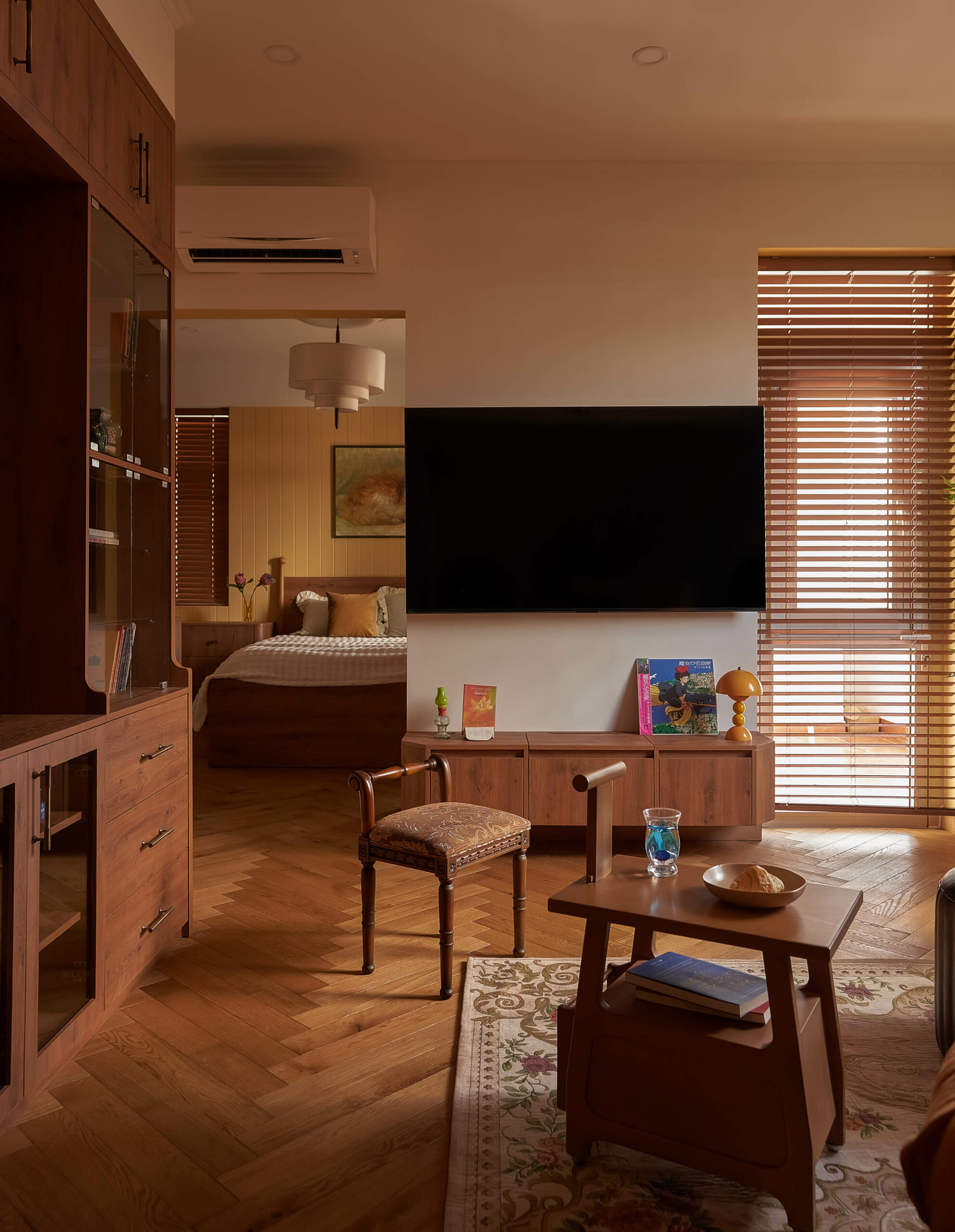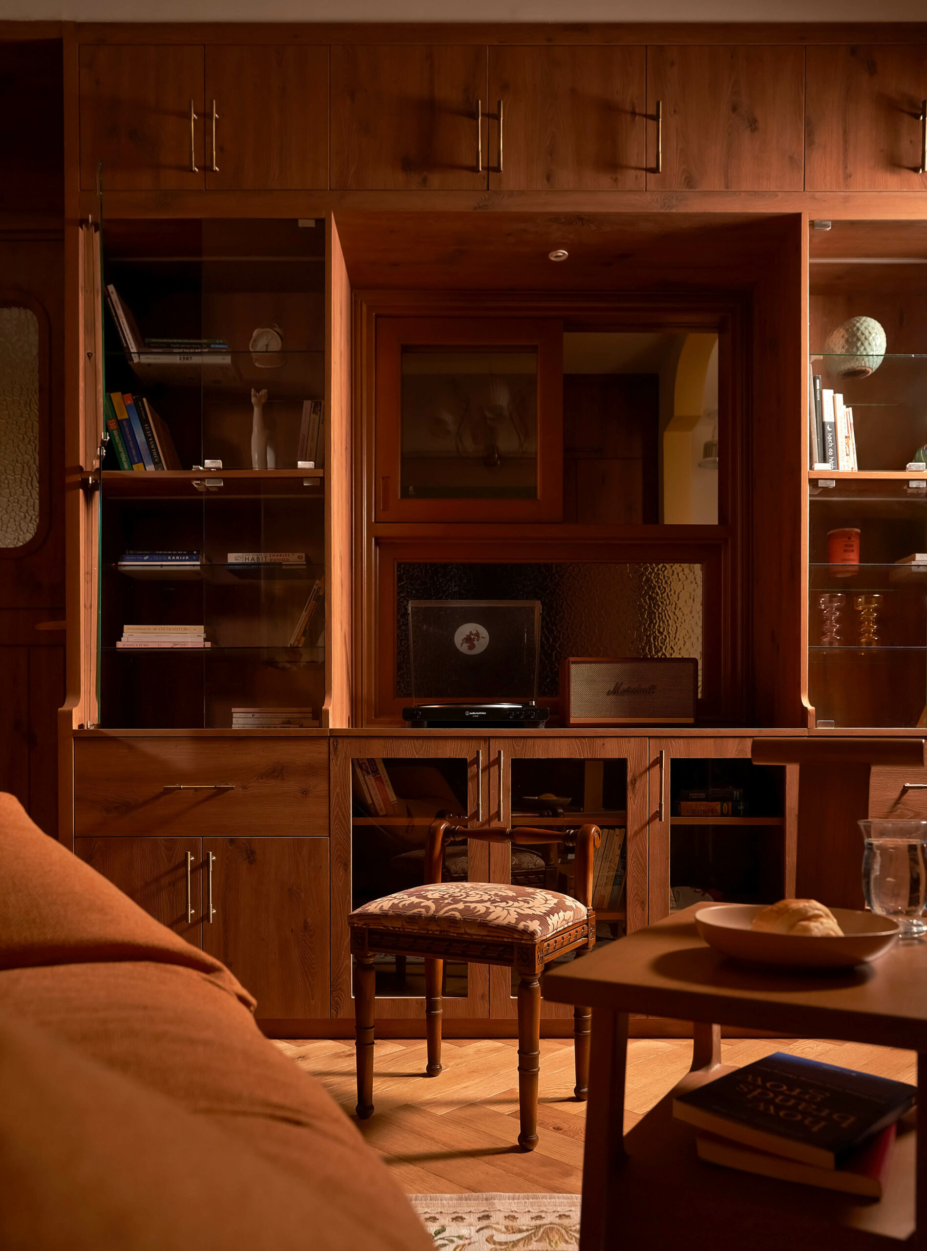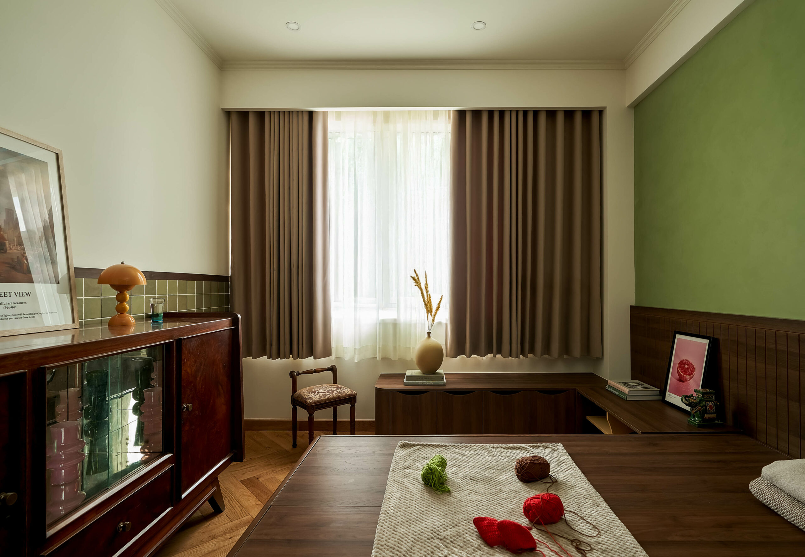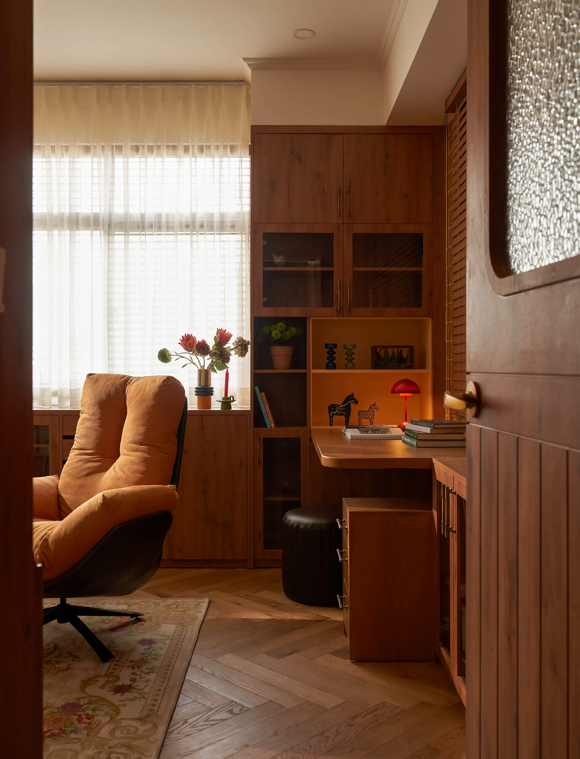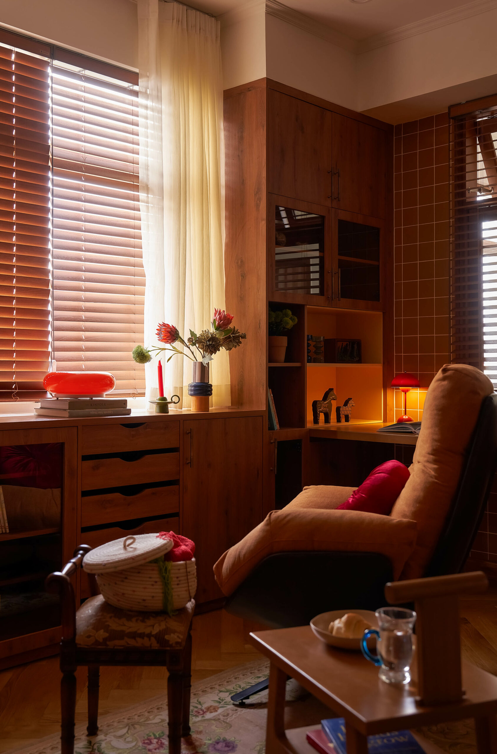 Từ một phòng ngủ nhỏ, không gian được chuyển thành phòng đa chức năng,một trang sách có thể đọc theo nhiều cách. Khi là góc làm việc, lúc là nơi đọc sách, khi cả gia đình quây quần trò chuyện, căn phòng mở ra và gấp lại tùy theo nhu cầu sử dụng. Hệ tủ gỗ ốp kính, ghế tựa lưng và chi tiết tay nắm đồng gợi nhắc tinh thần Mid-Century Modern, nhưng được tiết chế để nhường chỗ cho trải nghiệm sống.