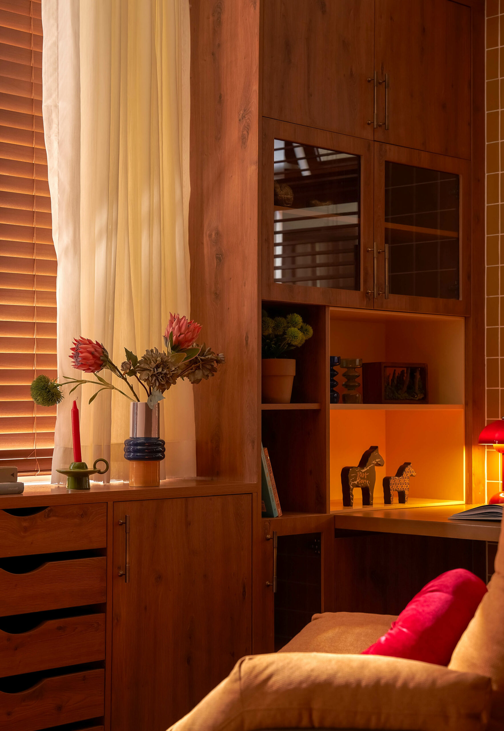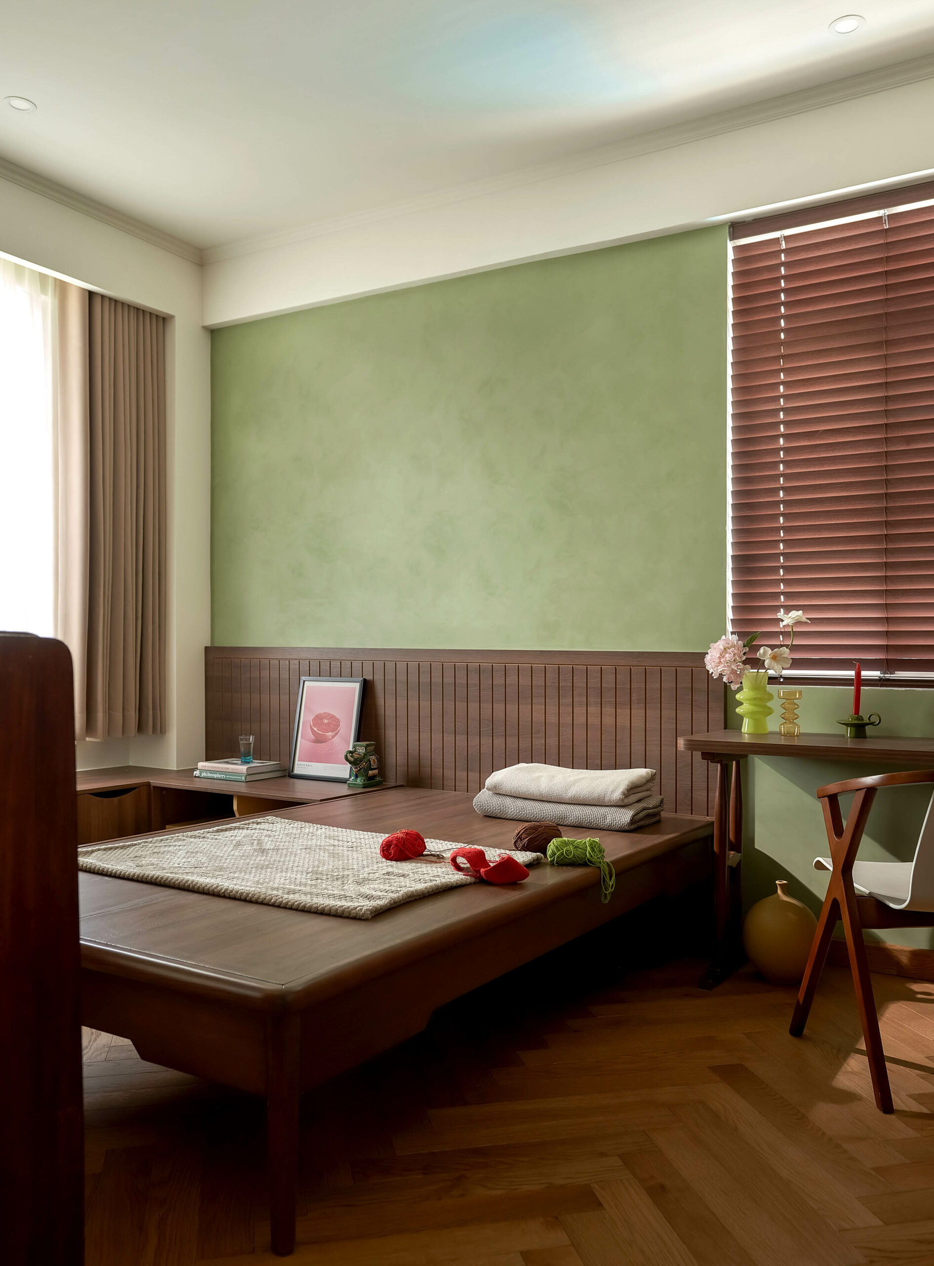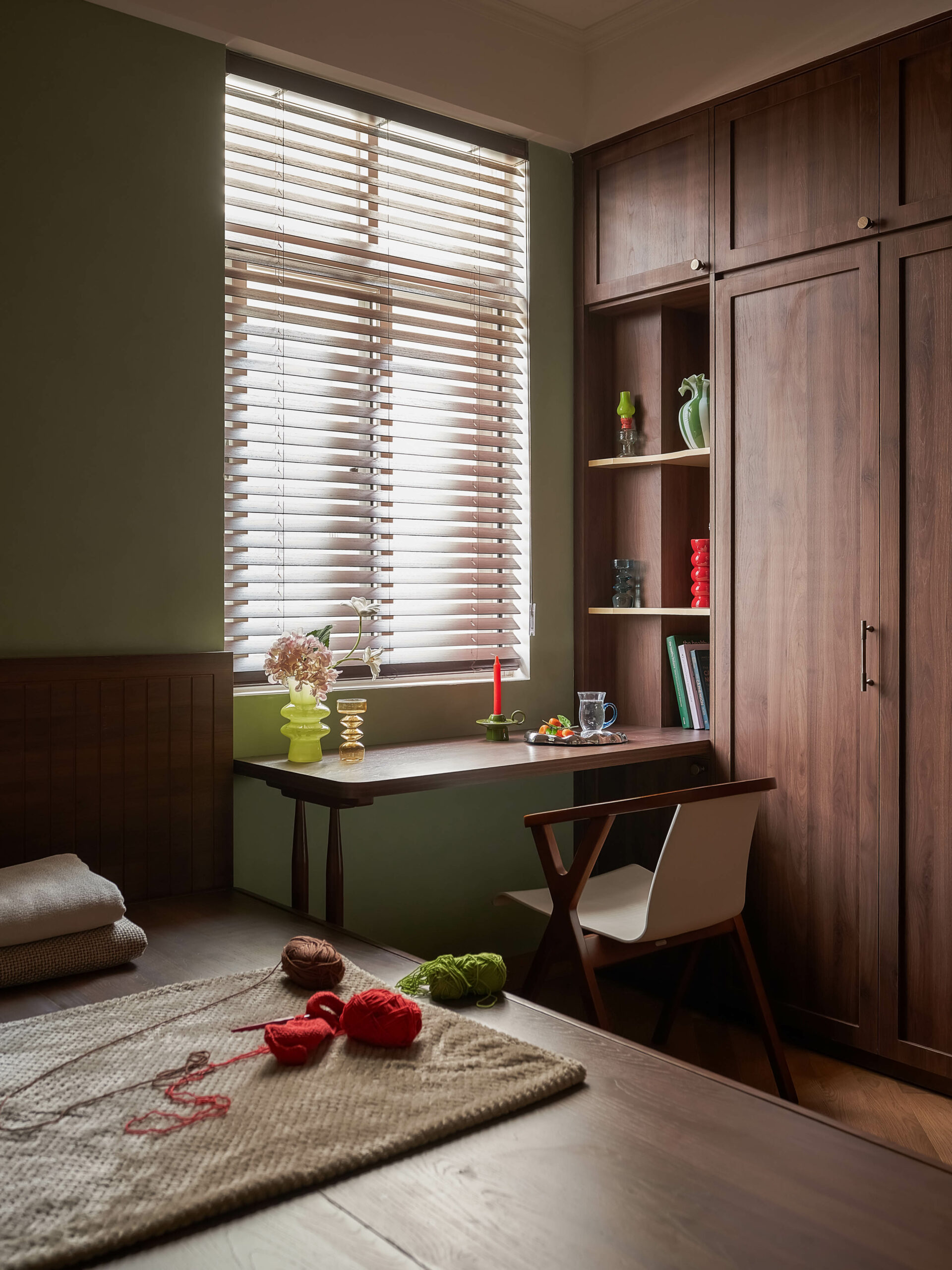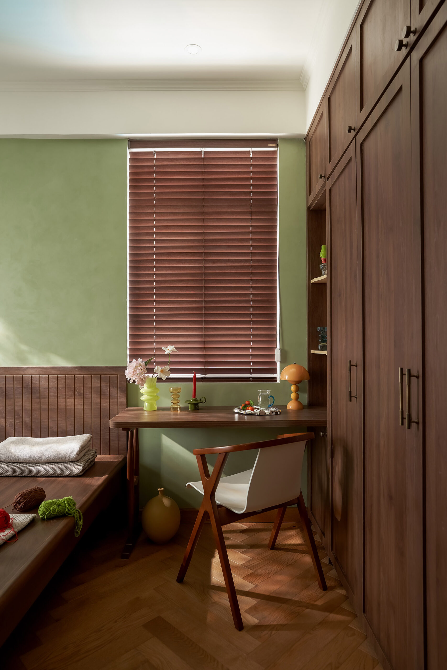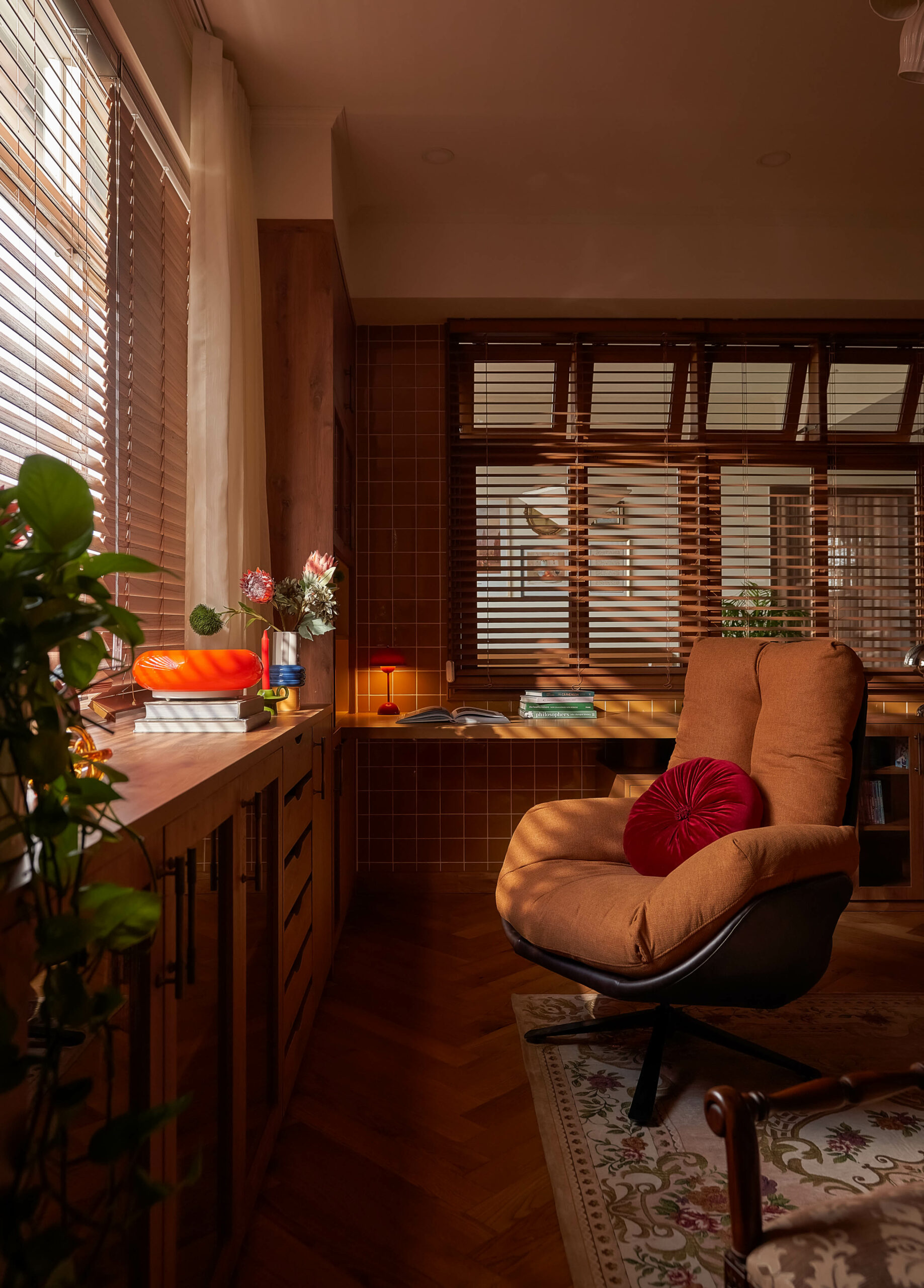 Từ một phòng ngủ nhỏ, không gian được chuyển thành phòng đa chức năng,một trang sách có thể đọc theo nhiều cách. Khi là góc làm việc, lúc là nơi đọc sách, khi cả gia đình quây quần trò chuyện, căn phòng mở ra và gấp lại tùy theo nhu cầu sử dụng. Hệ tủ gỗ ốp kính, ghế tựa lưng và chi tiết tay nắm đồng gợi nhắc tinh thần Mid-Century Modern, nhưng được tiết chế để nhường chỗ cho trải nghiệm sống.