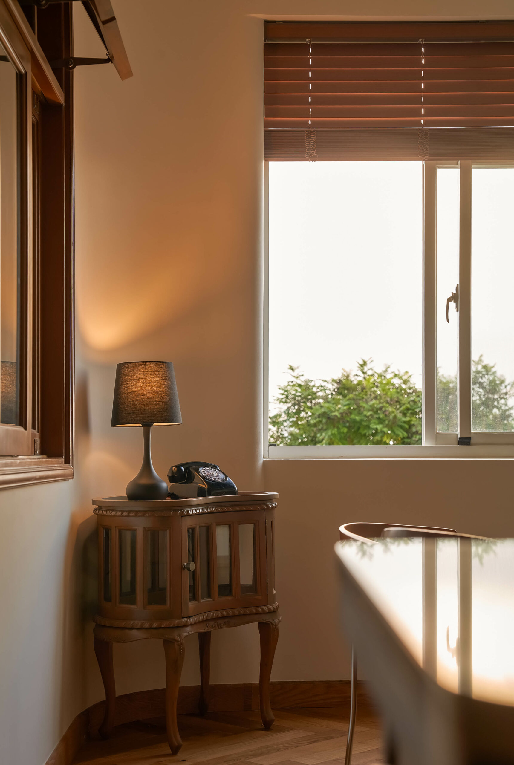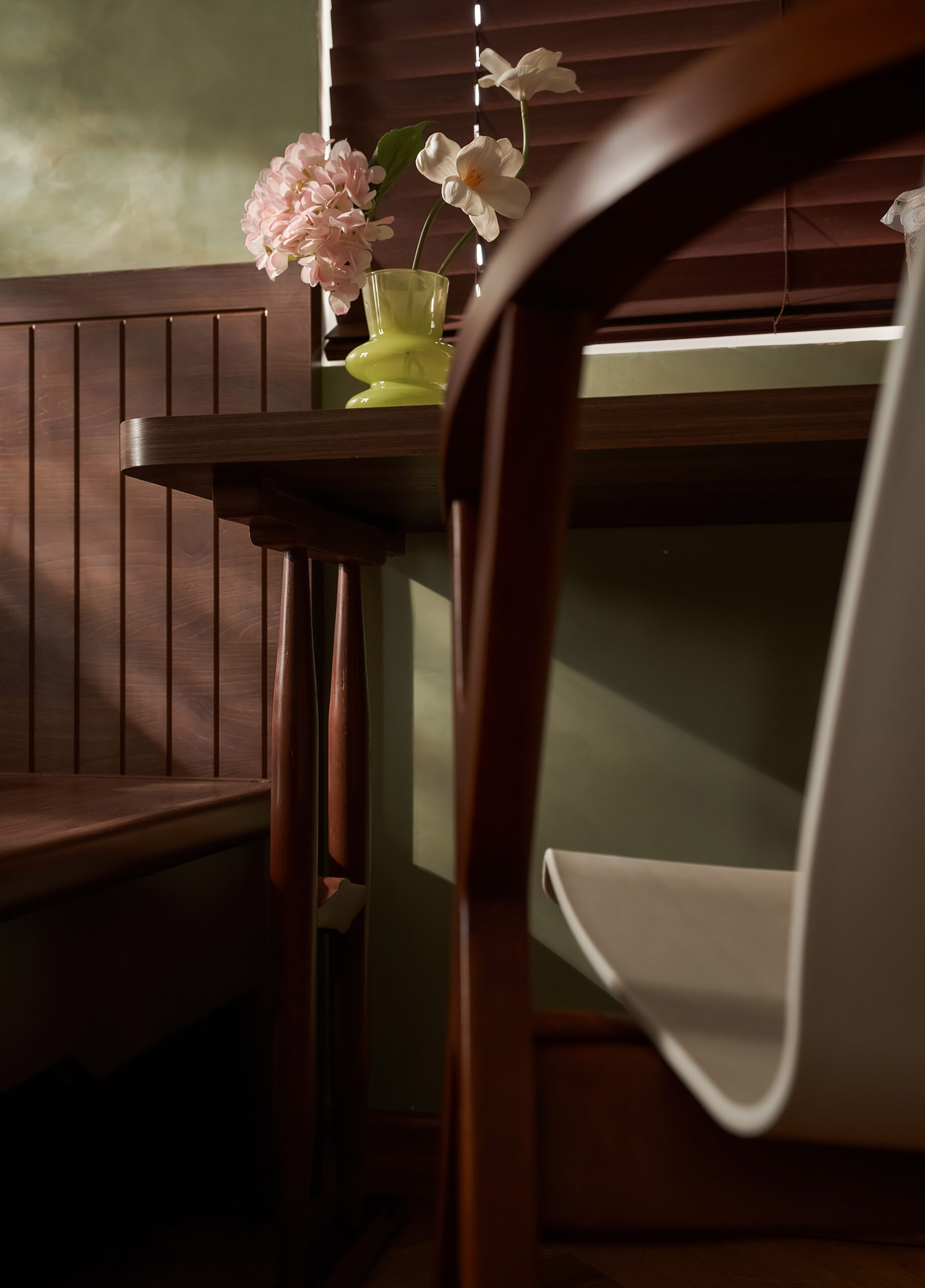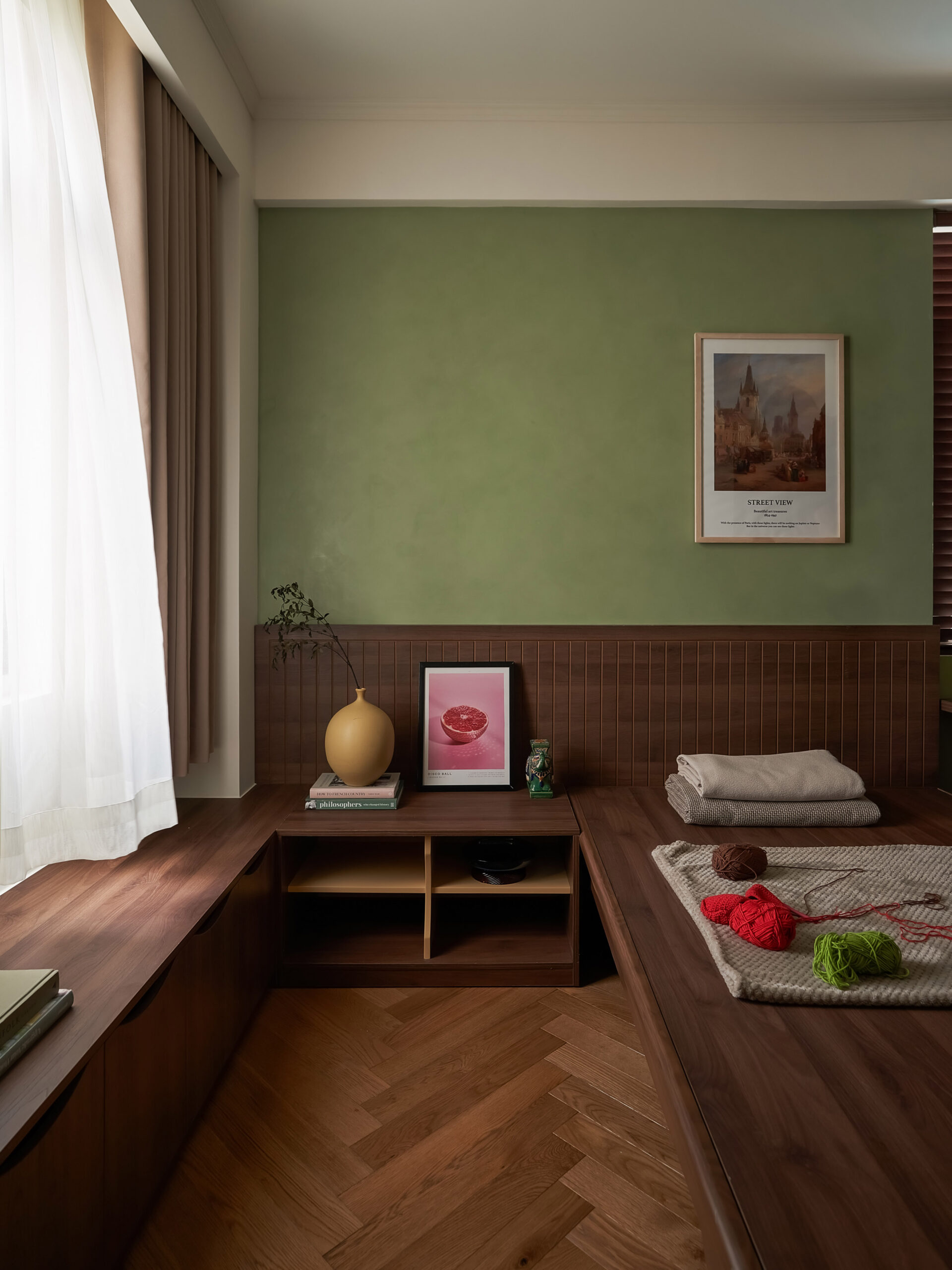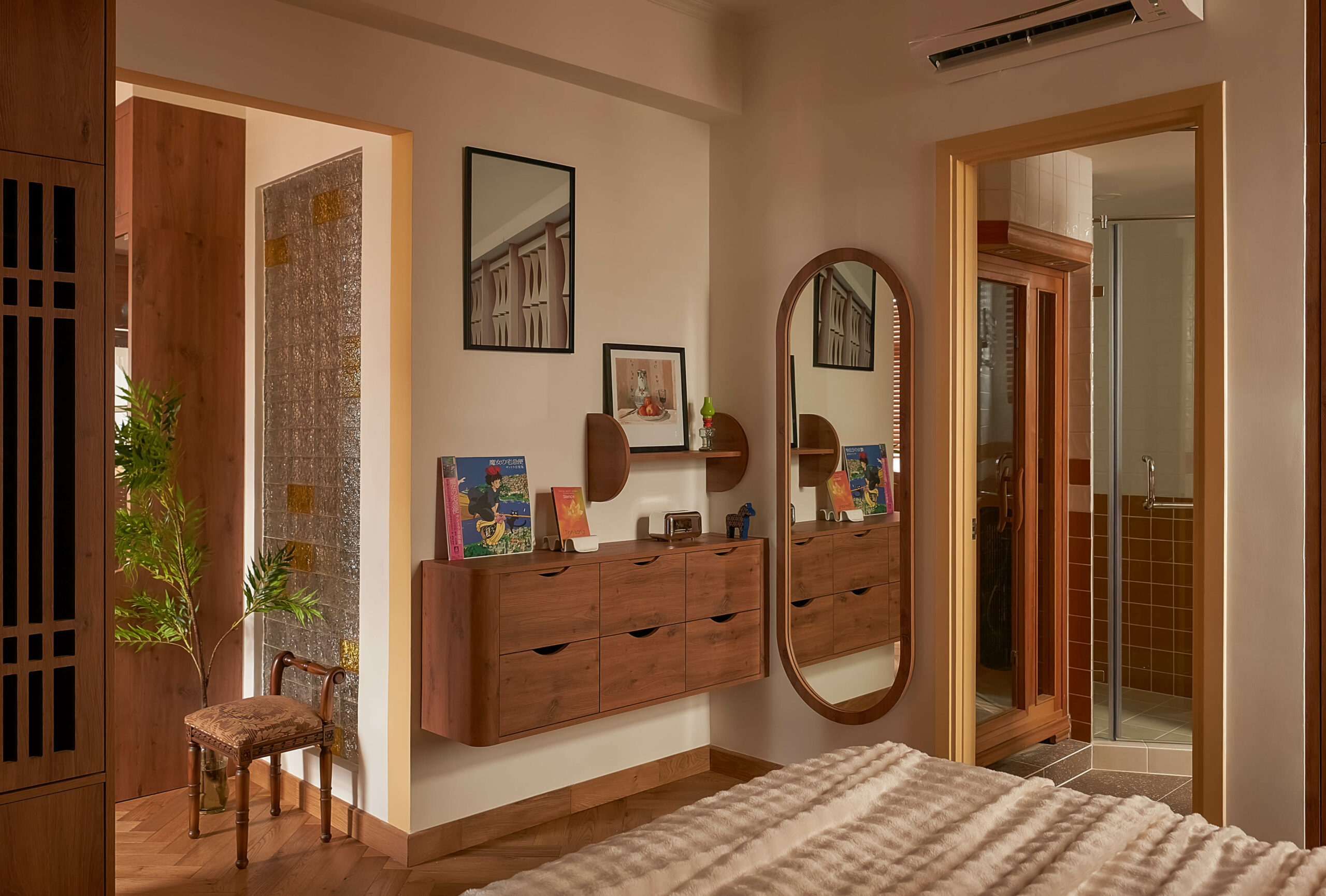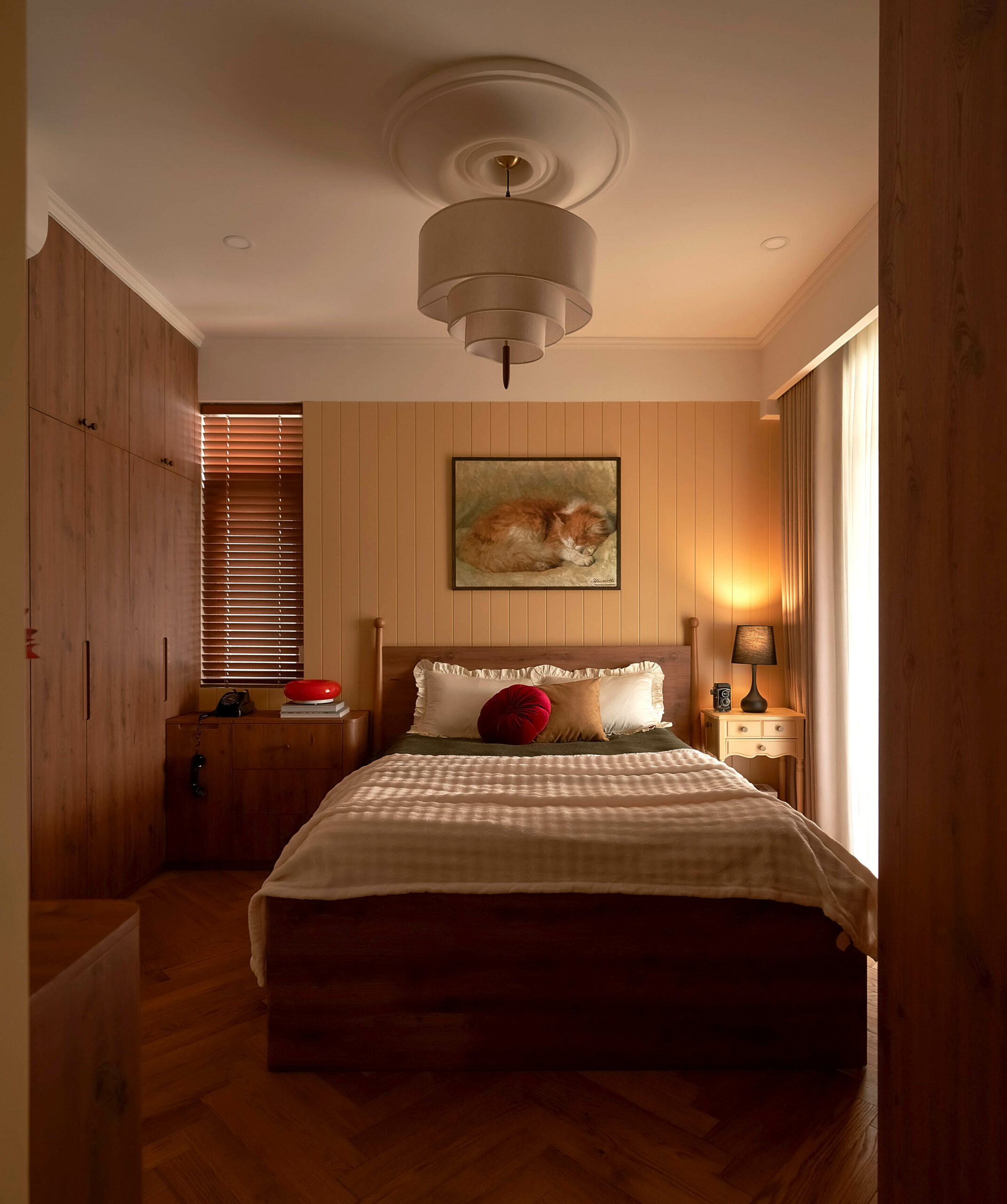 Từ một phòng ngủ nhỏ, không gian được chuyển thành phòng đa chức năng,một trang sách có thể đọc theo nhiều cách. Khi là góc làm việc, lúc là nơi đọc sách, khi cả gia đình quây quần trò chuyện, căn phòng mở ra và gấp lại tùy theo nhu cầu sử dụng. Hệ tủ gỗ ốp kính, ghế tựa lưng và chi tiết tay nắm đồng gợi nhắc tinh thần Mid-Century Modern, nhưng được tiết chế để nhường chỗ cho trải nghiệm sống.
