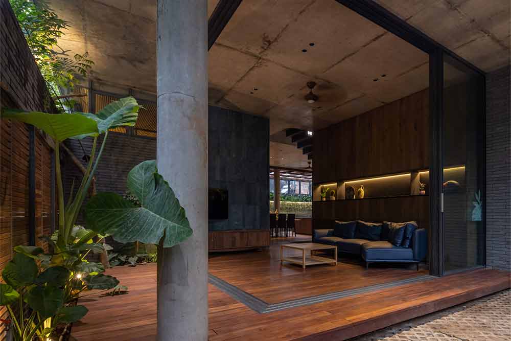 Công trình sử dụng vật liệu thô mộc làm chủ đạo như (đá xanh, đá ong xám, đá rửa, gỗ, cây ăn trái…) với mong muốn mang đến sự gần gũi và thân quen với cuộc sống trước đây của gia đình và làm cho công trình hòa nhập với bối cảnh xung quanh.