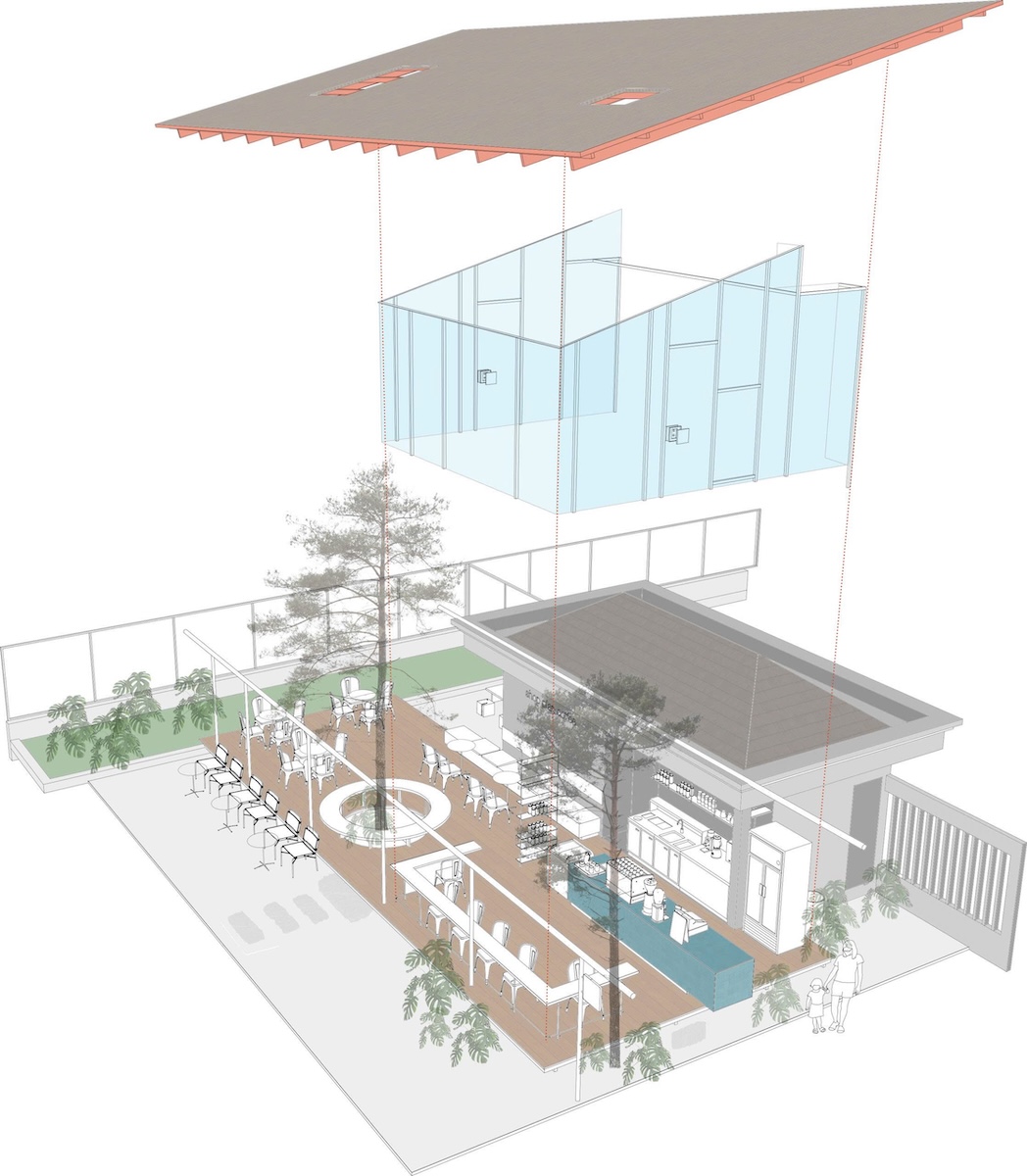 Lựa chọn lối kiến trúc mộc mạc, tháo lắp linh hoạt – sử dụng vật liệu chính là gỗ, sắt, mái tôn nhẹ, vừa đảm bảo dễ thi công, vừa giữ nguyên hiện trạng công trình gốc. Với lối thiết kế, thi công tháo lắp linh hoạt giúp chủ đầu tư có thể dễ di dời địa điểm nếu việc kinh doanh không hiệu quả.
