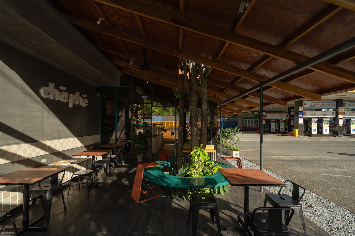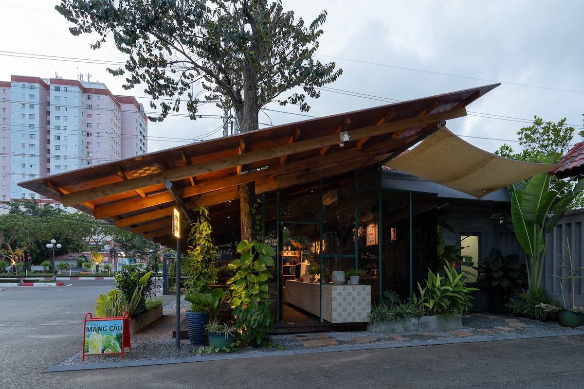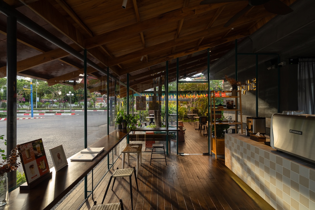 Điểm nhấn là một hệ mái hiên lớn – như một cánh tay vươn ra từ ngôi nhà hiện hữu, vừa có chức năng che nắng, vừa tạo nên một khoảng mở kết nối với vỉa hè và những gốc cây bên đường. Đó không chỉ là nơi ngồi uống cà phê, mà còn là một không gian công cộng nhỏ, thân thiện, dễ tiếp cận – nơi người đi đường có thể ghé lại, nghỉ chân, và hít thở.