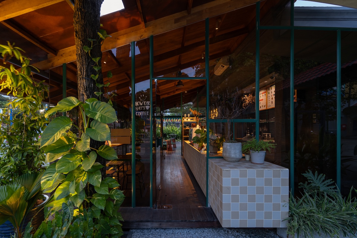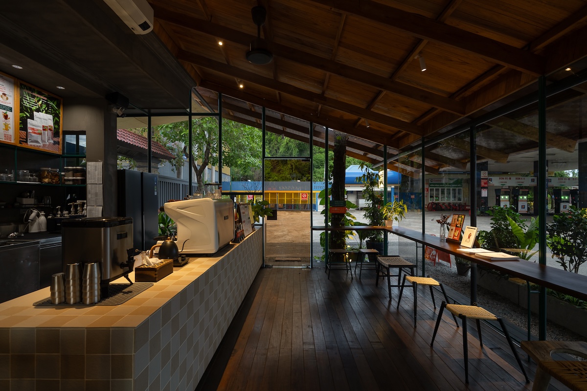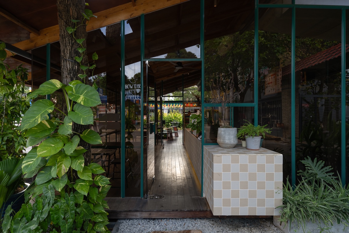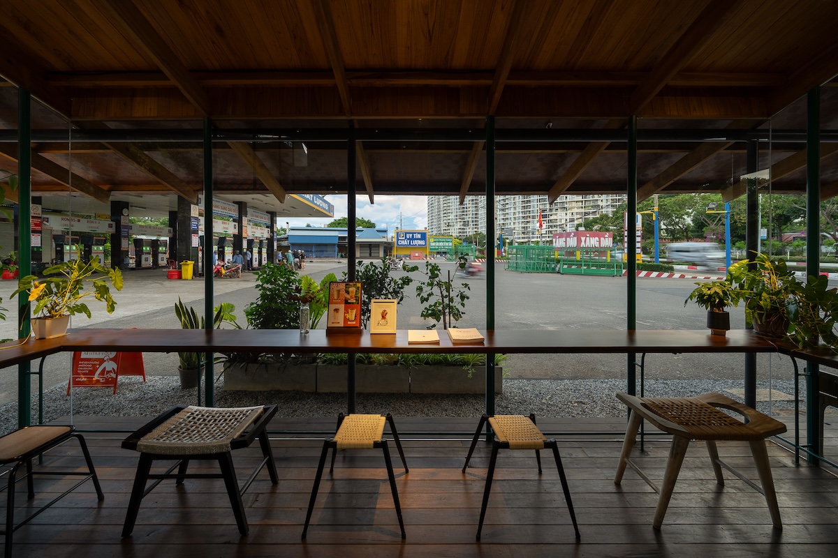 Điểm nhấn là một hệ mái hiên lớn – như một cánh tay vươn ra từ ngôi nhà hiện hữu, vừa có chức năng che nắng, vừa tạo nên một khoảng mở kết nối với vỉa hè và những gốc cây bên đường. Đó không chỉ là nơi ngồi uống cà phê, mà còn là một không gian công cộng nhỏ, thân thiện, dễ tiếp cận – nơi người đi đường có thể ghé lại, nghỉ chân, và hít thở.