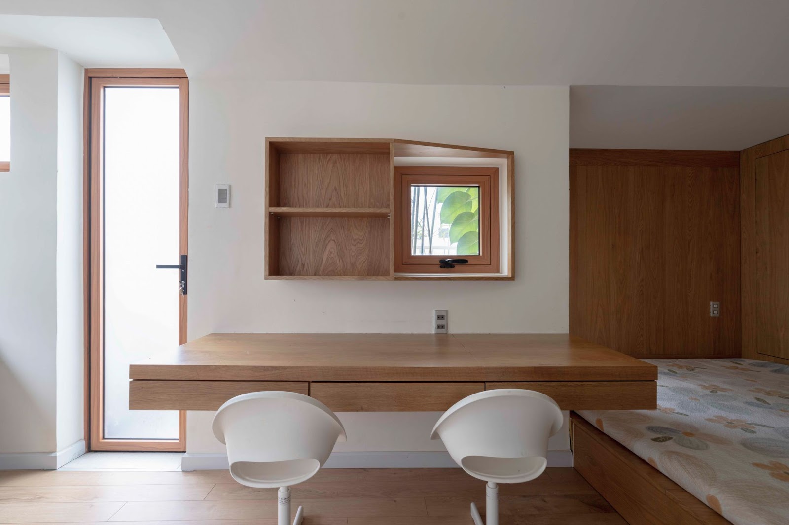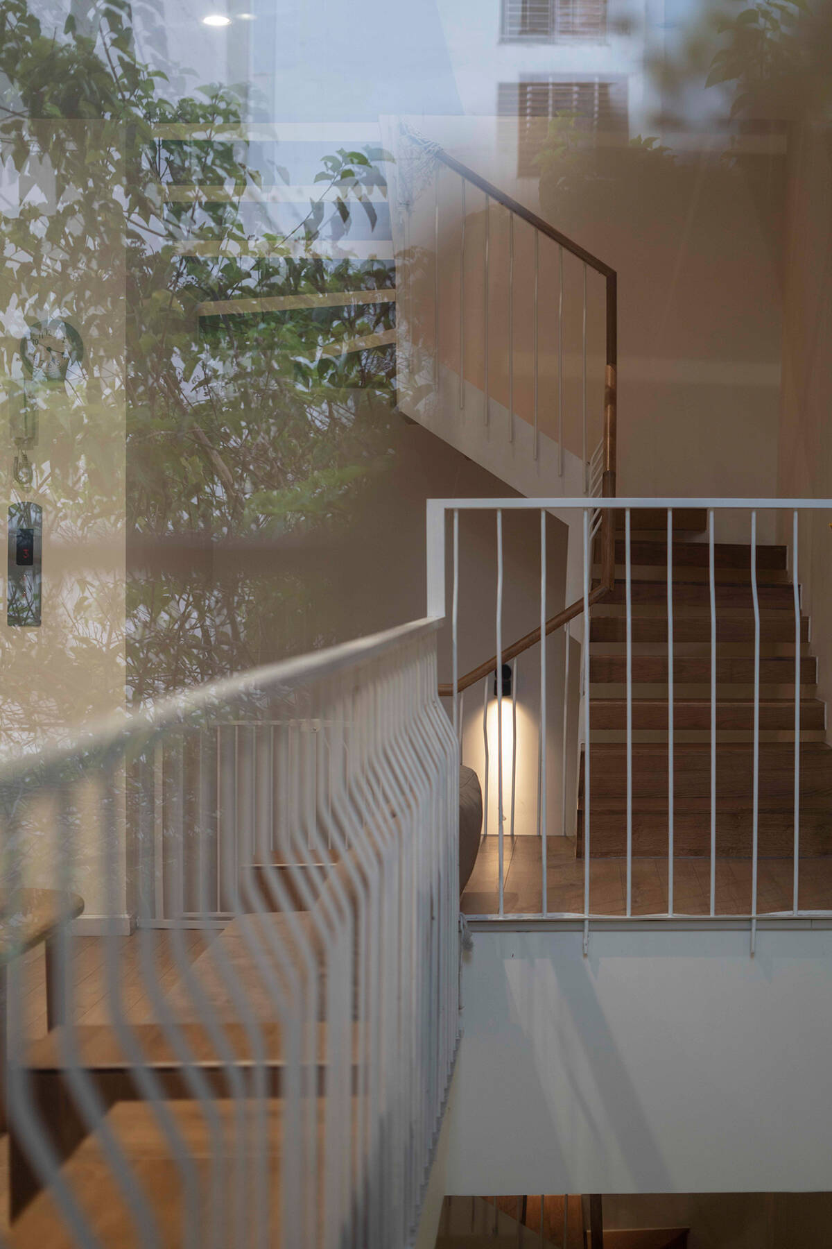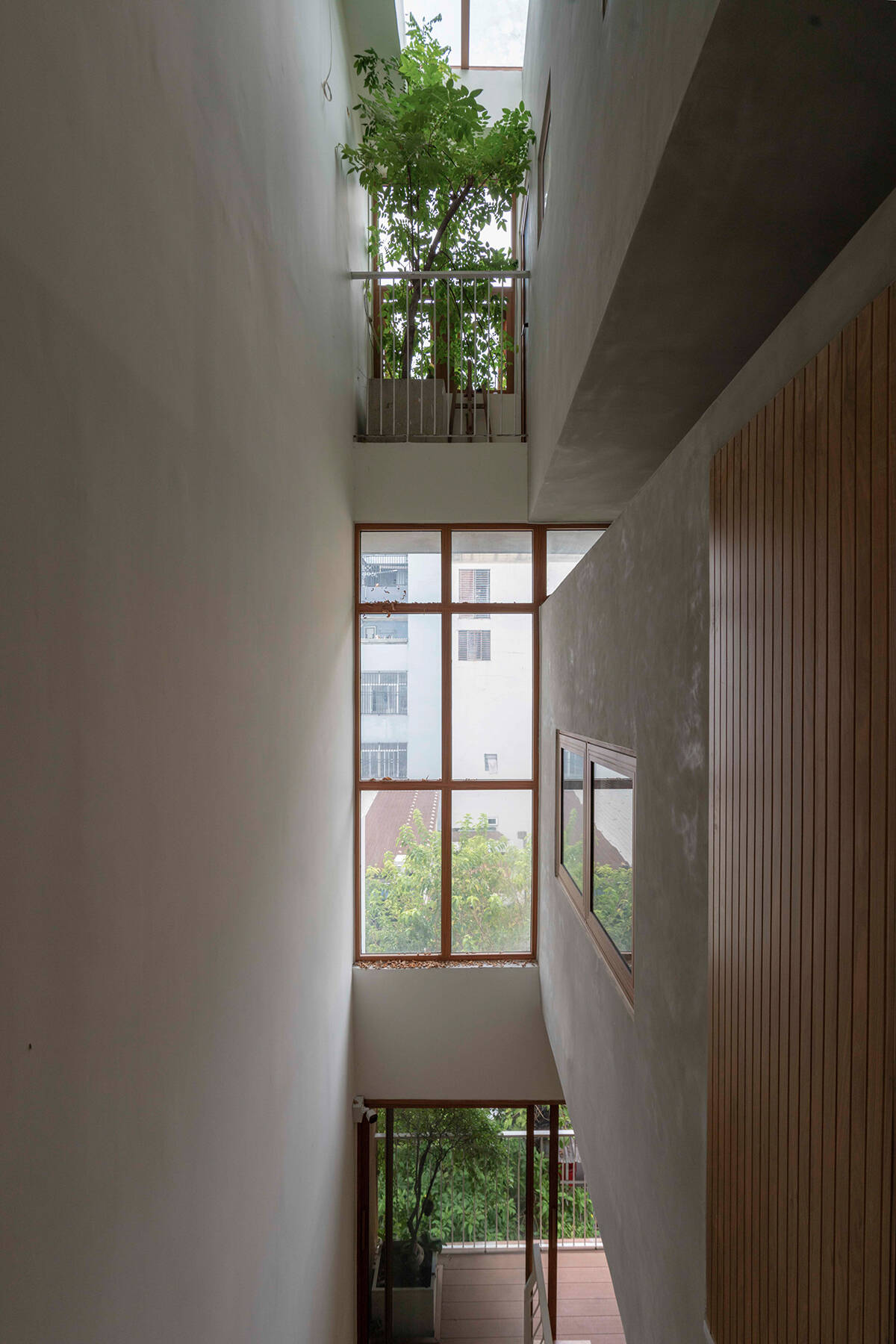 Giếng trời bốn tầng như một sợi dây kết nối thẳng đứng, đưa ánh sáng tự nhiên và luồng gió mát len lỏi khắp mọi ngóc ngách trong ngôi nhà. Không gian mở này không chỉ tạo sự liên thông giữa các tầng mà còn khiến âm thanh và mùi hương hòa quyện nhẹ nhàng, lan tỏa khắp nơi. Từ khu vực sinh hoạt chung, gia chủ có thể nghe tiếng con gái đang chơi đàn piano, hay cảm nhận mùi thơm của bữa cơm nhà tỏa lên ở bếp bên dưới. Ánh sáng xuyên qua các khe hở được bố trí tinh tế, gió nhẹ khẽ lướt qua những khoảng không gian trống, tạo nên một ngôi nhà rộng mở, mềm mại và linh hoạt, nơi mỗi thành viên đều tìm thấy sự tự do riêng biệt cùng cảm giác gắn kết sâu sắc.