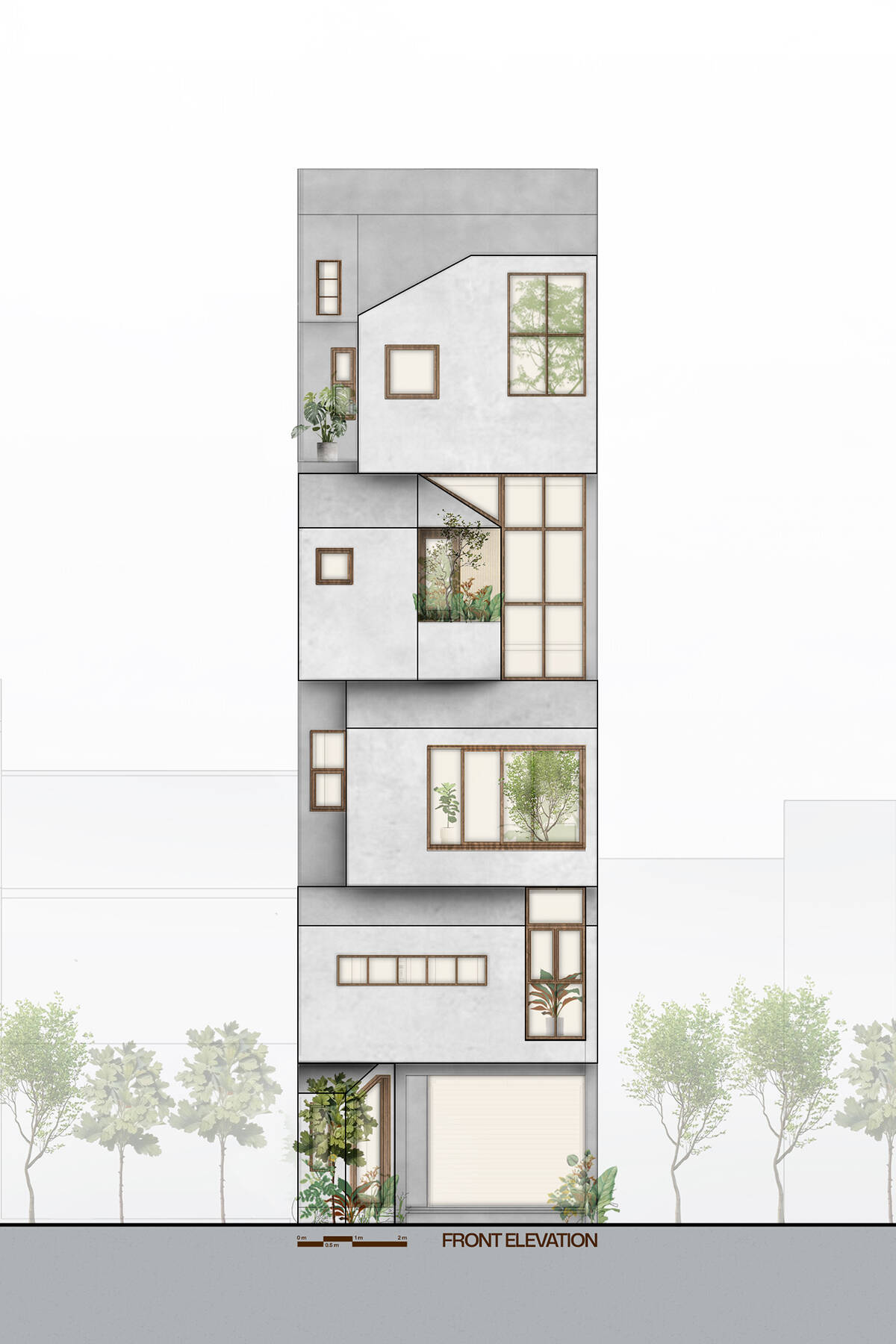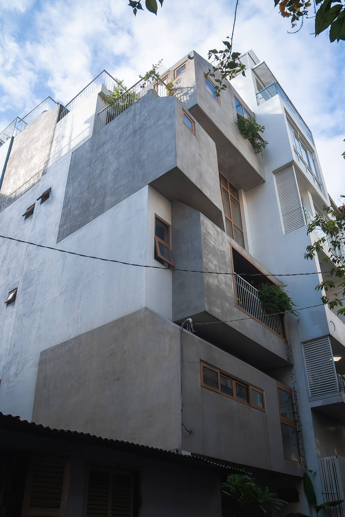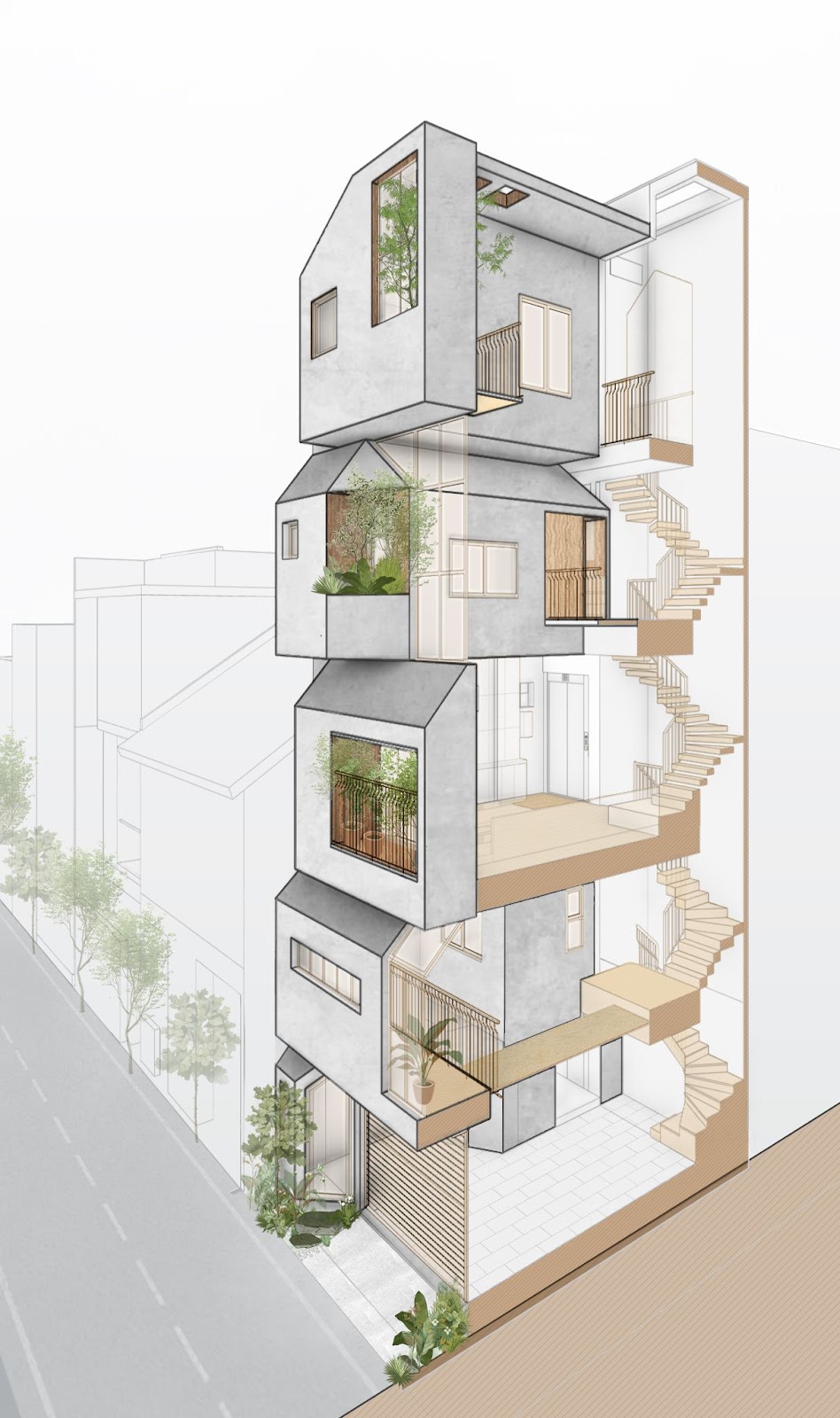Trên một diện tích khiêm tốn, kiến trúc sư tạo ra 5 tầng lầu như các khối hộp xếp chồng lên nhau, với mái dốc gợi nhớ đến những ngôi nhà tí hon trong ký ức tuổi thơ – những buổi chiều say sưa dựng lều, tạo nên thế giới riêng cho riêng mình. Mỗi đứa trẻ trong nhà đều có một góc nhỏ để thu mình, để được là chính mình. Nhưng chỉ cần bước ra, chúng sẽ gặp ngay ánh nhìn thân thuộc của cha mẹ, tiếng cười vang vọng đâu đó, và sự ấm áp của những khoảnh khắc sẻ chia trong đời sống gia đình.