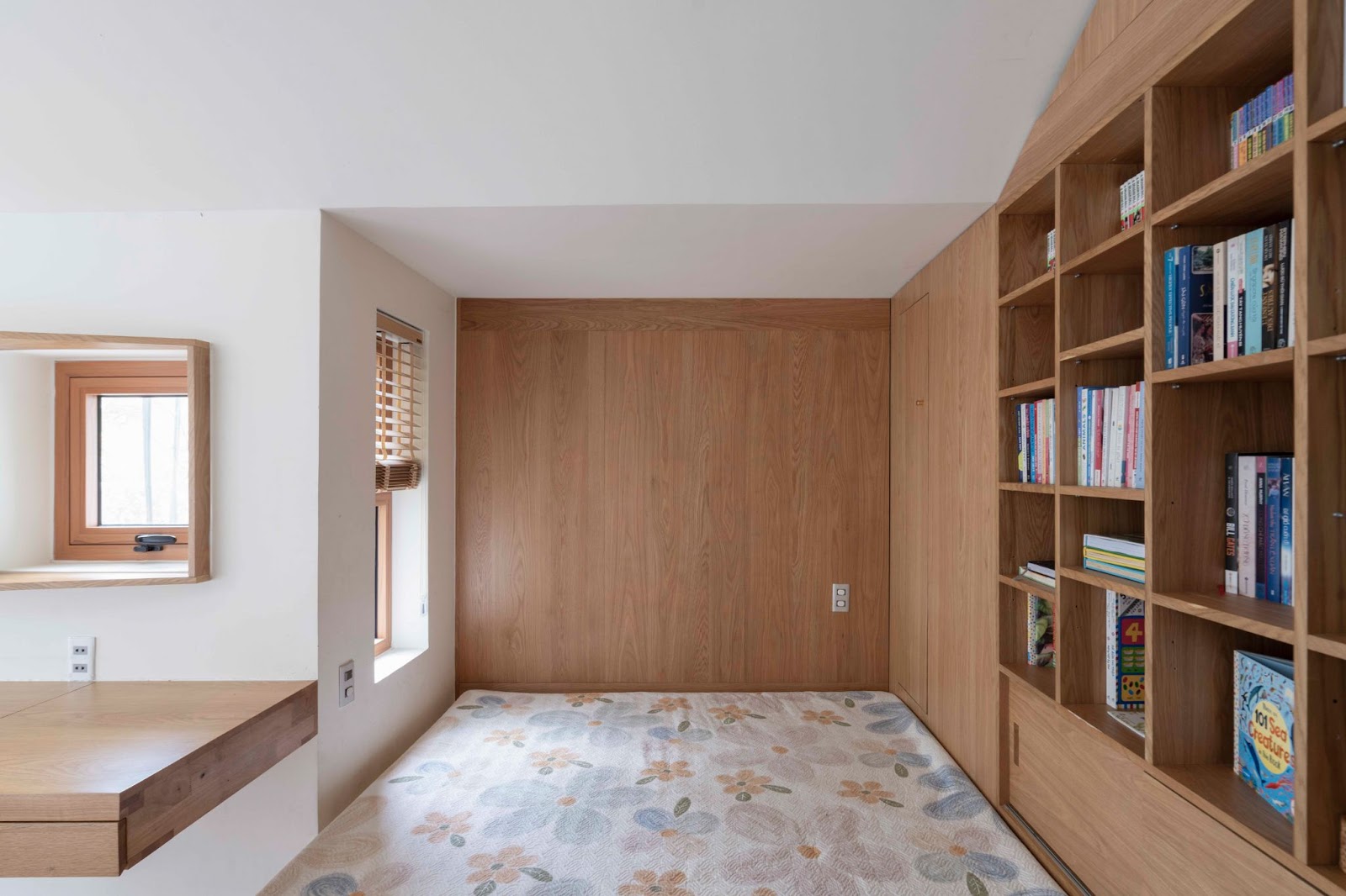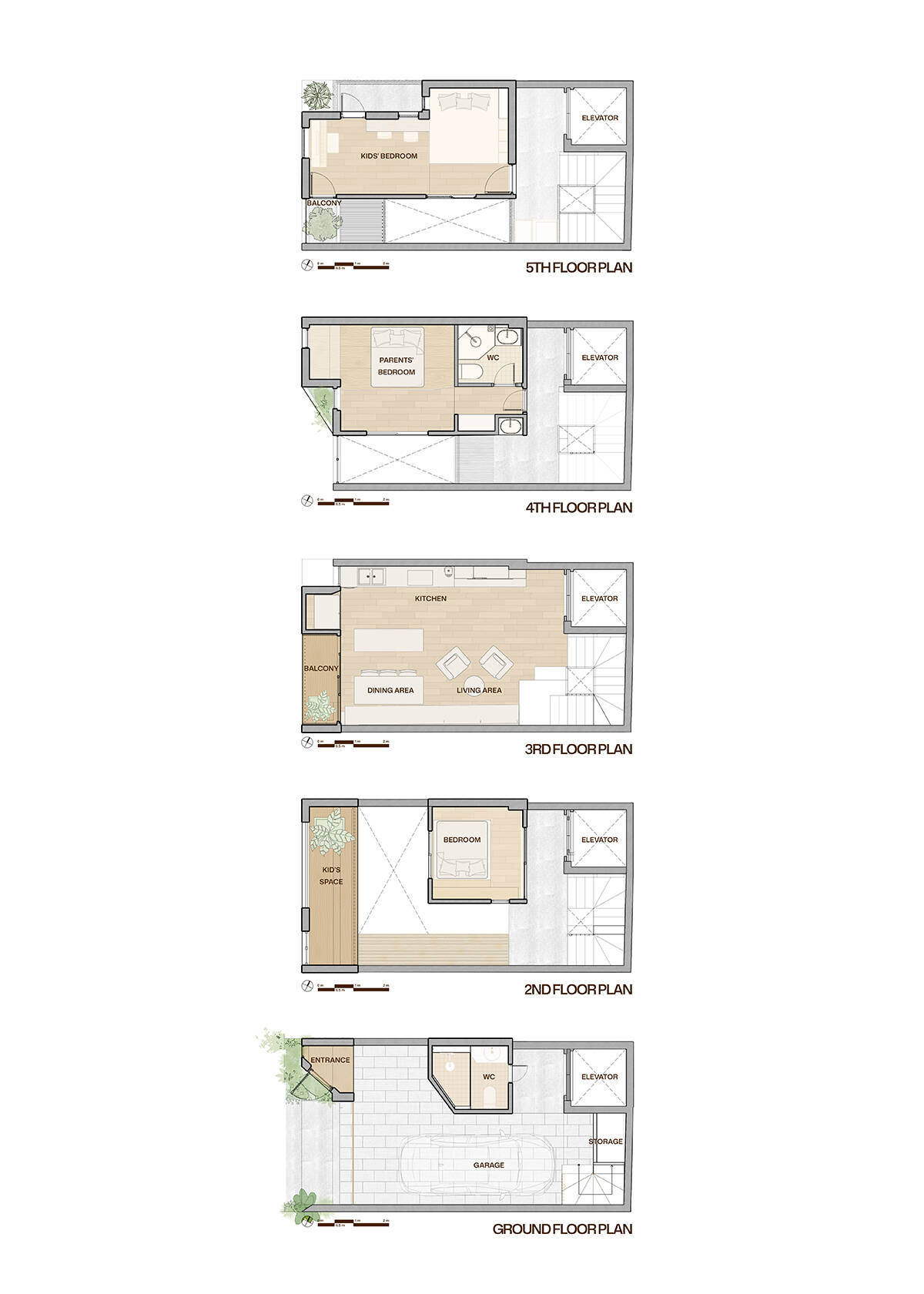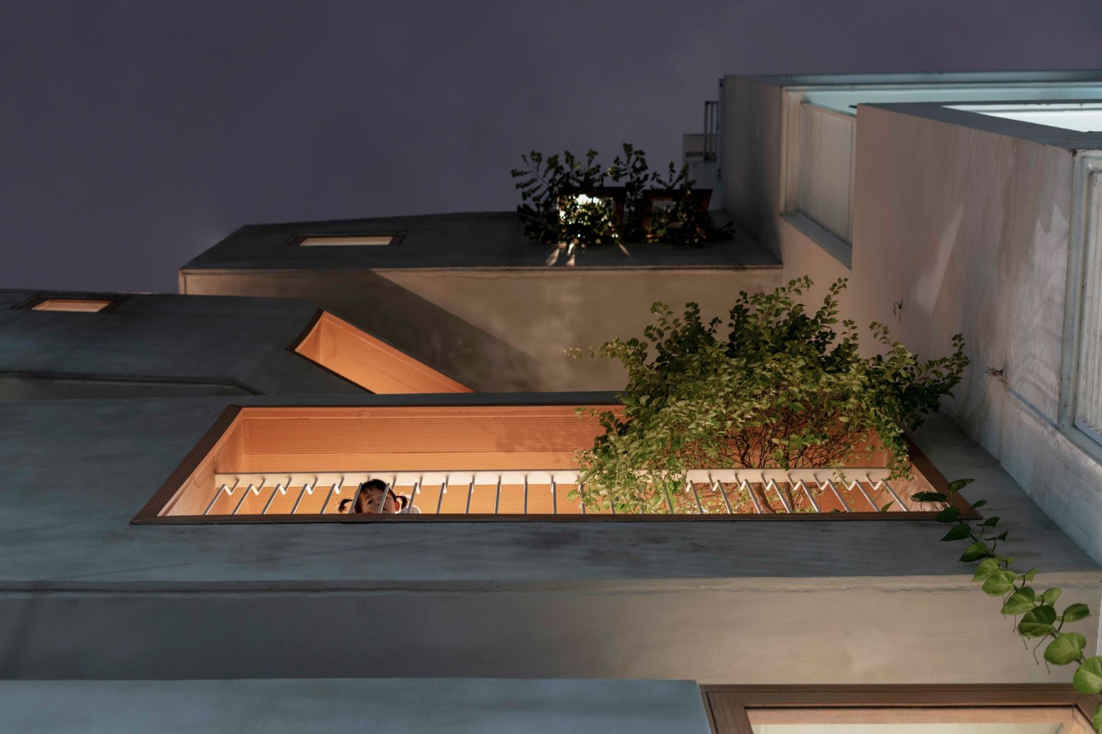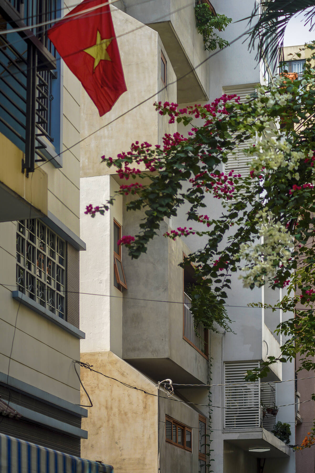 Trên một diện tích khiêm tốn, kiến trúc sư tạo ra 5 tầng lầu như các khối hộp xếp chồng lên nhau, với mái dốc gợi nhớ đến những ngôi nhà tí hon trong ký ức tuổi thơ – những buổi chiều say sưa dựng lều, tạo nên thế giới riêng cho riêng mình. Mỗi đứa trẻ trong nhà đều có một góc nhỏ để thu mình, để được là chính mình. Nhưng chỉ cần bước ra, chúng sẽ gặp ngay ánh nhìn thân thuộc của cha mẹ, tiếng cười vang vọng đâu đó, và sự ấm áp của những khoảnh khắc sẻ chia trong đời sống gia đình.