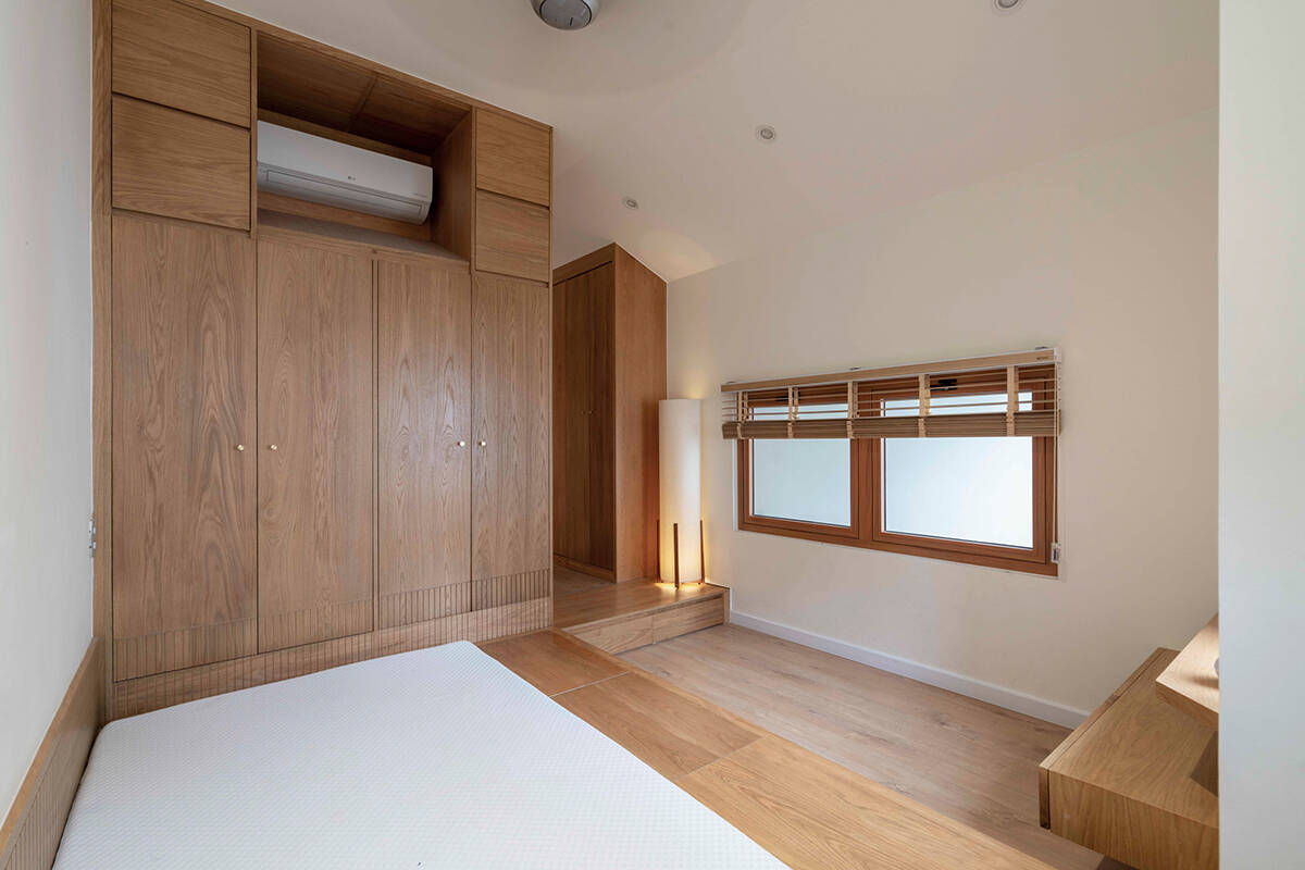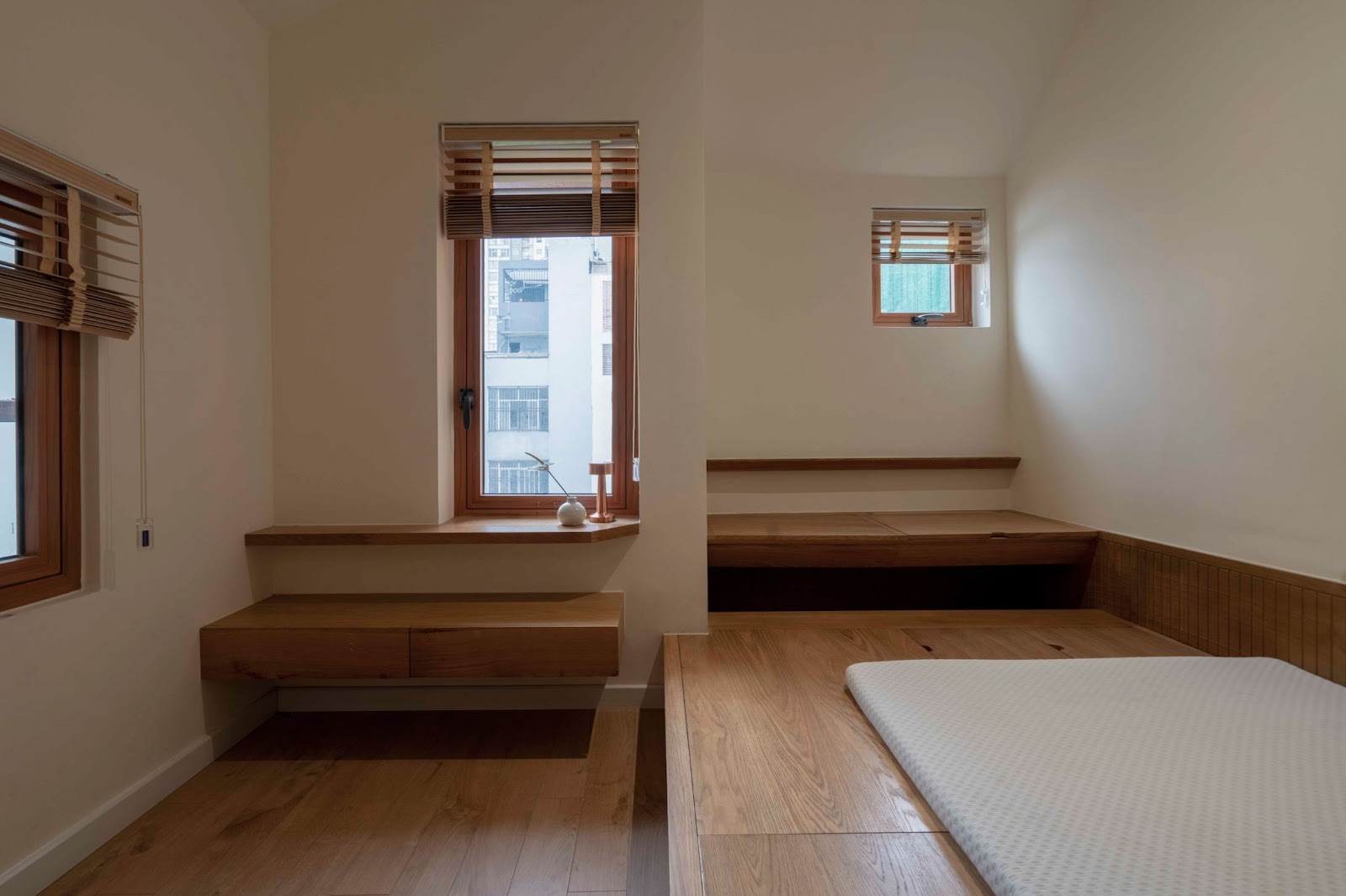 Bảng vật liệu và tông màu được chọn lọc kỹ càng với sự tinh giản tối đa, chỉ giữ lại những yếu tố cốt lõi nhất. Tường trắng làm nền, hài hòa cùng trần nhà xám nhẹ nhàng, trong khi những chi tiết gỗ ấm áp mang đến cảm giác gần gũi và dịu dàng. Các mảng xanh nhỏ điểm xuyết khéo léo tạo nên sự sinh động và tươi mới cho không gian.