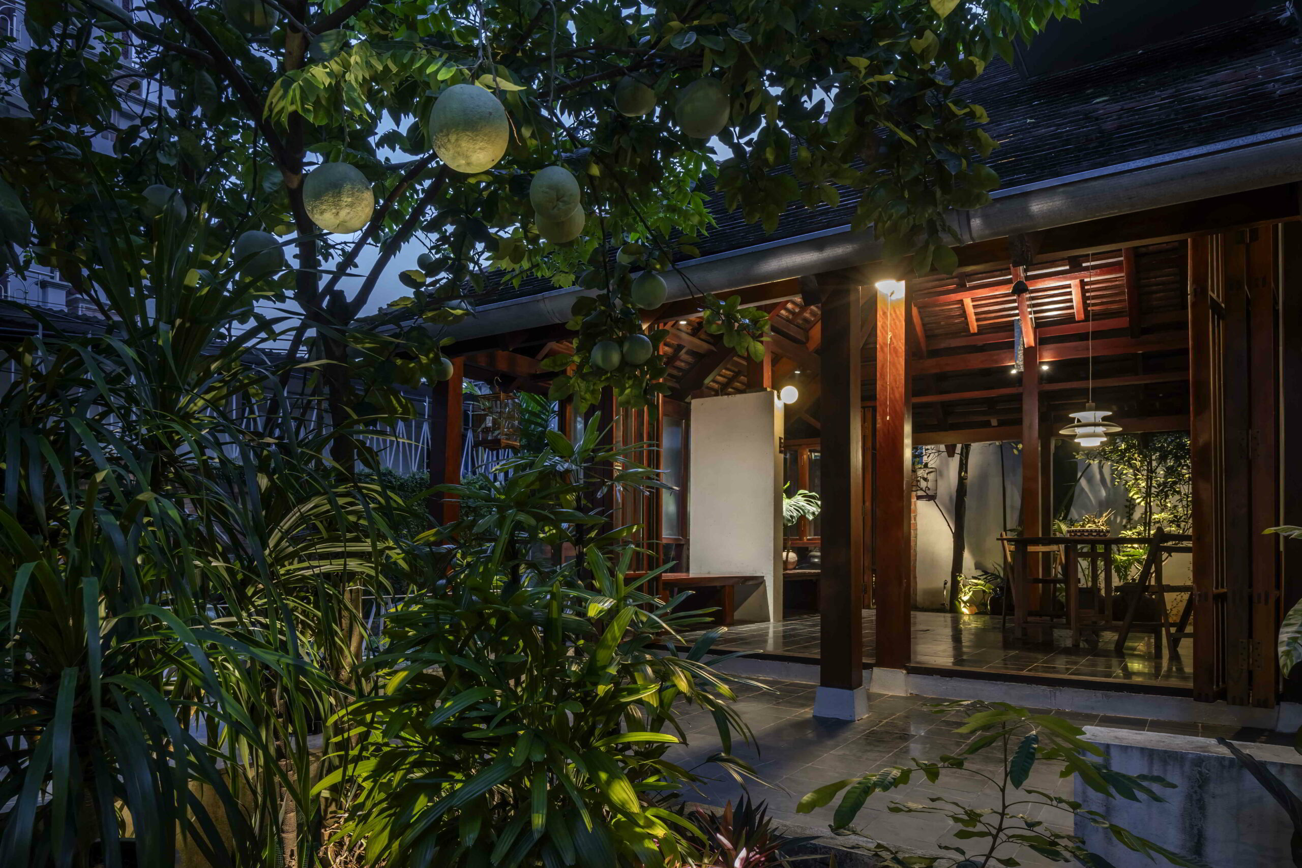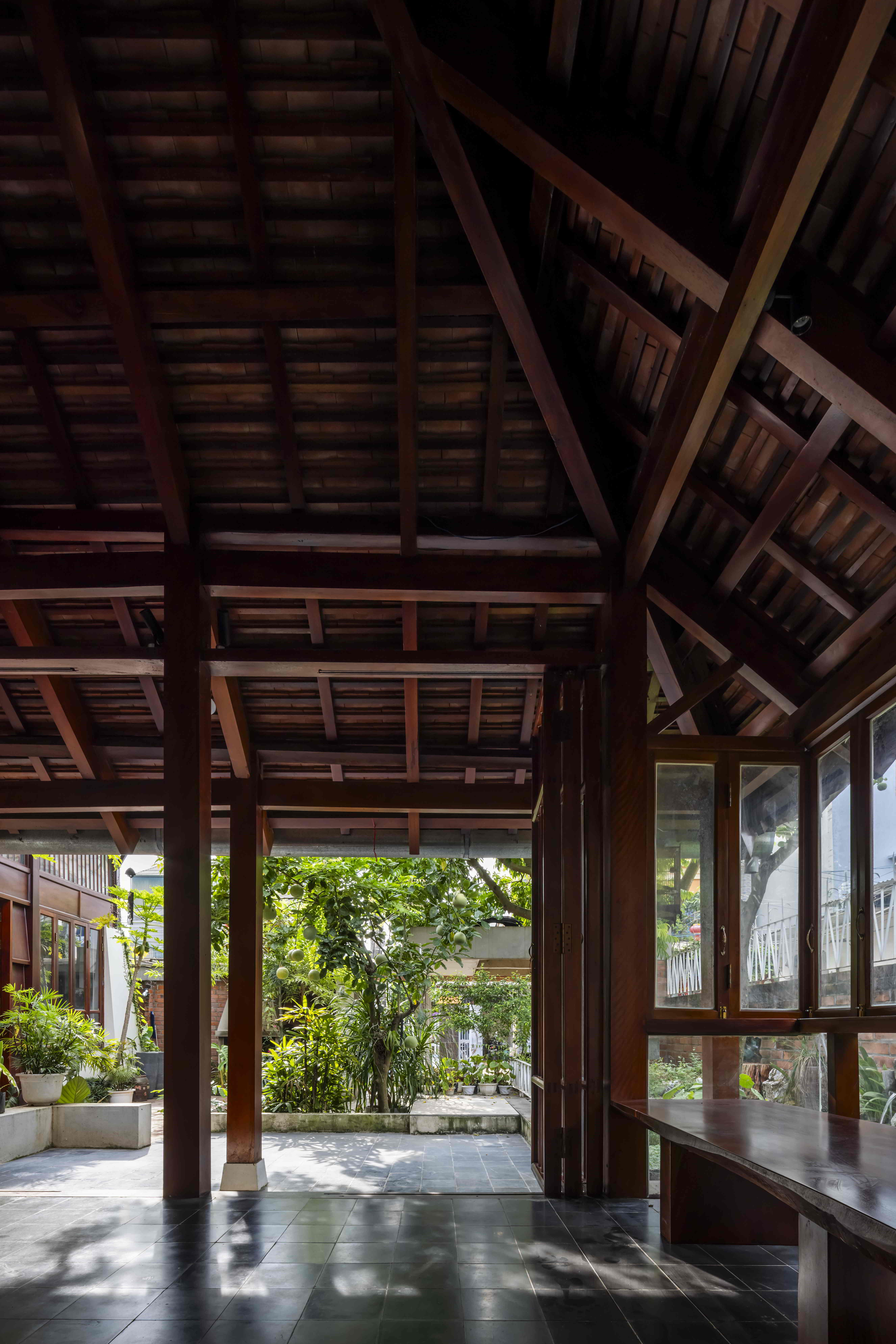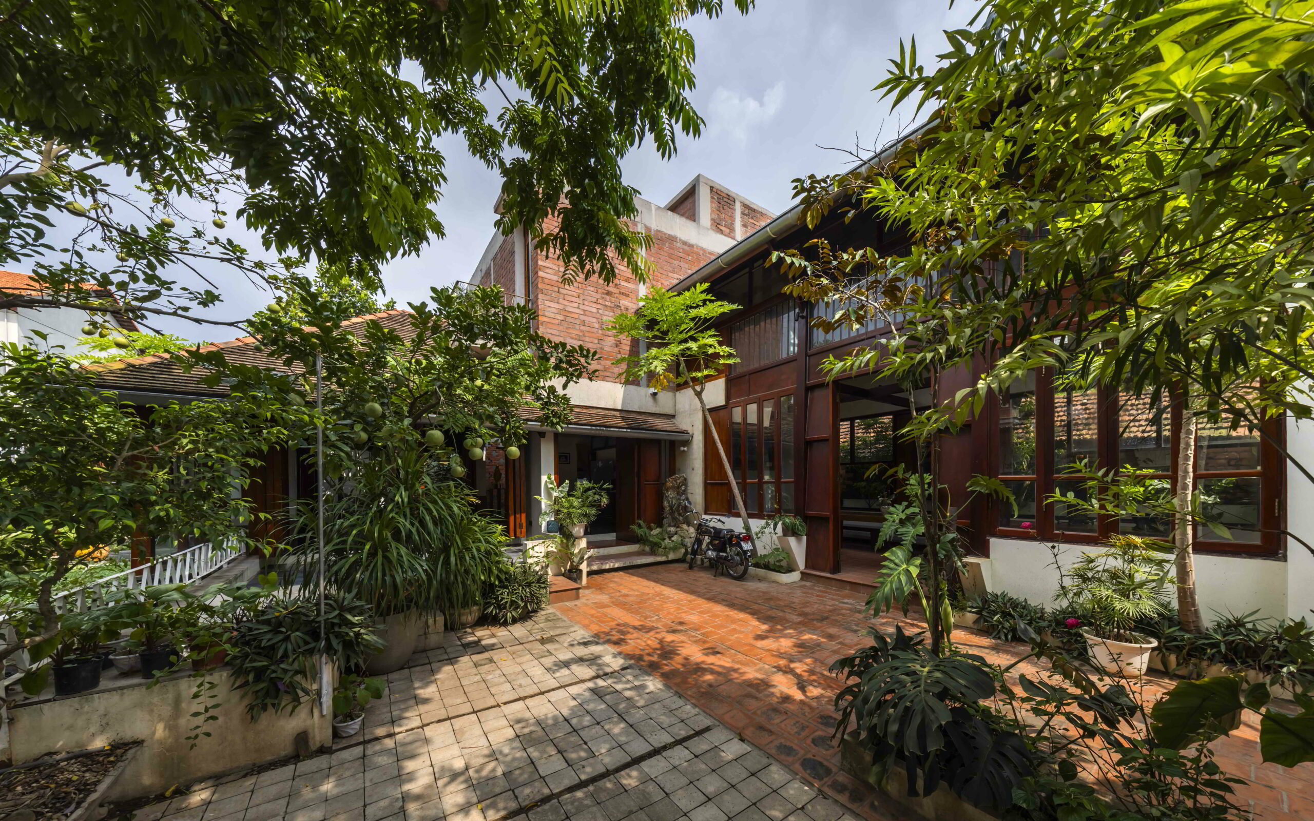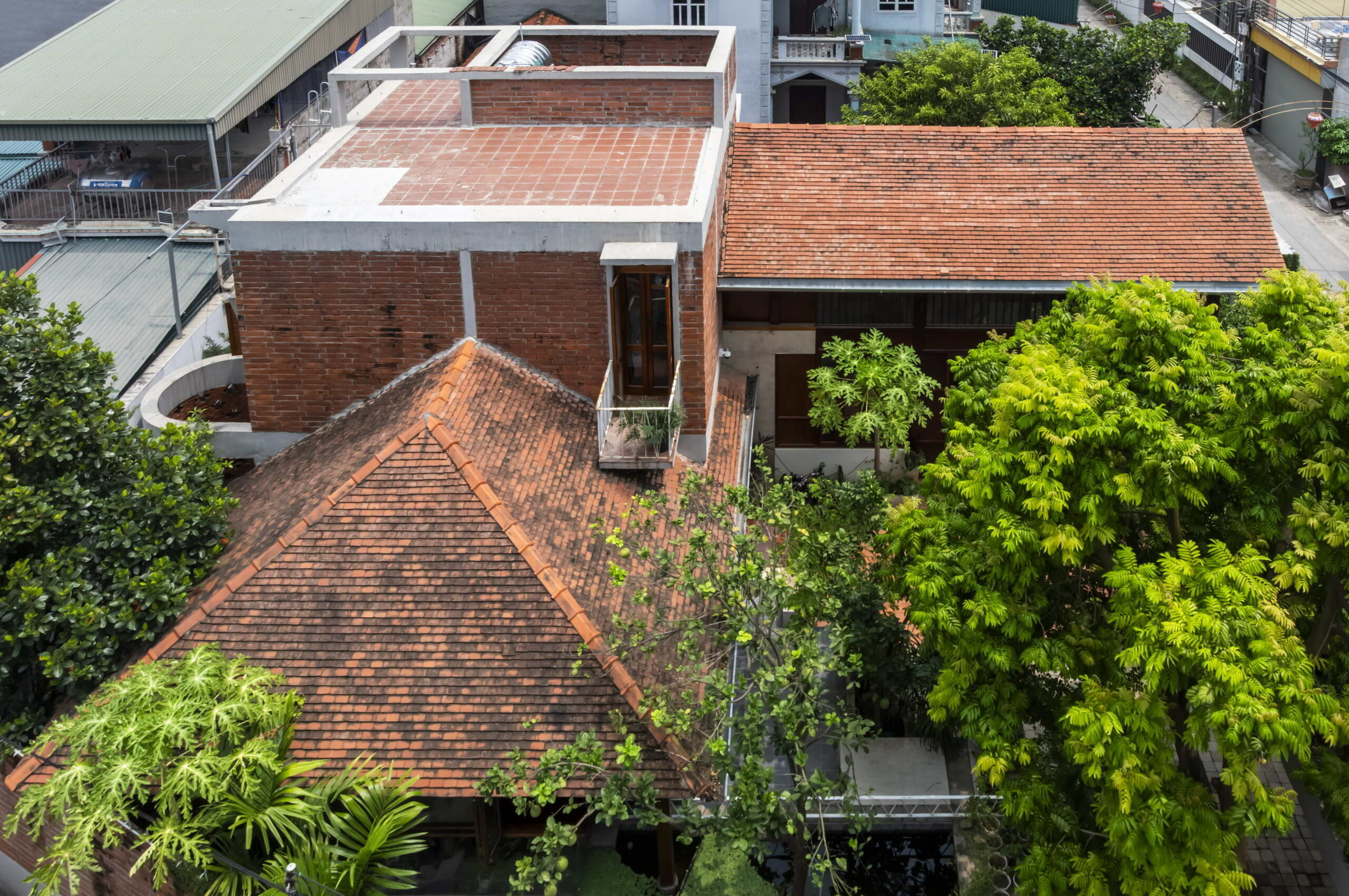 Lấy cảm hứng từ hình ảnh lò gạch nung lâu đời lân cận, thiết kế sử dụng gạch trần và ngói đỏ làm vật liệu chủ đạo, tạo nên sự kết nối hữu cơ với bối cảnh văn hóa địa phương. Cấu trúc mặt bằng được dẫn dắt bởi hệ thống cây xanh cổ thụ hơn 20 năm tuổi, giữ vai trò là “trục xương sống” điều tiết vi khí hậu và định hình các khoảng đóng – mở của không gian. Những yếu tố kinh điển của kiến trúc dân gian như hàng hiên, mặt nước và bếp củi được tái hiện khéo léo, không chỉ đáp ứng công năng mà còn khơi gợi xúc cảm về một chốn về bình yên.