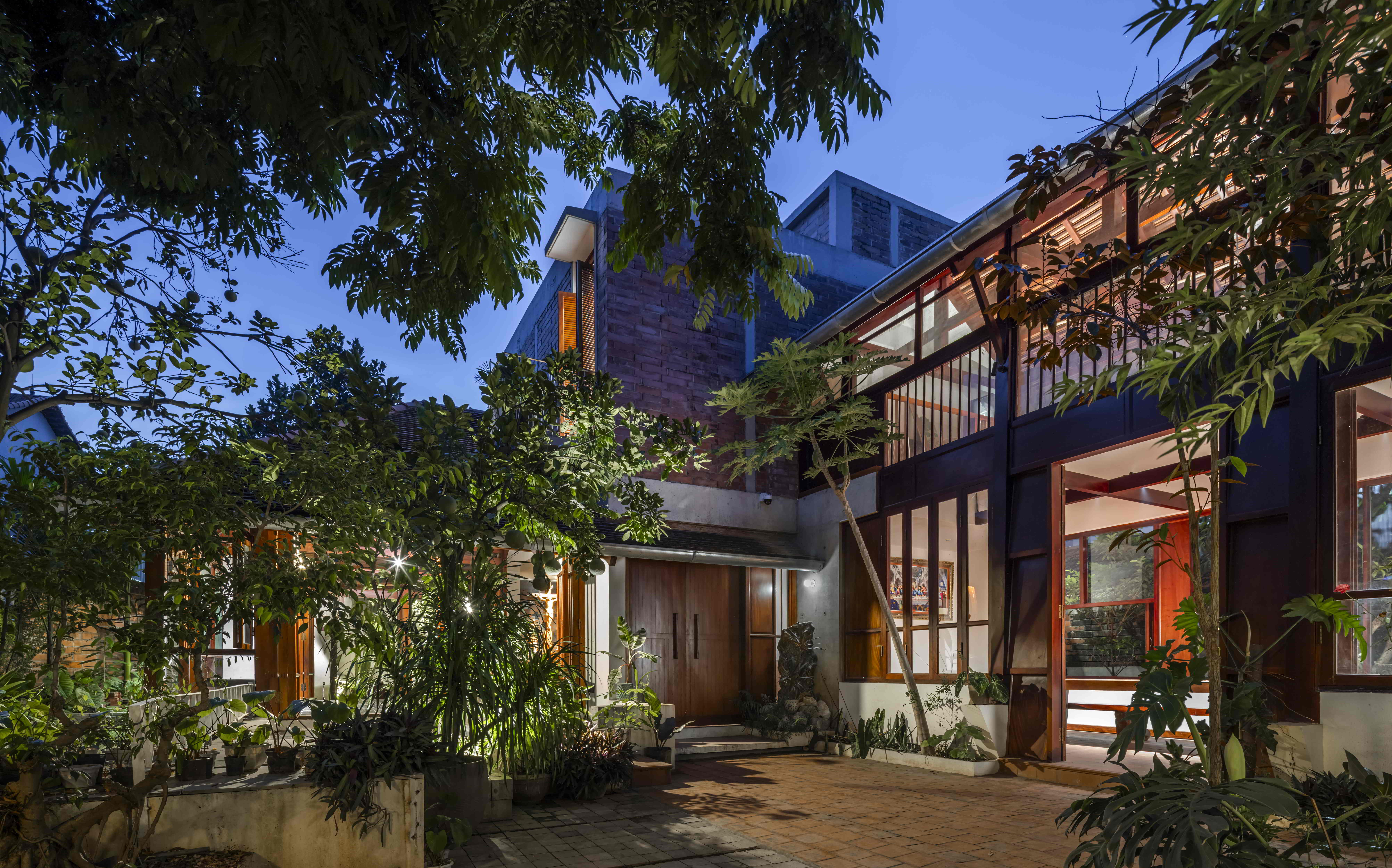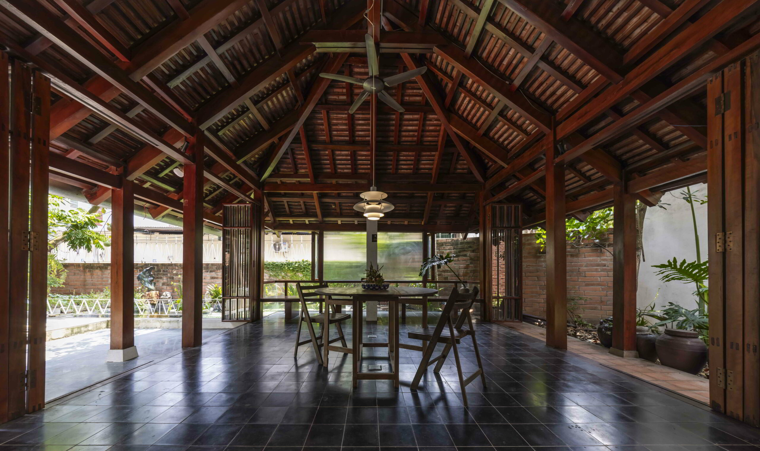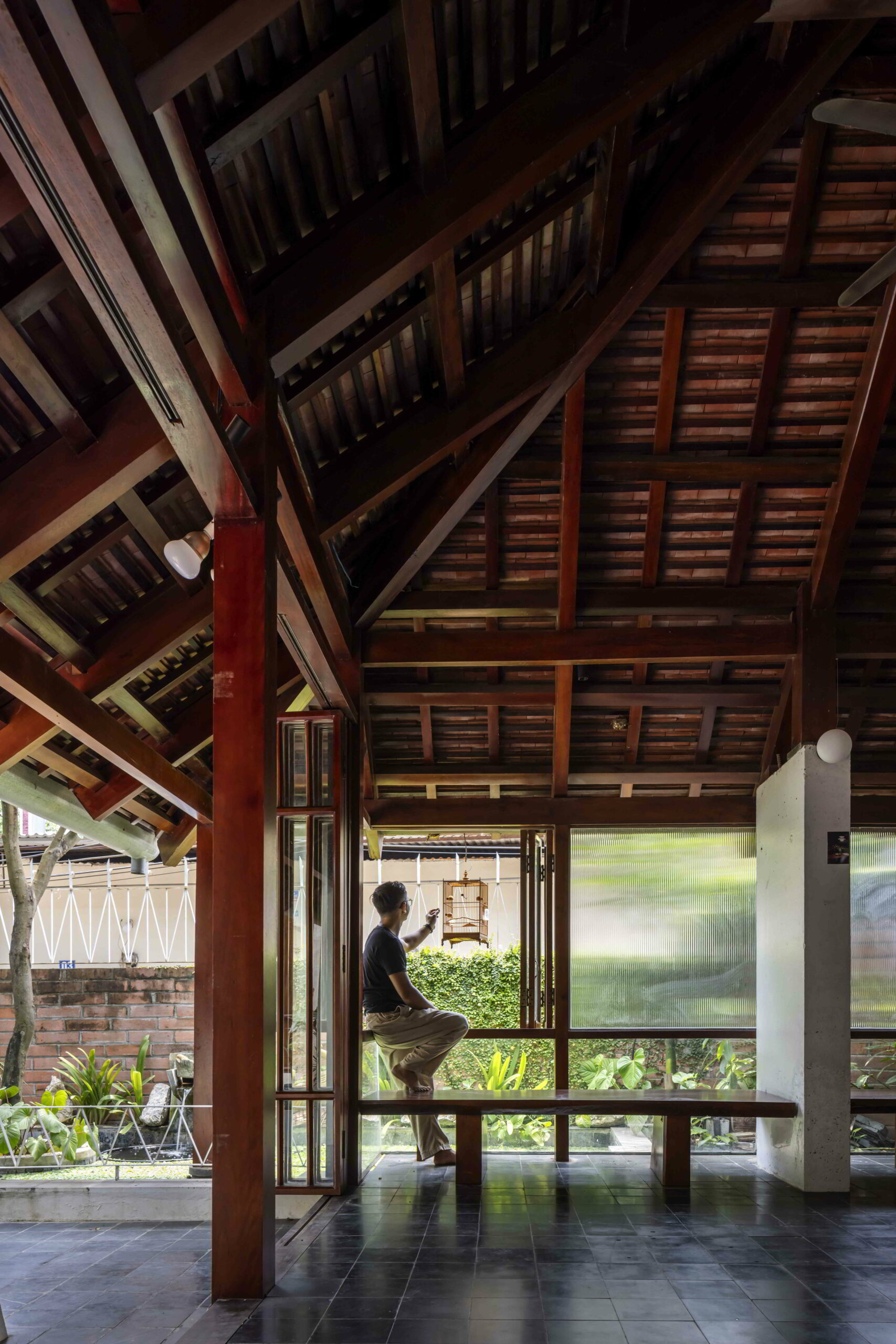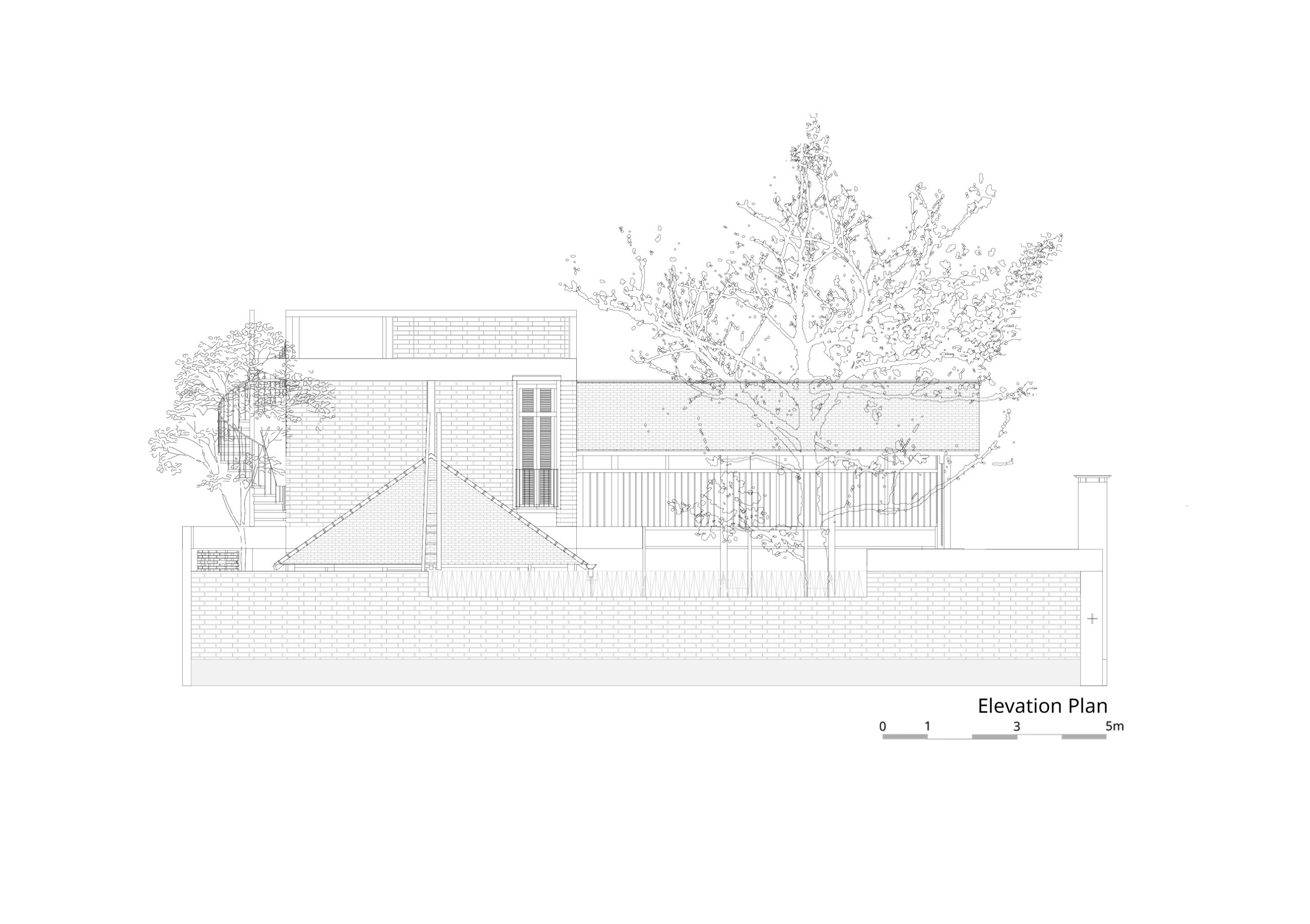 Lấy cảm hứng từ hình ảnh lò gạch nung lâu đời lân cận, thiết kế sử dụng gạch trần và ngói đỏ làm vật liệu chủ đạo, tạo nên sự kết nối hữu cơ với bối cảnh văn hóa địa phương. Cấu trúc mặt bằng được dẫn dắt bởi hệ thống cây xanh cổ thụ hơn 20 năm tuổi, giữ vai trò là “trục xương sống” điều tiết vi khí hậu và định hình các khoảng đóng – mở của không gian. Những yếu tố kinh điển của kiến trúc dân gian như hàng hiên, mặt nước và bếp củi được tái hiện khéo léo, không chỉ đáp ứng công năng mà còn khơi gợi xúc cảm về một chốn về bình yên.