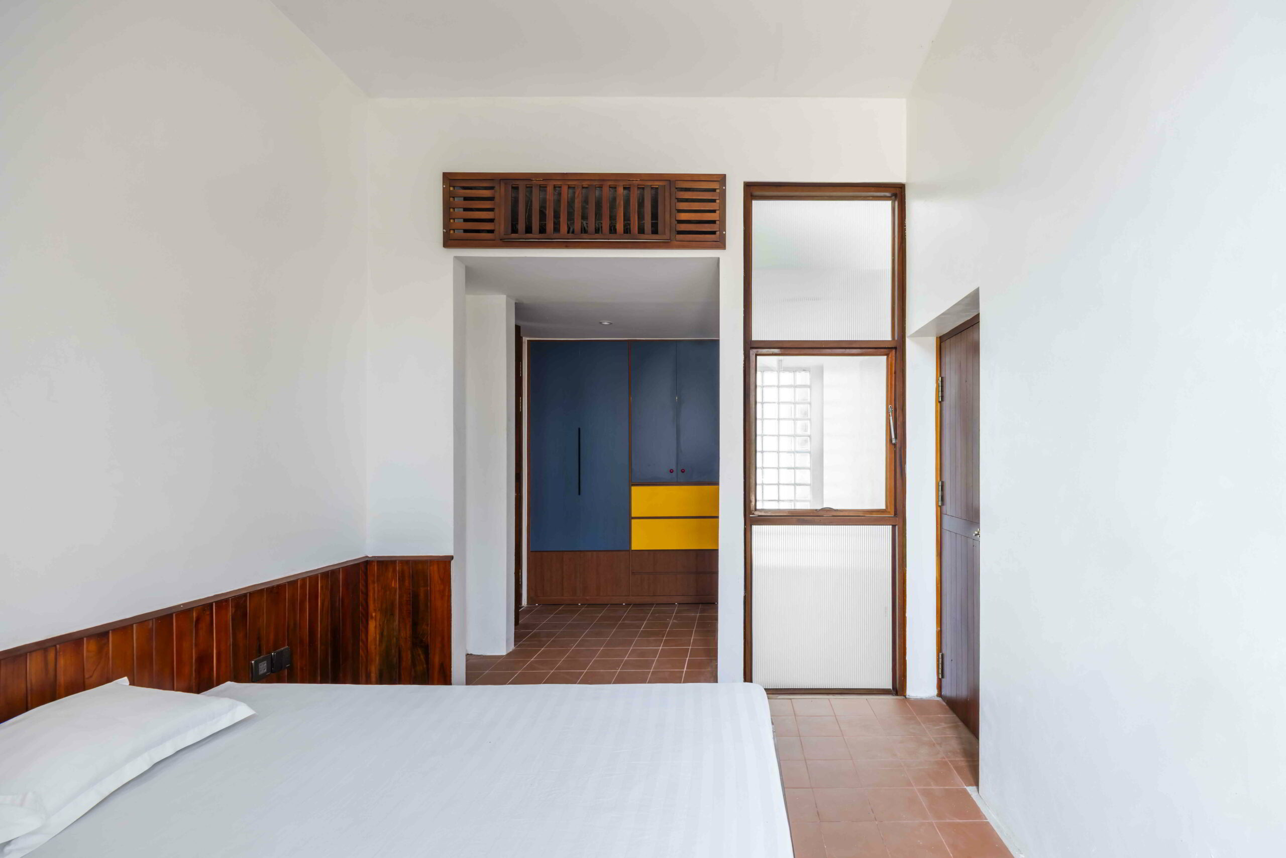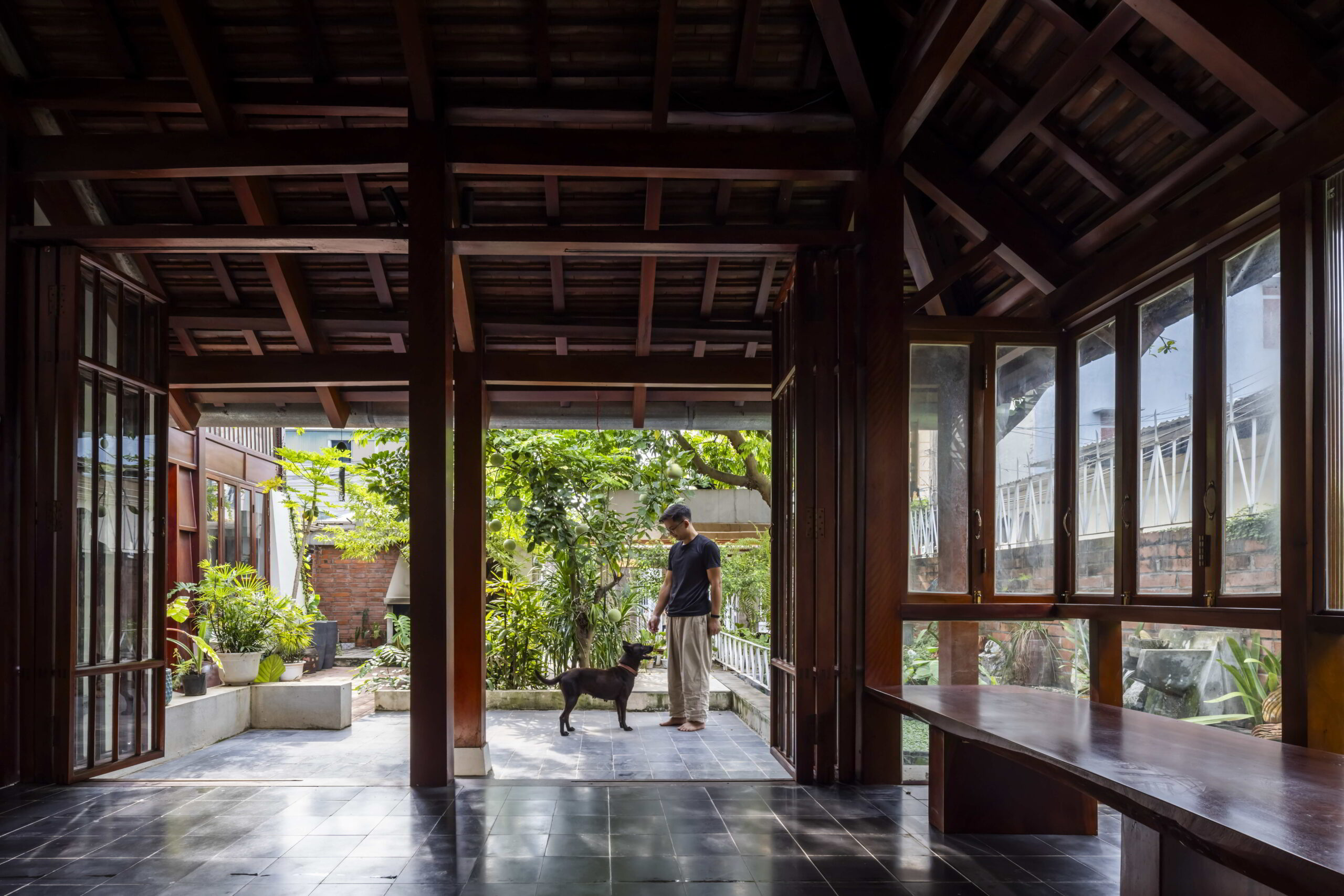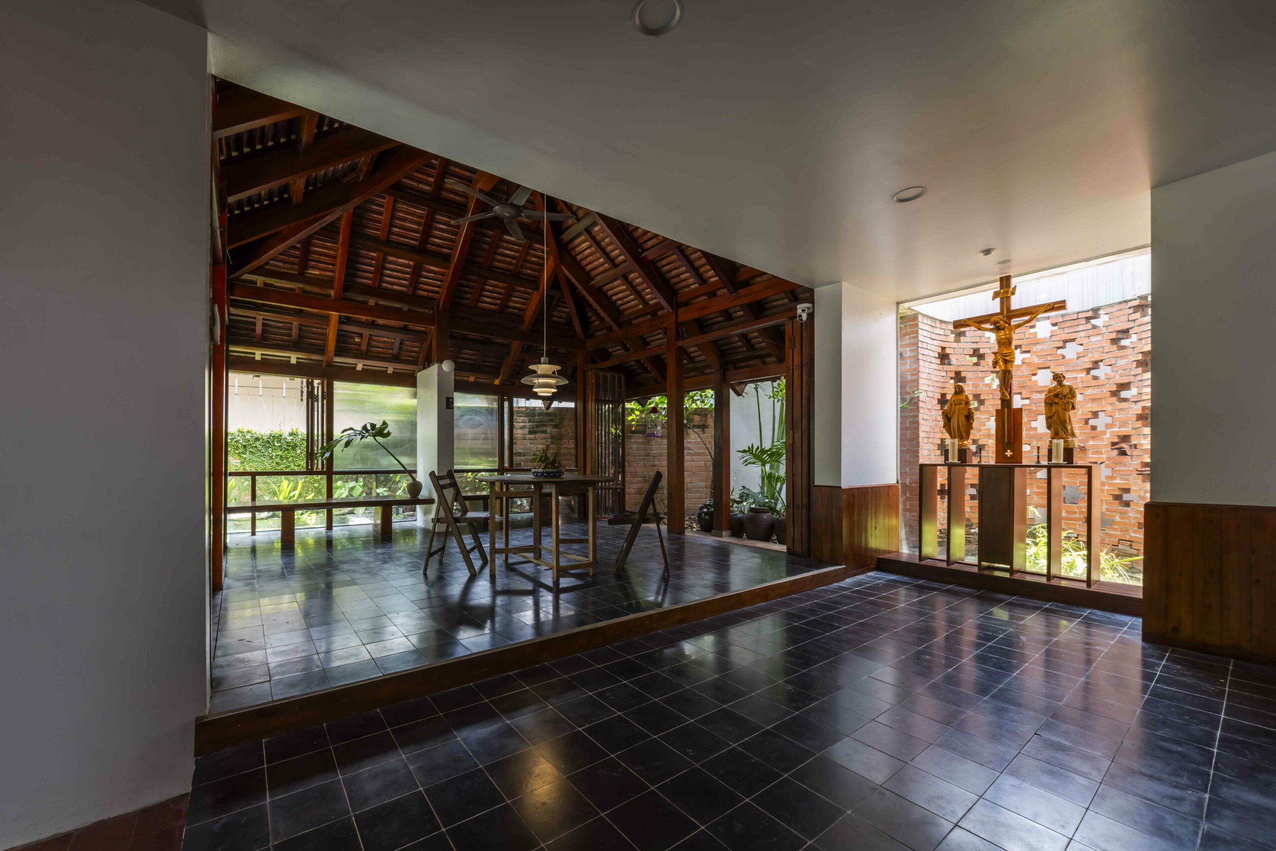 Bố cục không gian tập trung ưu tiên tầng trệt để tối ưu hóa sự tương tác giữa người già và trẻ nhỏ. Các khu vực chức năng gồm phòng khách, không gian làm việc, bếp trong – ngoài và phòng ngủ được tính toán diện tích vừa đủ, tránh lãng phí diện tích theo tư duy “nhà cao cửa rộng” cũ – vốn thường dẫn đến việc biến không gian ở thành kho chứa nông cụ. Việc tận dụng vật liệu bản địa cùng tay nghề thợ thủ công tại chỗ giúp công trình đạt được sự hài hòa về chi phí và thẩm mỹ.