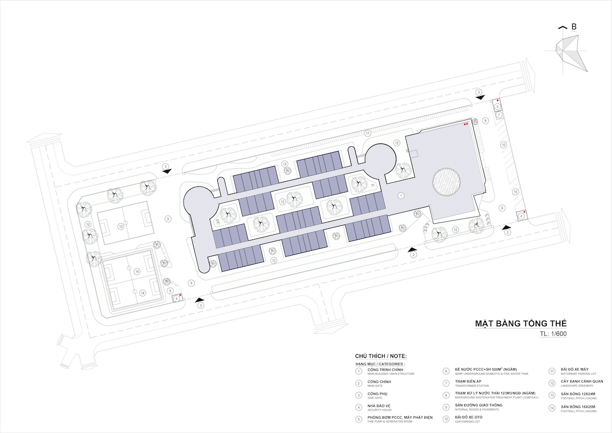 Các giải pháp thiết kế của dự án tập trung vào tính bền vững và trải nghiệm người dùng. Hệ lam che nắng được bố trí hợp lý nhằm giảm bức xạ nhiệt trực tiếp, đồng thời mở ra khả năng tích hợp năng lượng tái tạo trong tương lai. Nguồn nước được quản lý hiệu quả thông qua việc thu gom và tái sử dụng nước mưa cho tưới cây, kết hợp các thiết bị tiết kiệm nước và cảnh quan ưu tiên cây bản địa.
