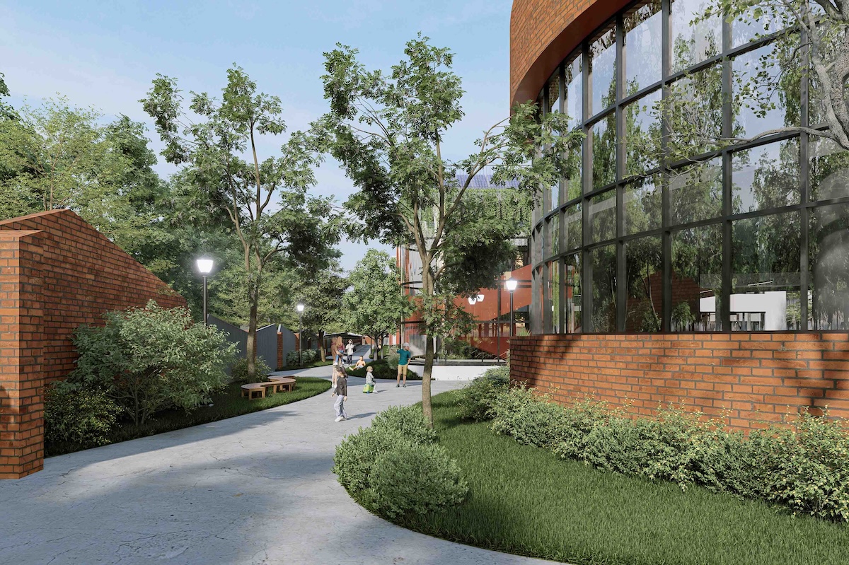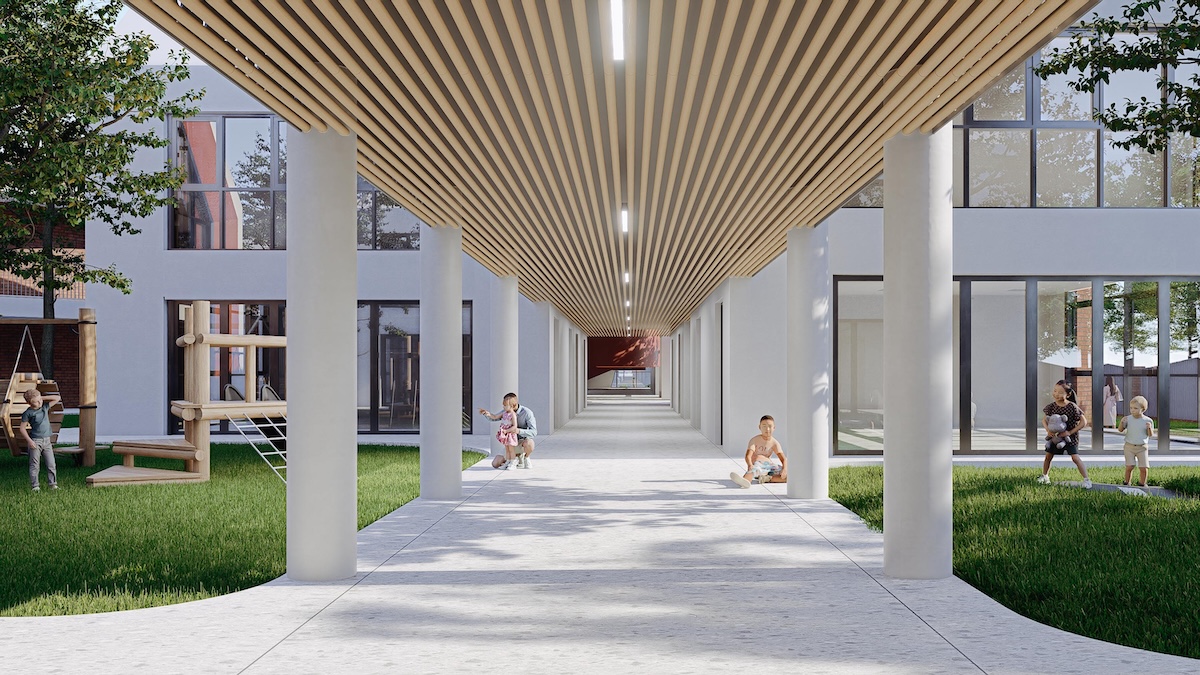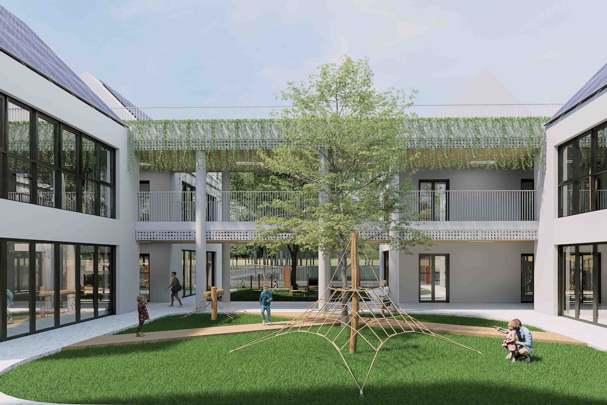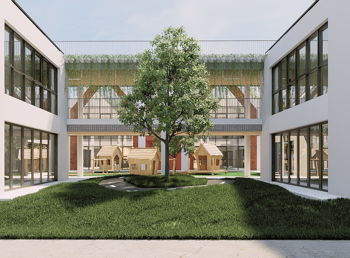 Vật liệu sử dụng chủ yếu là các vật liệu bền vững, thân thiện môi trường như gạch nung, gỗ, với giải pháp hoàn thiện có độ bền cao và ít bảo trì. Không gian học tập được tổ chức thông thoáng, giàu ánh sáng tự nhiên và mảng xanh, góp phần cải thiện vi khí hậu và chất lượng không khí trong nhà. Tổng thể khu vực được quy hoạch với mật độ xây dựng hợp lý, tăng cường không gian mở nhằm giảm hiệu ứng đảo nhiệt. Trên hết, dự án đề cao tính sáng kiến, trong đó kiến trúc không chỉ là không gian sử dụng mà còn trở thành công cụ giáo dục trực quan, giúp học sinh hình thành và trải nghiệm lối sống xanh, bền vững ngay từ những năm đầu đời.