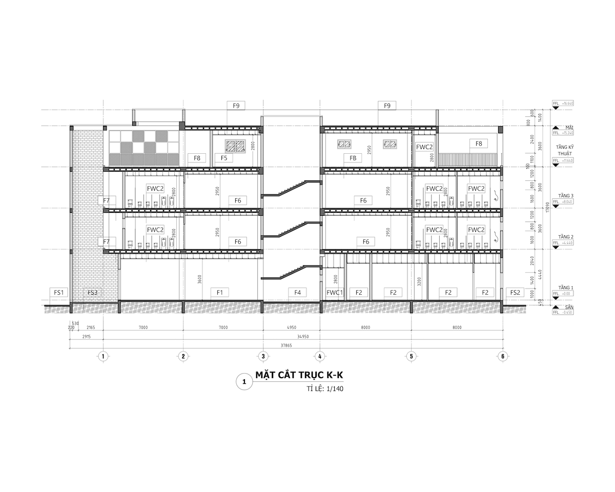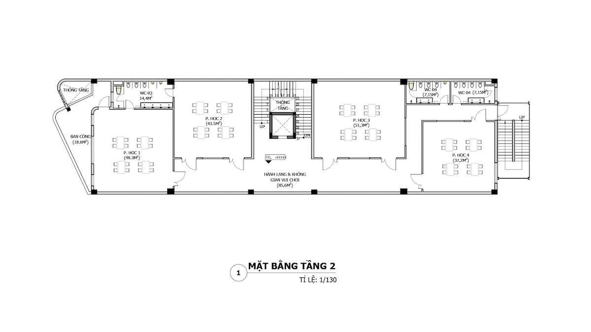 Về kiến trúc, công trình sử dụng gạch trần không trát & gạch giả cổ ốp làm vật liệu chủ đạo, tạo cảm giác bền vững, thân thiện và bản sắc thị giác rõ ràng. Hệ khung bê tông cốt thép tạo hình như các khối rối xếp chồng ngẫu nhiên và hệ lam kim loại màu vàng – cam – xanh tạo nhịp điệu thị giác sinh động, phá vỡ sự khô cứng thường thấy ở công trình trường học. Trước đặc thù khu đất dài, hai mặt giáp nhà dân và bị hạn chế mở cửa theo quy định phòng cháy chữa cháy, iDesign Việt Nam lựa chọn giải pháp không gian thông tầng trung tâm nhằm đưa ánh sáng và thông gió tự nhiên lan tỏa sâu vào bên trong, đồng thời đóng vai trò là trục kết nối không gian theo chiều đứng.
