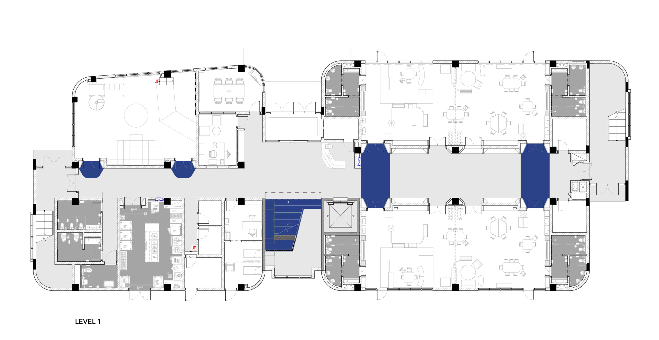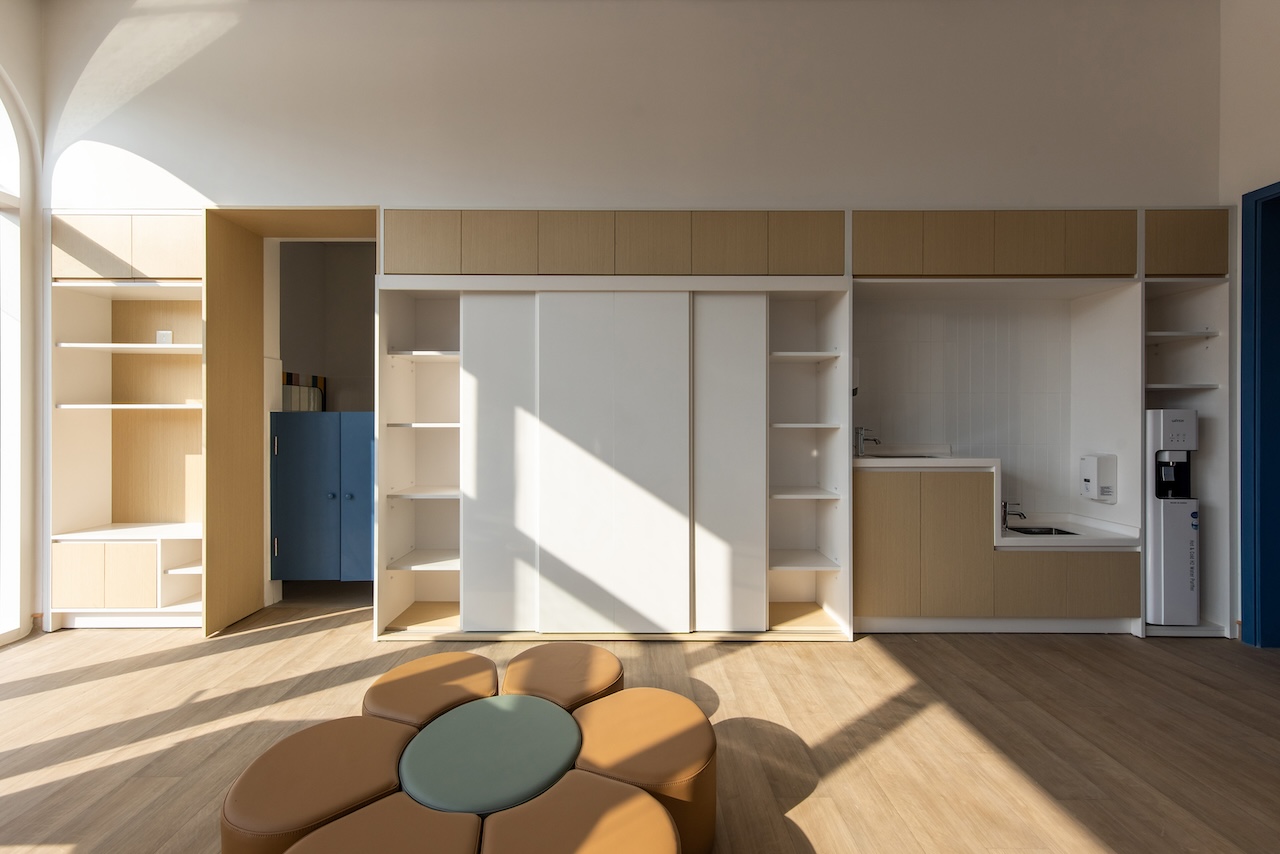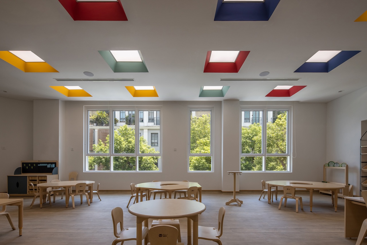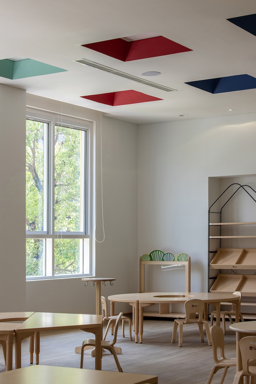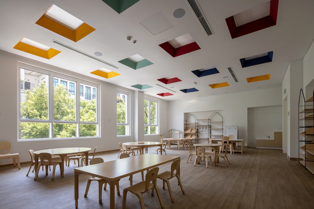 Không gian lớp học được bố trí ở một phía của cầu thang. Mỗi 2 lớp được ngăn cách nhau bằng hệ cửa trượt ở chính giữa nhằm tăng tính linh hoạt ghép lớp khi cần thiết. Hệ tủ sát tường bao gồm đầy đủ công năng để đạt tiêu chuẩn của Dwight, với các thiết bị được giấu phía sau các cánh cửa. Gian vệ sinh liên thông với phòng học được thiết kế với tường gạch men nhiều màu sắc để tạo cảm giác vui vẻ cho trẻ.