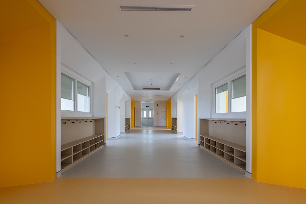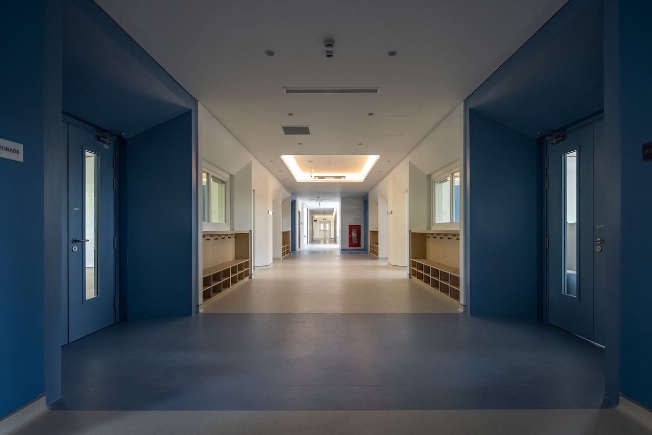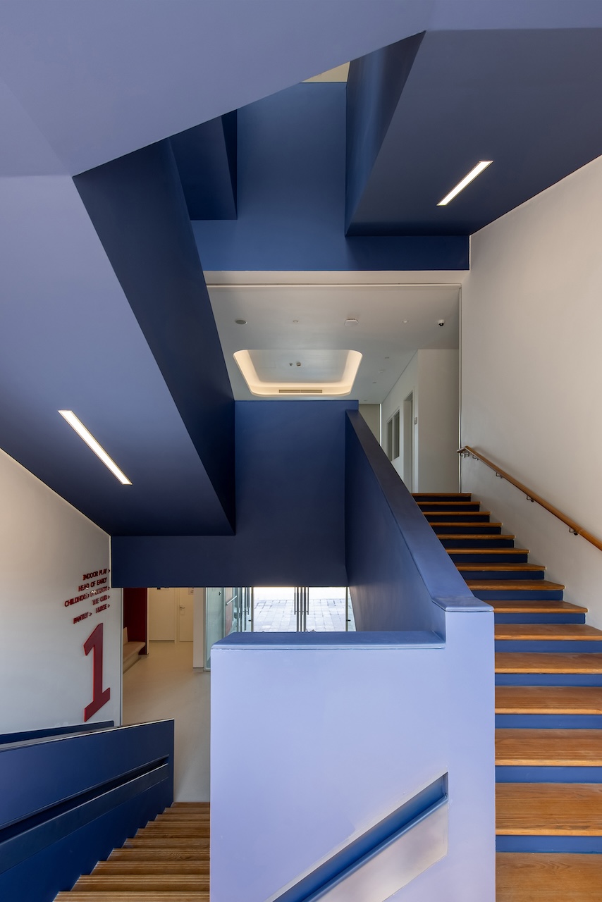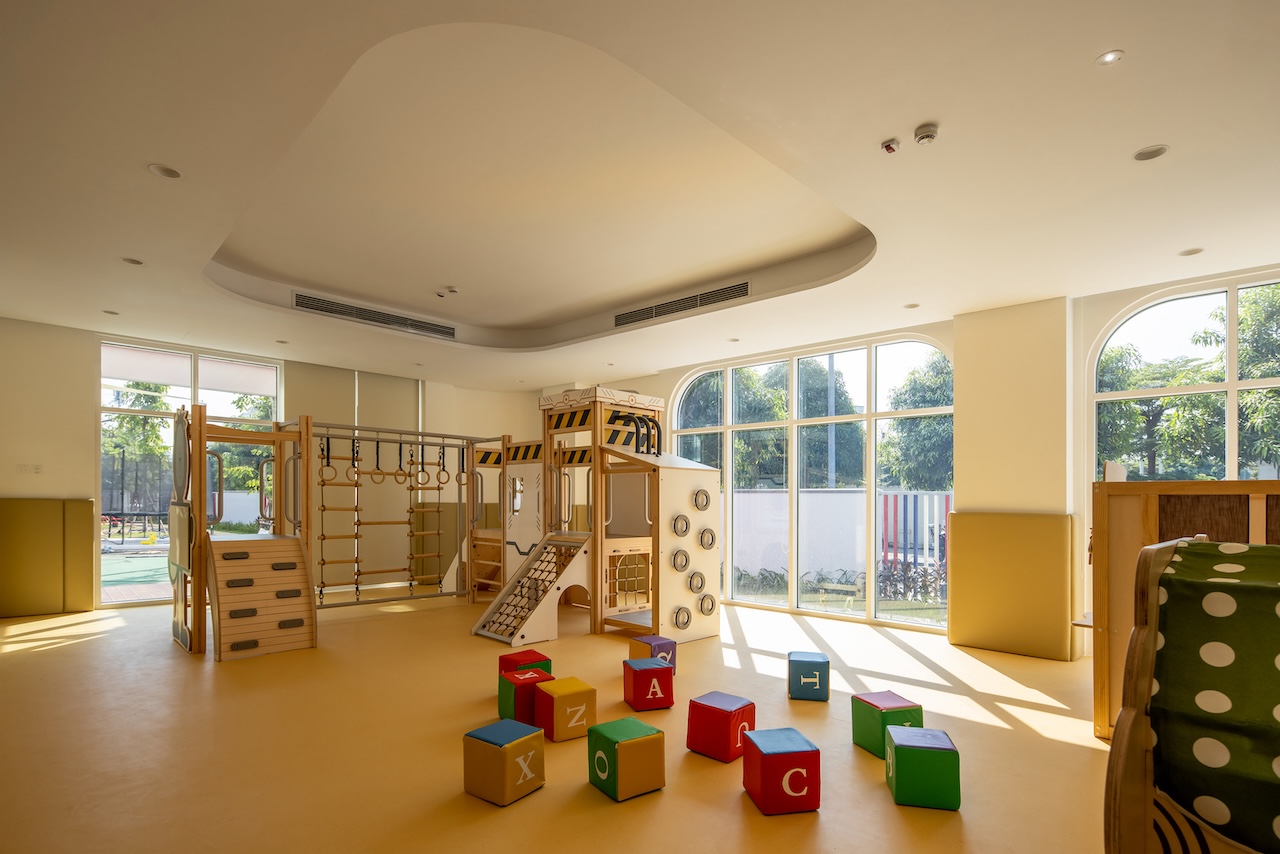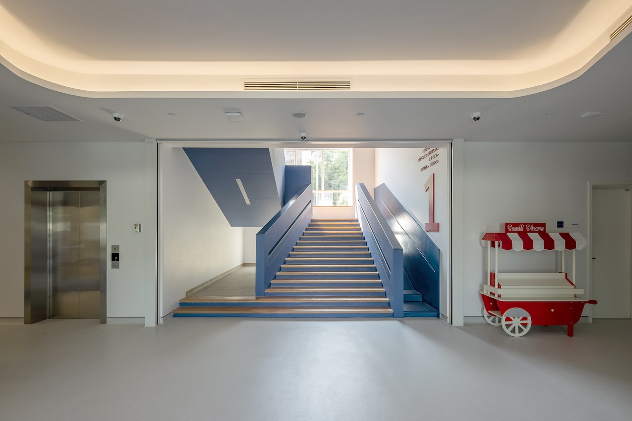 Điểm nhấn chính của không gian nội thất là cầu thang màu xanh ở trung tâm, kết hợp với cầu tuột nhỏ để tăng tường tác cho trẻ. Mỗi một sảnh nghỉ ở các tầng luôn có chỗ ngồi và cây xanh nhằm mang đến cảm giác thư giãn và là nơi trẻ có thể nô đùa.