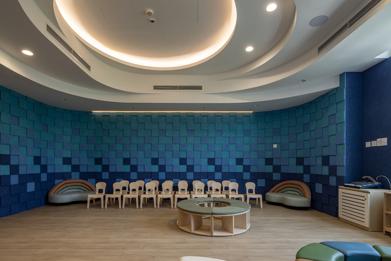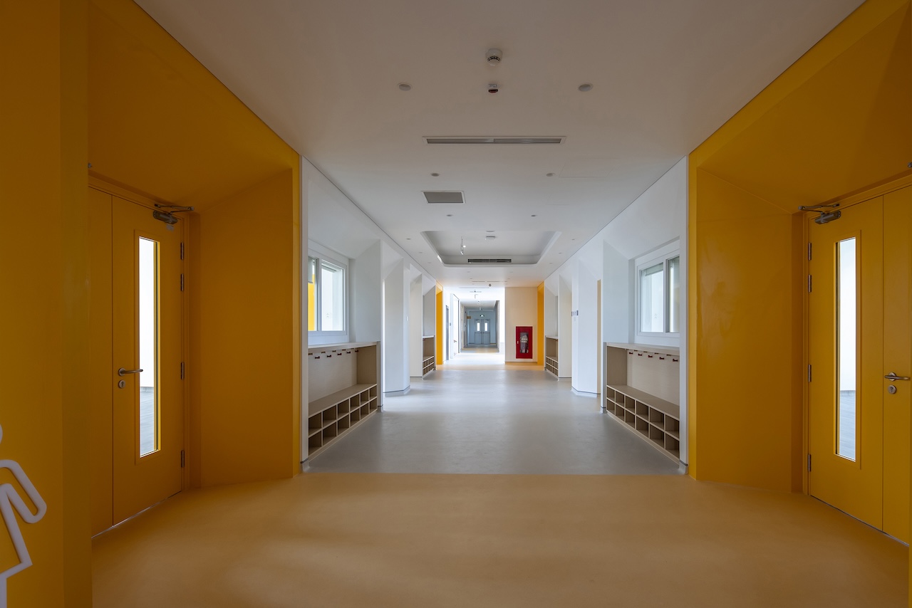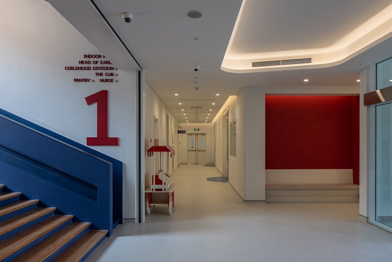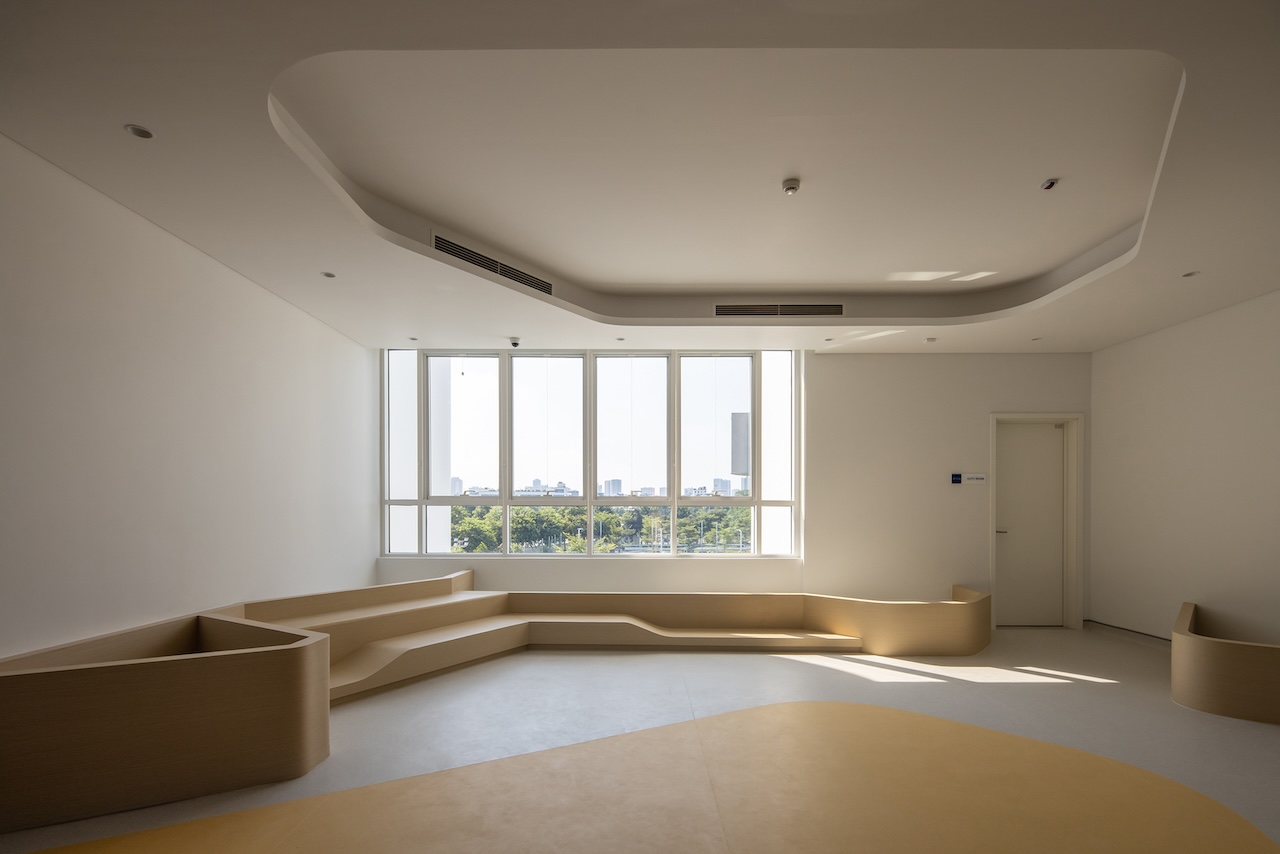 Điểm nhấn chính của không gian nội thất là cầu thang màu xanh ở trung tâm, kết hợp với cầu tuột nhỏ để tăng tường tác cho trẻ. Mỗi một sảnh nghỉ ở các tầng luôn có chỗ ngồi và cây xanh nhằm mang đến cảm giác thư giãn và là nơi trẻ có thể nô đùa.