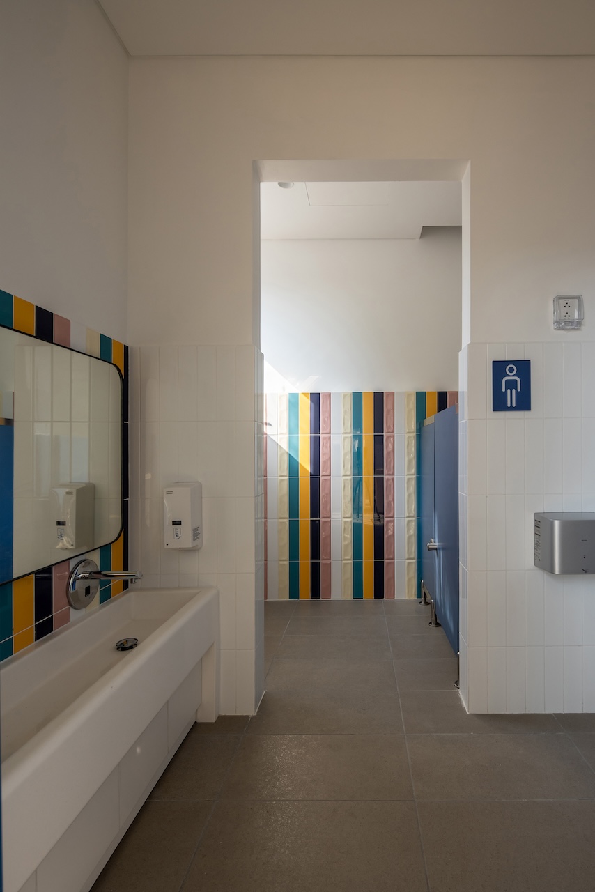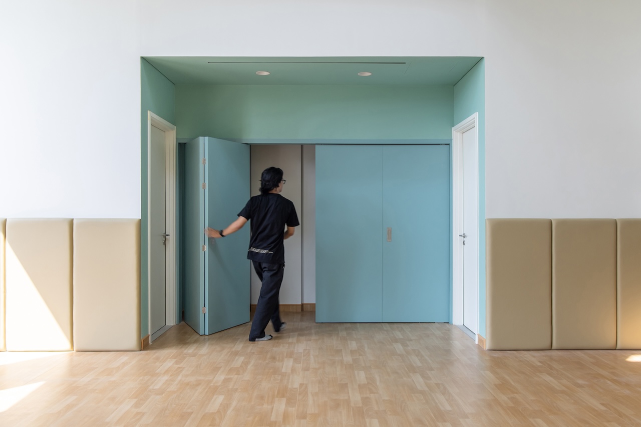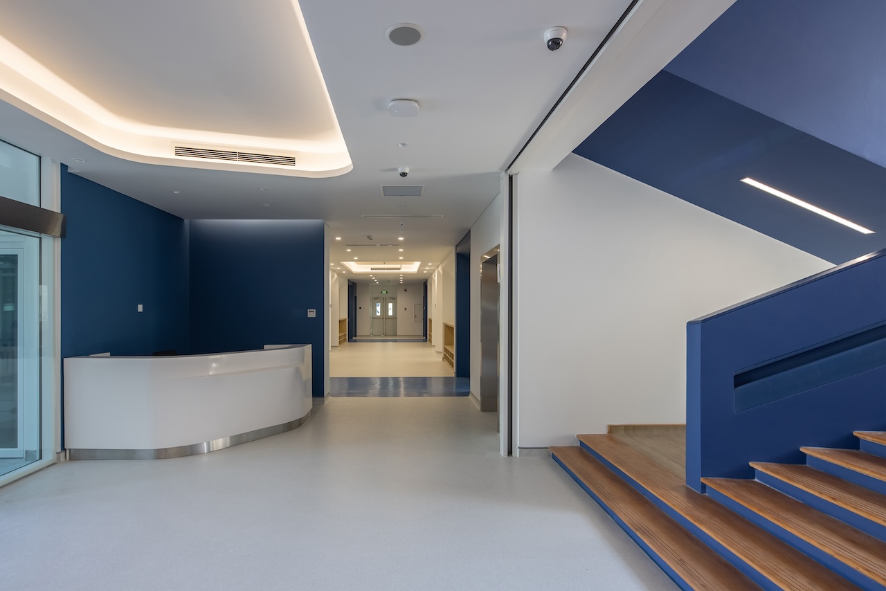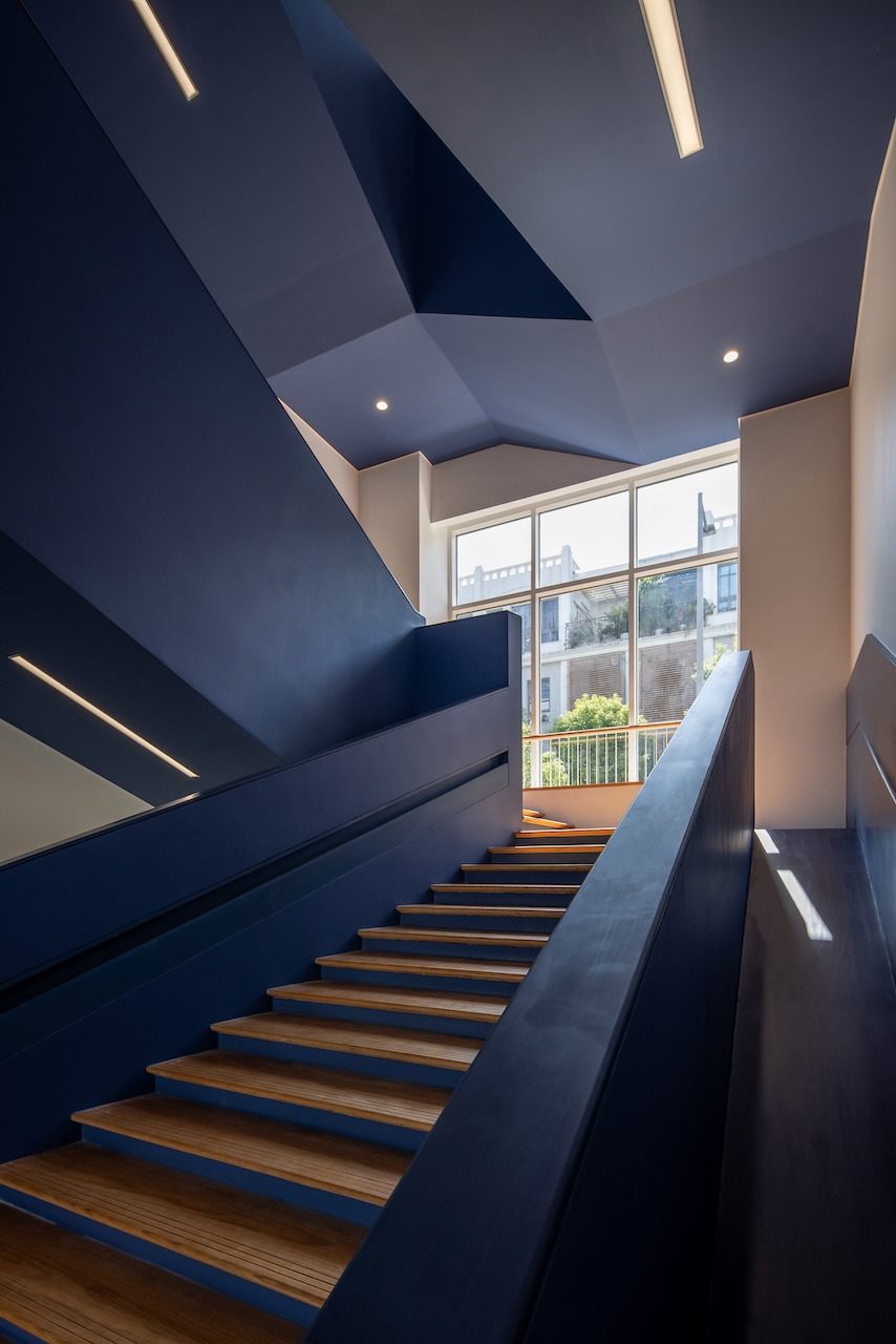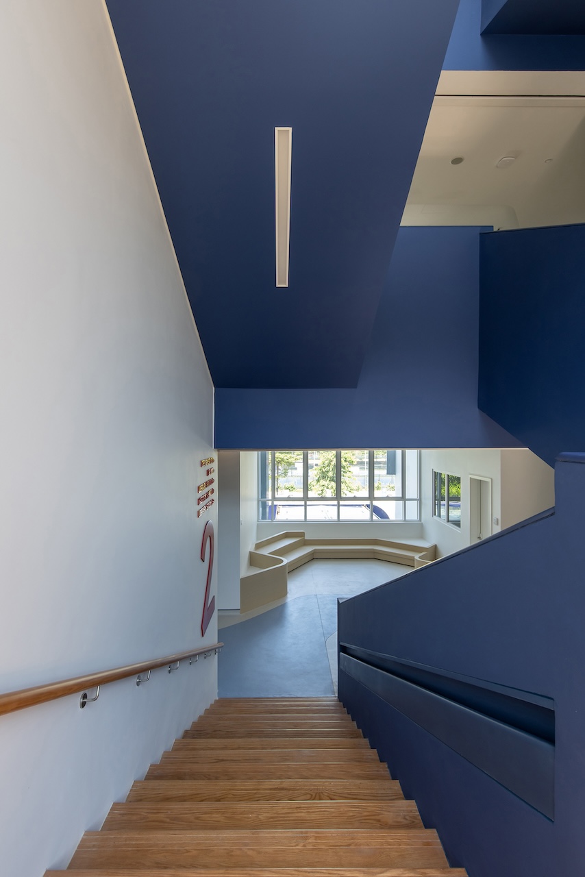 Điểm nhấn chính của không gian nội thất là cầu thang màu xanh ở trung tâm, kết hợp với cầu tuột nhỏ để tăng tường tác cho trẻ. Mỗi một sảnh nghỉ ở các tầng luôn có chỗ ngồi và cây xanh nhằm mang đến cảm giác thư giãn và là nơi trẻ có thể nô đùa.