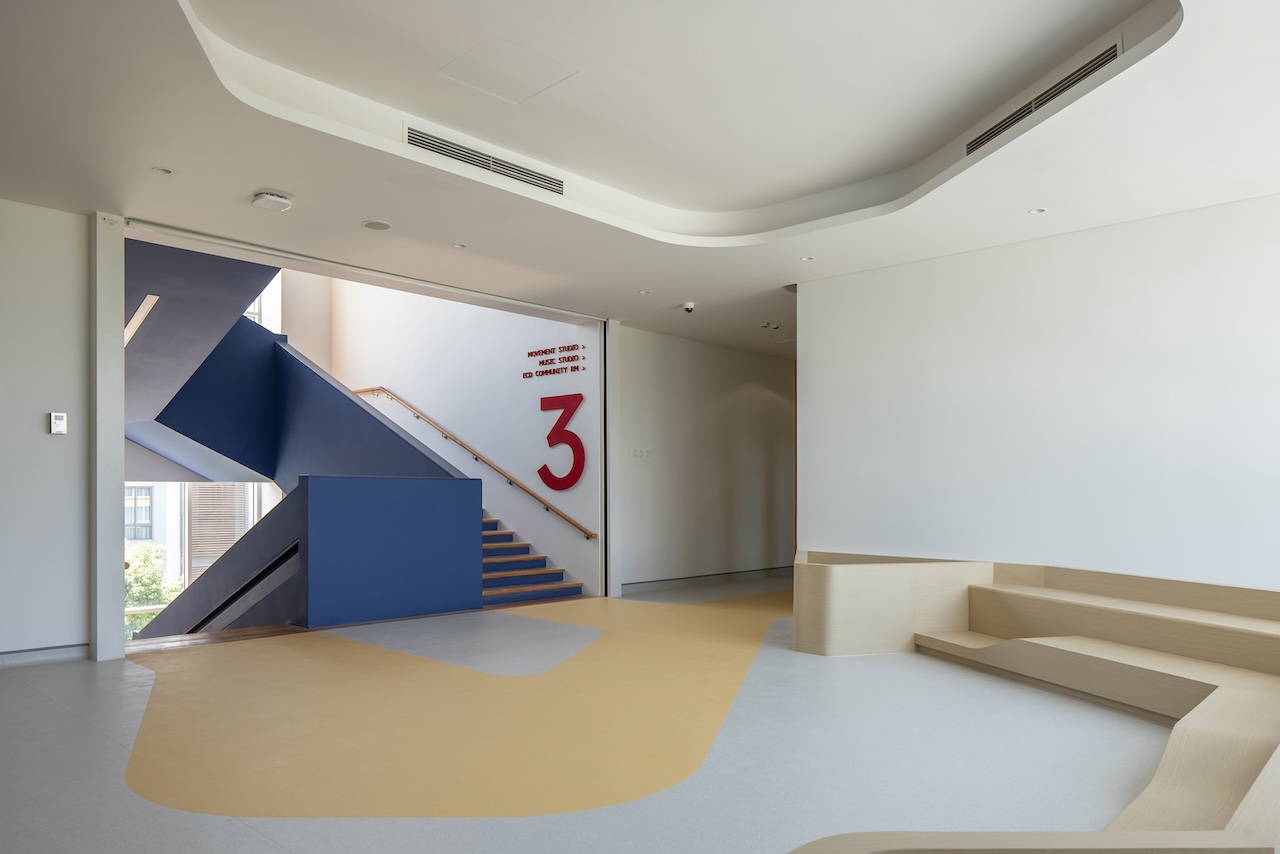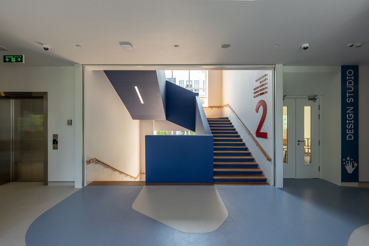 Ở phía còn lại của cầu thang là các không gian chức năng học chuyên đề. Mỗi không gian lớp học chuyên đề hướng đến mang lại trải nghiệm đặc biệt về thị giác, giúp trẻ có thể phân biệt được đang ở phòng nào thông qua thiết kế không gian: sàn màu cam cho phòng chơi trong nhà, các ô trần nhiều màu sắc của phòng Sáng Tạo, ánh sáng mái cho phòng Biểu Diễn và trần xoắn ốc với tường trang âm chuyển màu cho phòng Âm Nhạc.