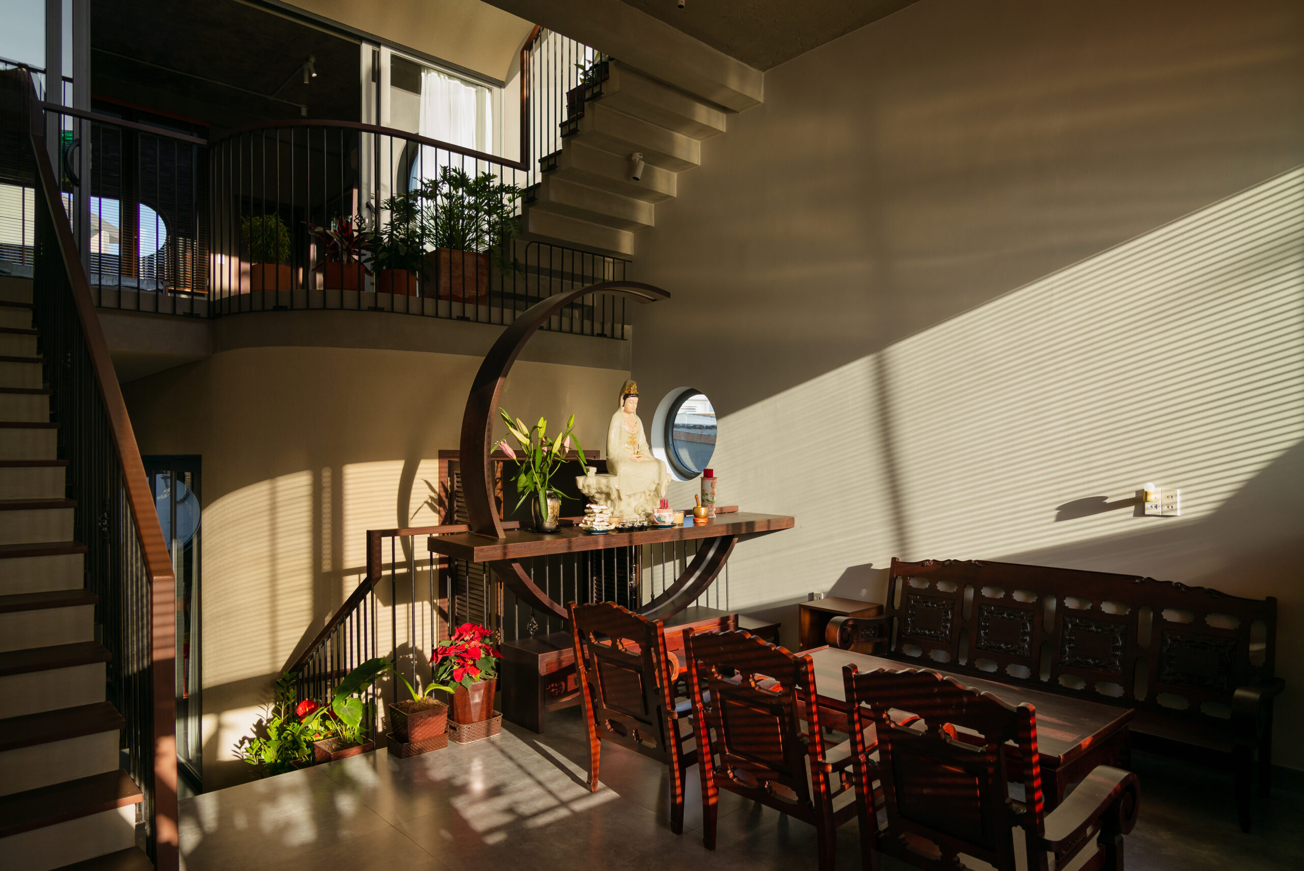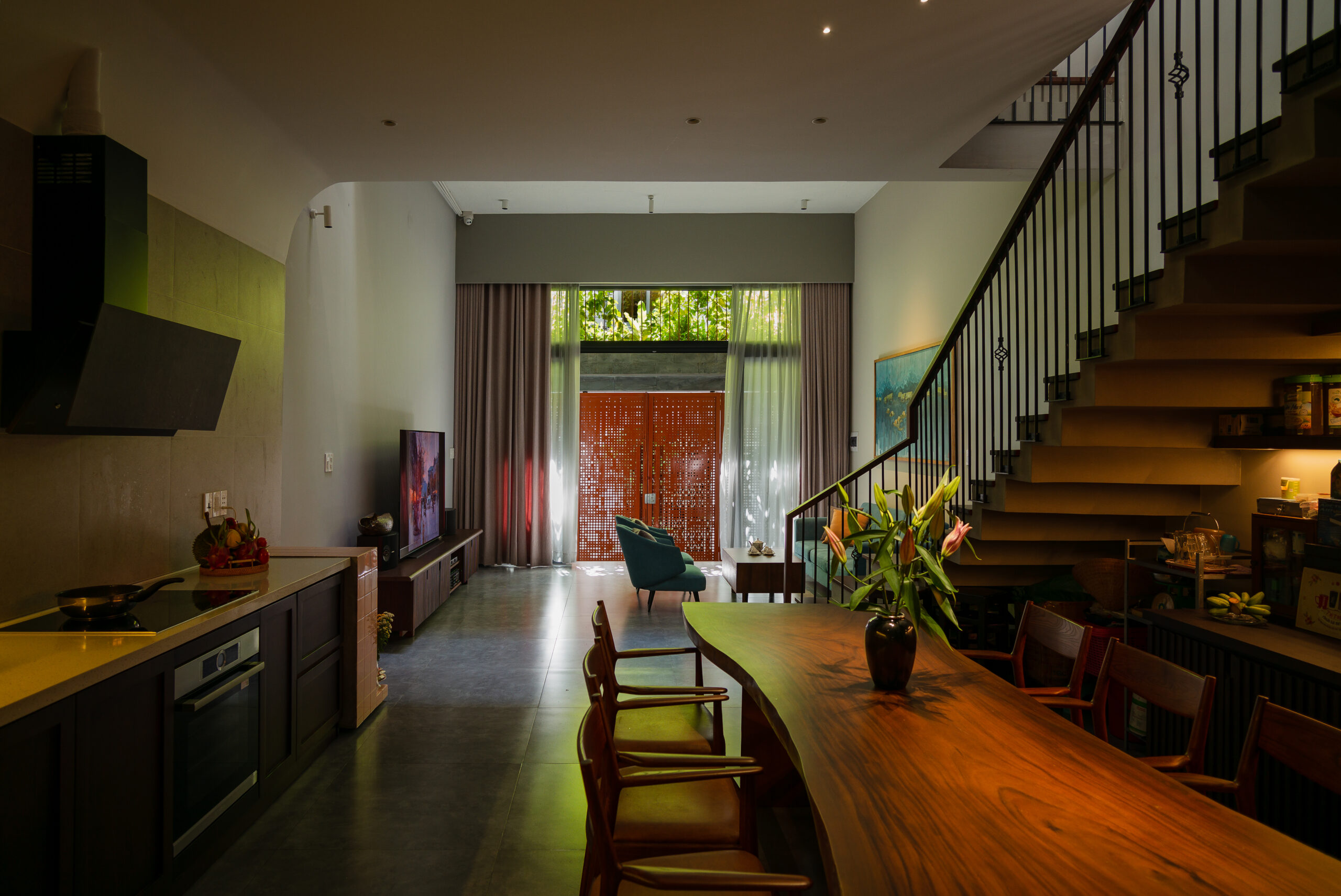 Việc phân bổ cấu trúc không gian trong ngôi nhà hướng đến sự đơn giản, đủ chỗ cho không gian sử dụng. Những khoảng thông tầng kết nối giúp lấy sáng, đối lưu gió và cây xanh là những giải pháp cần thiết cho ngôi nhà.