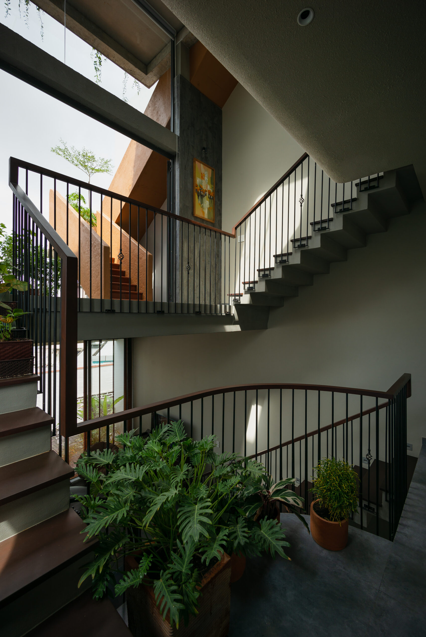 Không gian kết thúc bằng một hệ cầu thang lên tầng sân thượng. Vị trí giao thông trên trục cầu thang được bố trí những chậu cây xanh giúp gia chủ kết nối với thiên nhiên trong khi di chuyển.