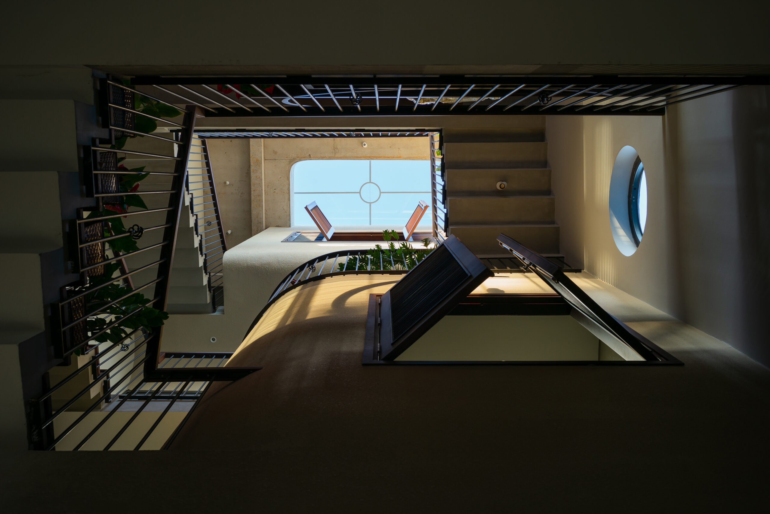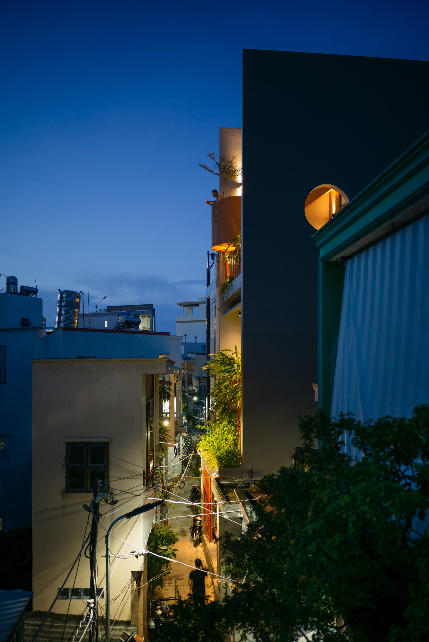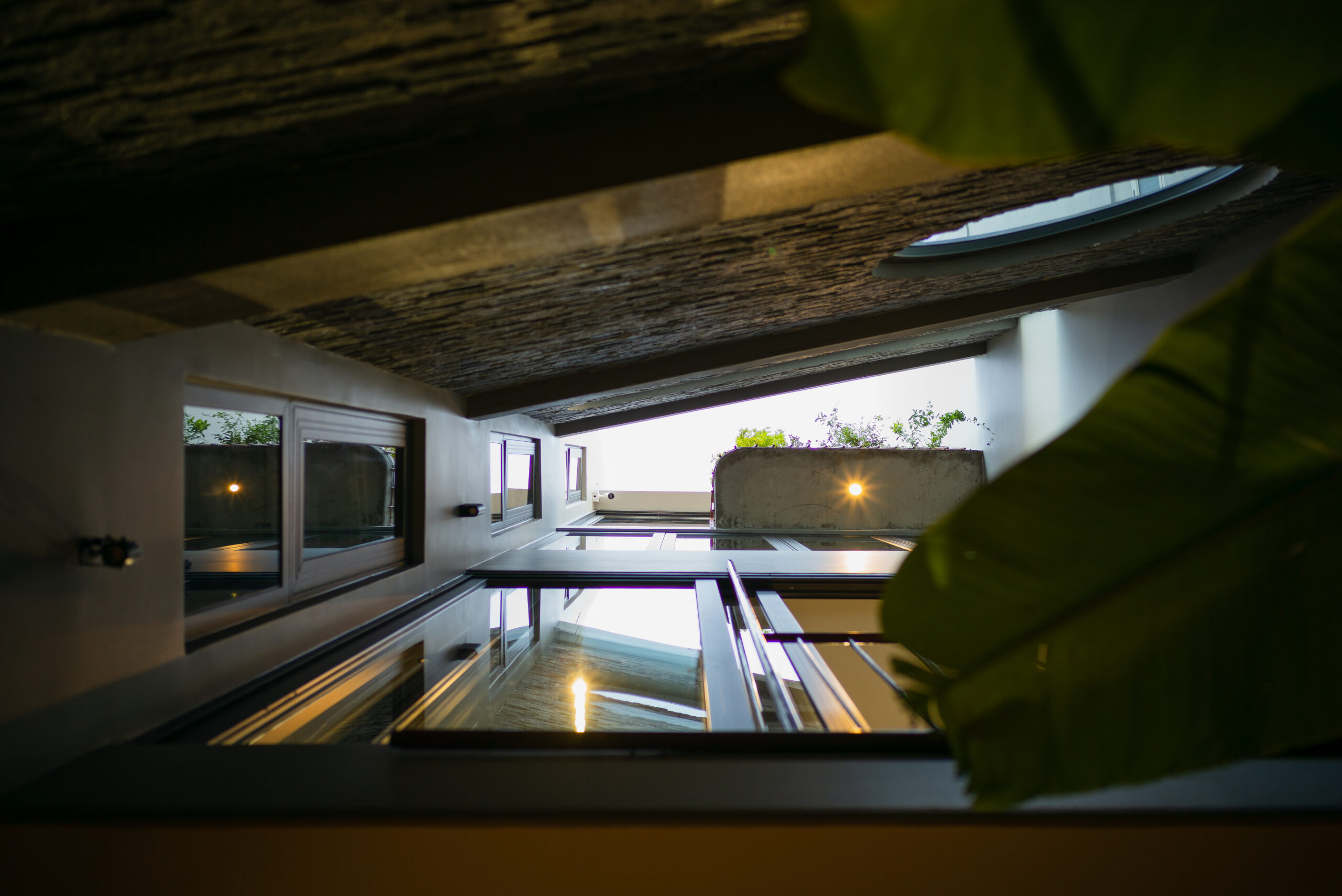 Mặt bằng ngôi nhà được bố trí theo cao độ sàn lệch tầng để ước lượng khoảng cách các không gian với nhau. Các ô thông tầng ở vị trí giữa và cuối nhà hình thành những mảng xuyên sáng vào không gian bên trong. Ngôi nhà gần như không cần sử dụng các thiết bị làm mát bởi có sự đối lưu gió nhờ các trục thông tầng.