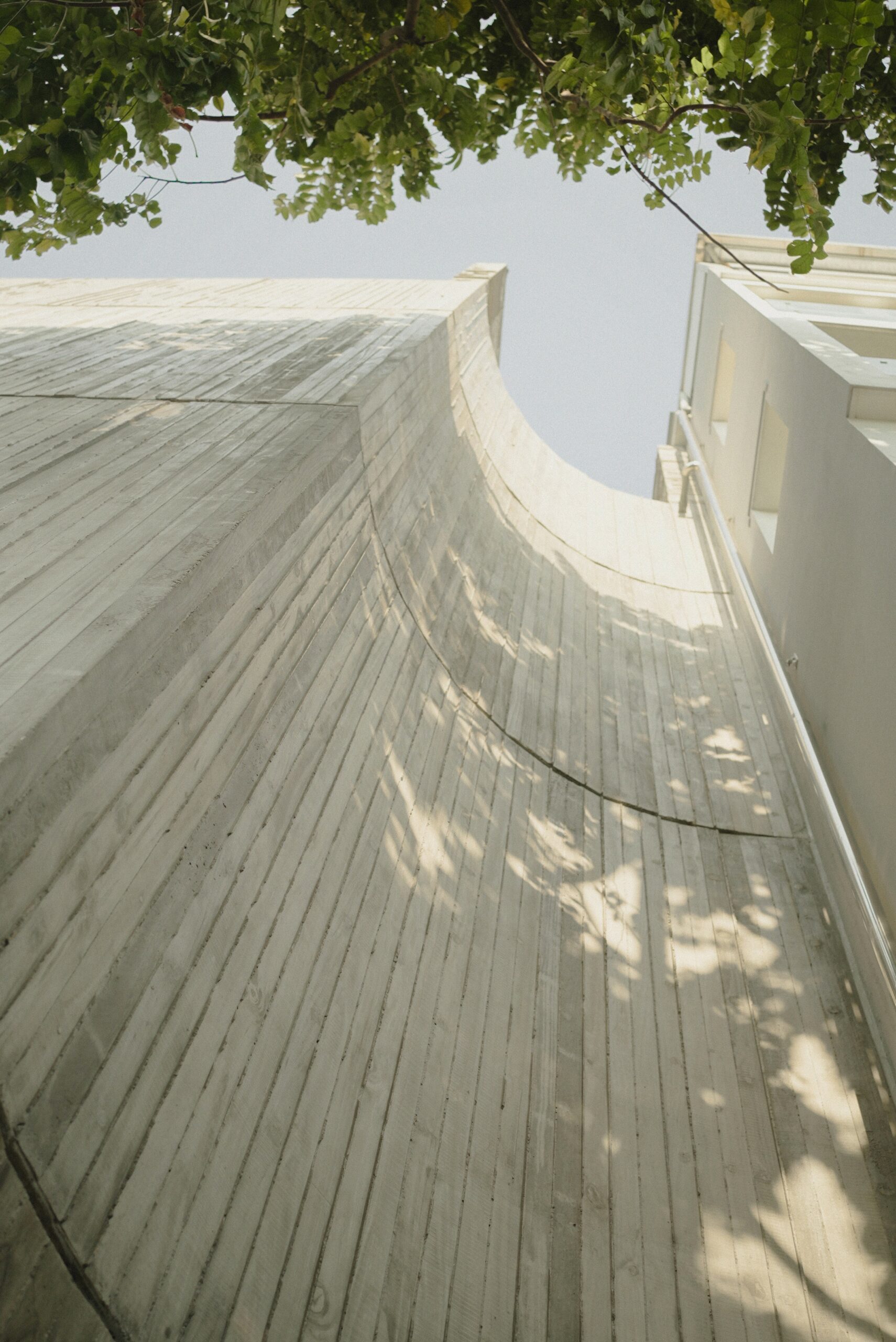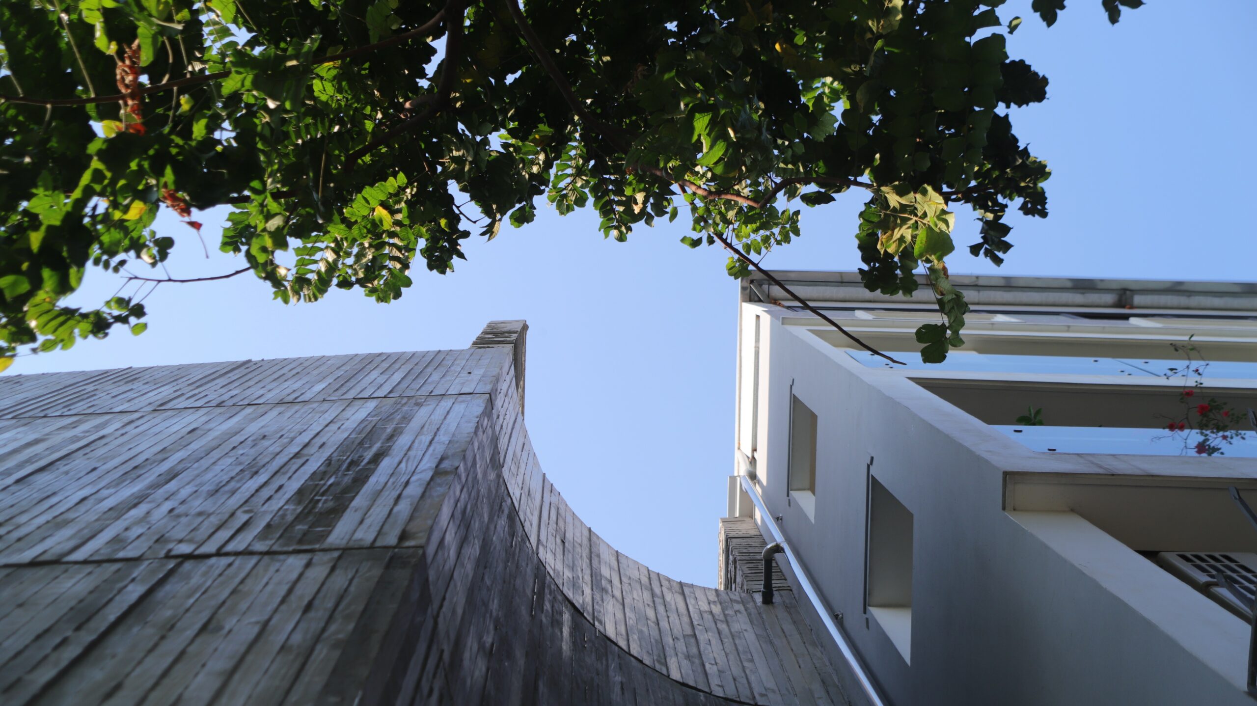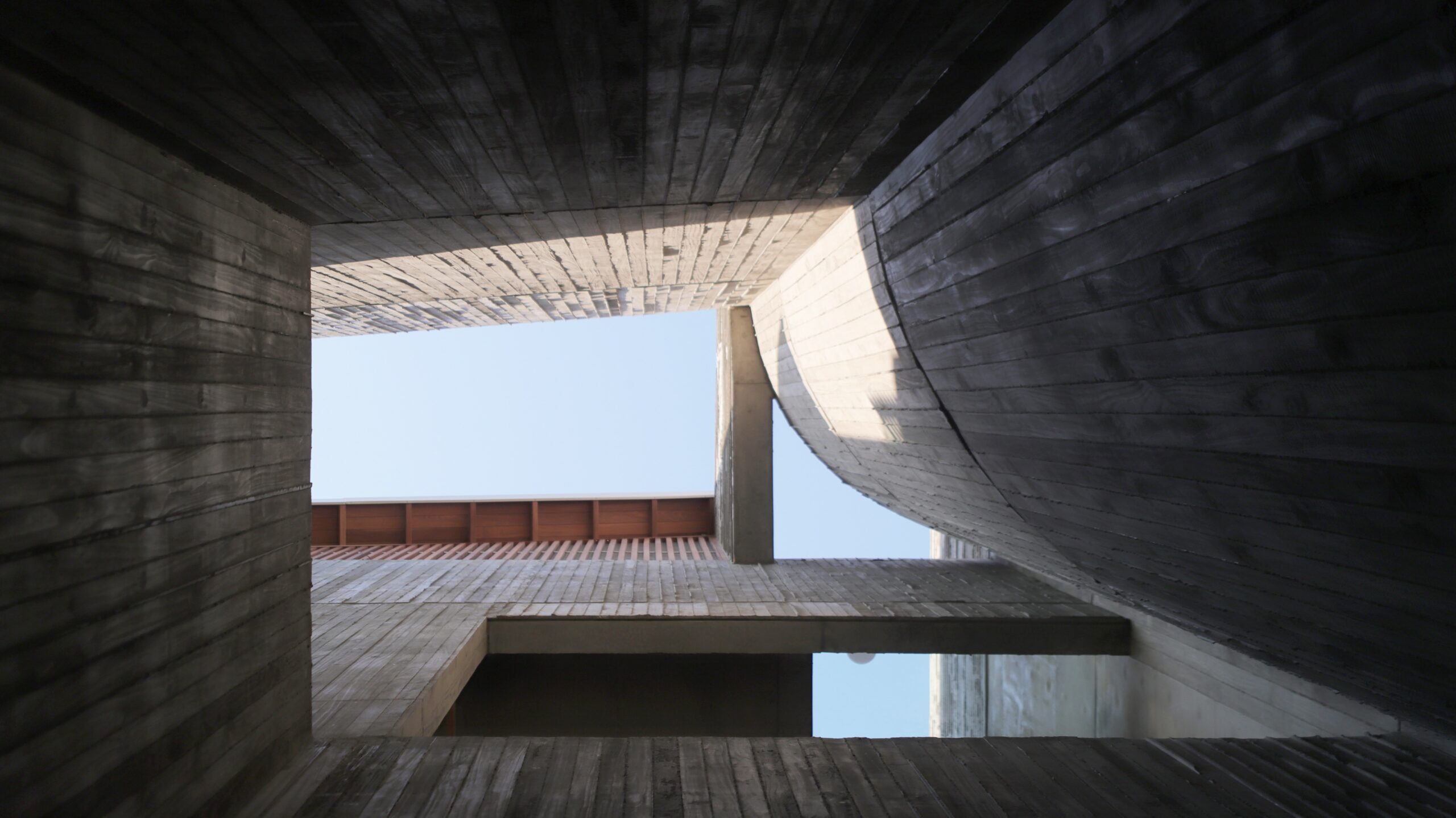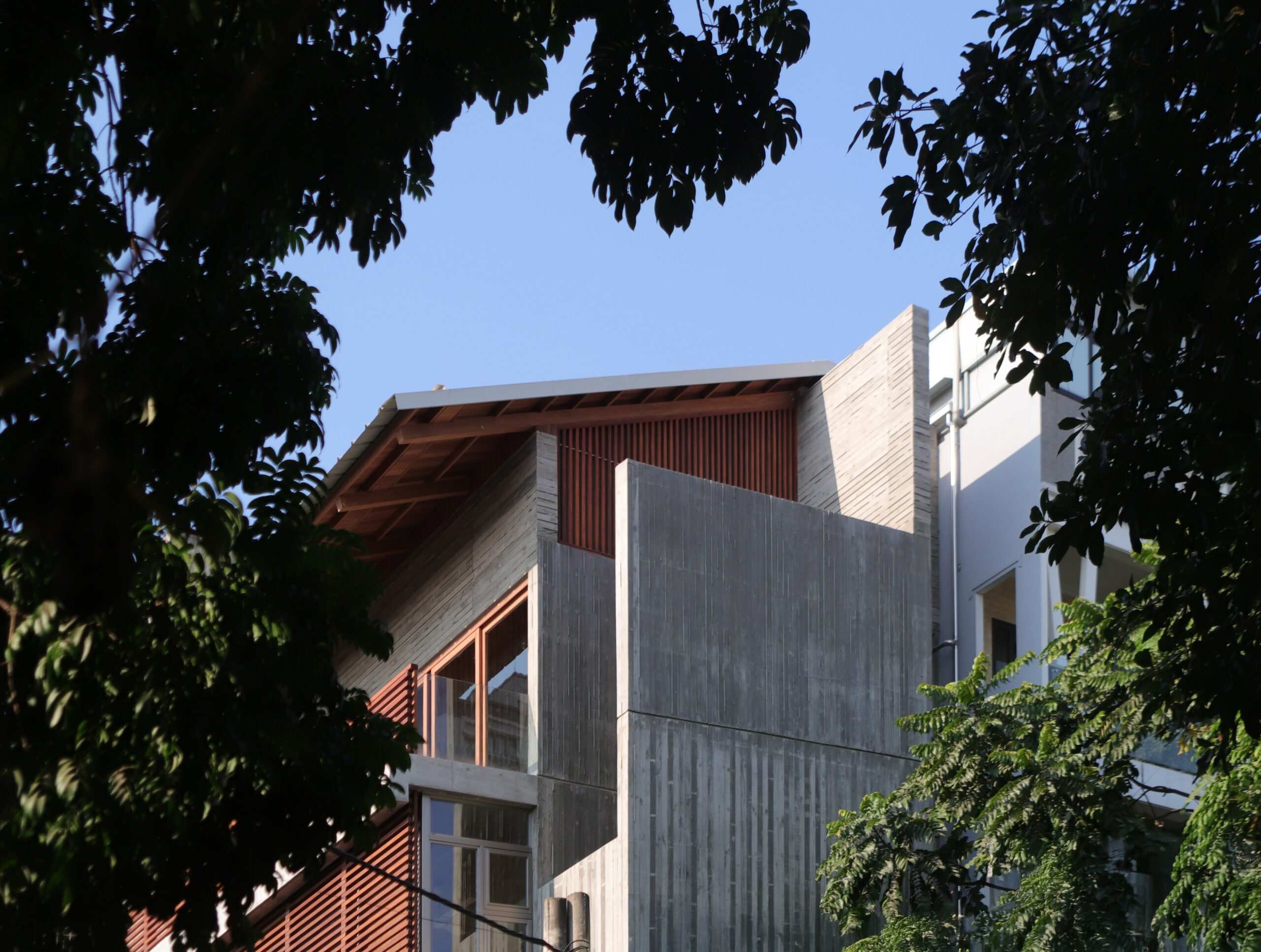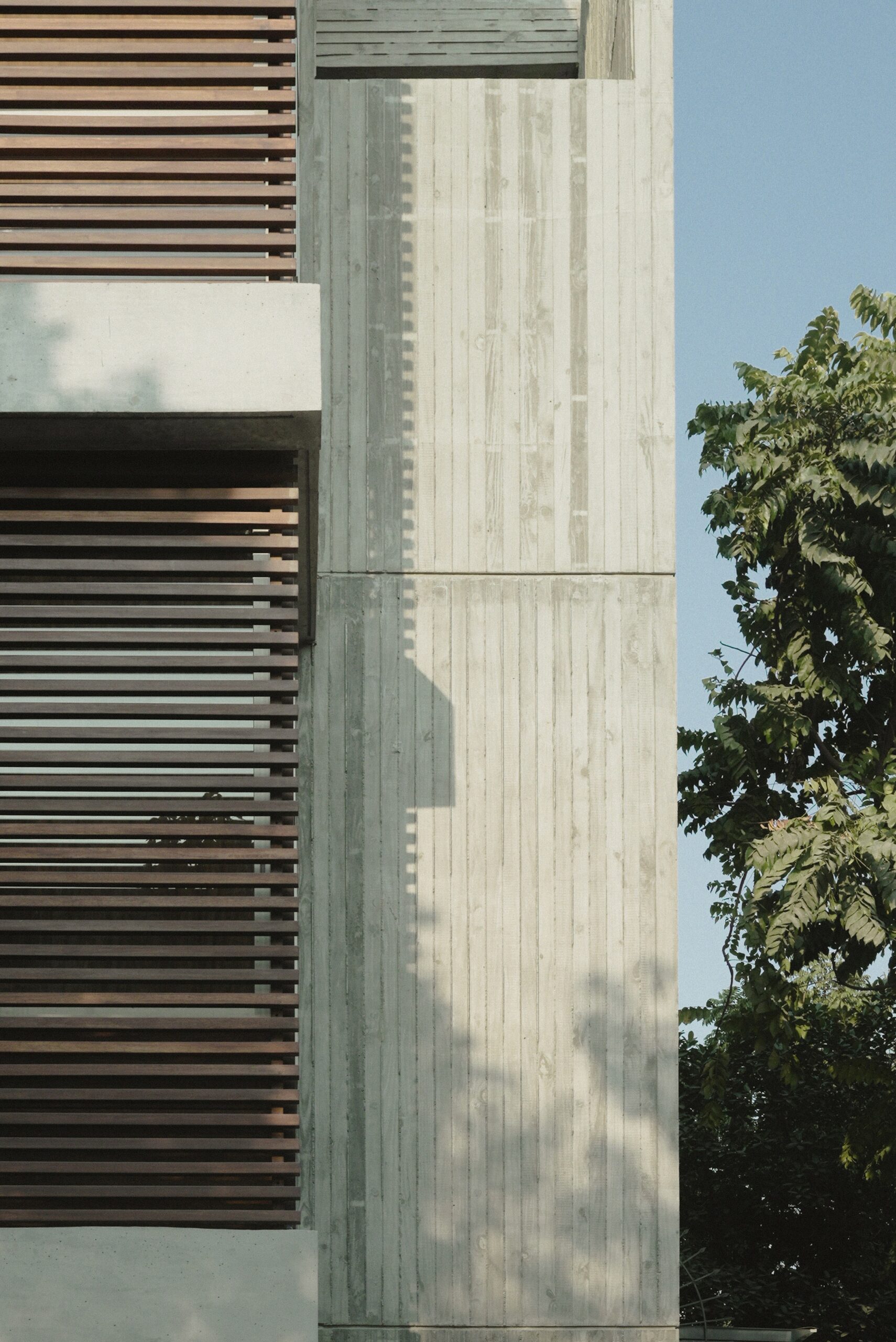 Mặt tiền hướng Tây được kiểm soát bằng mái che và hệ cửa chớp trượt rỗng, giúp giảm bức xạ nhiệt và cho phép mở linh hoạt vào những thời điểm mát trong ngày để đón gió. Ánh sáng và không khí được dẫn theo phương đứng, hình thành trải nghiệm không gian đa lớp, liên tục và thích ứng.