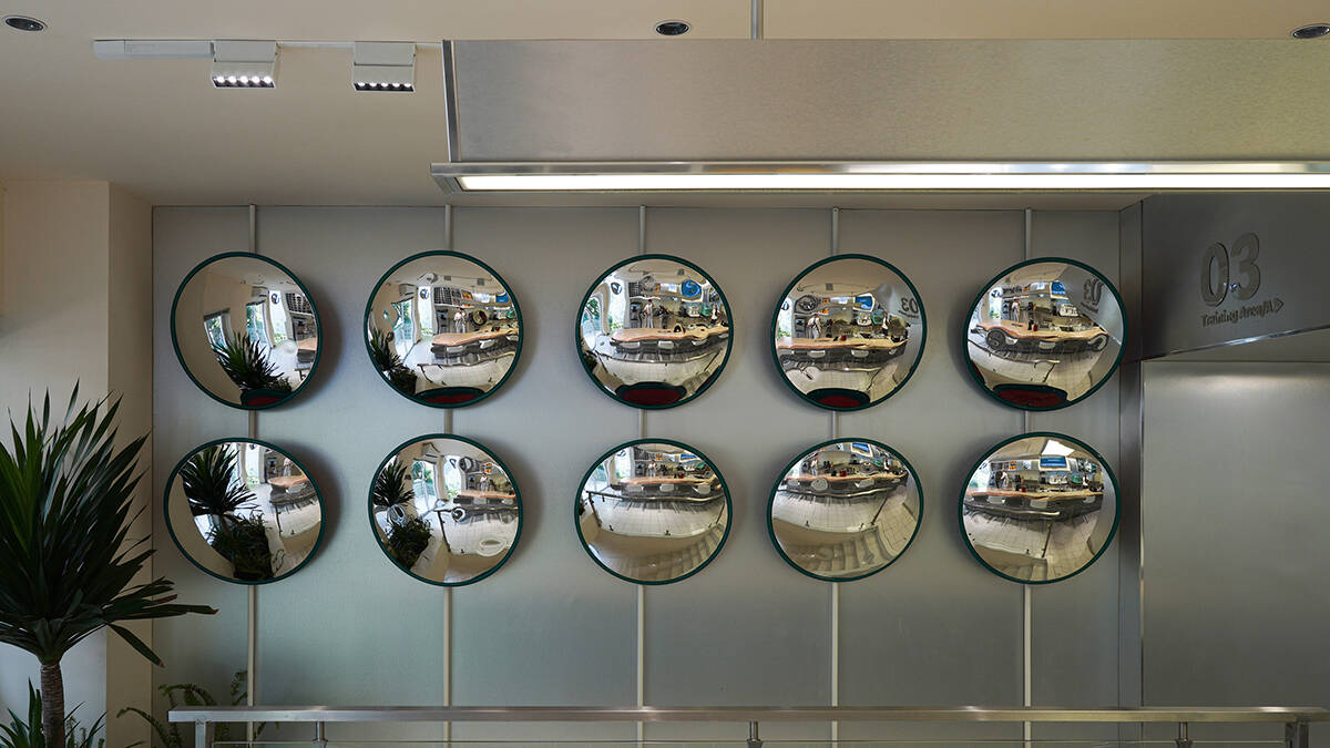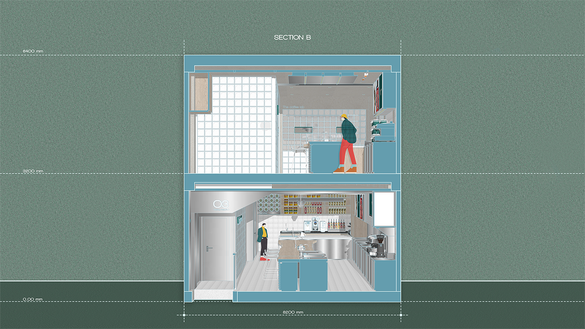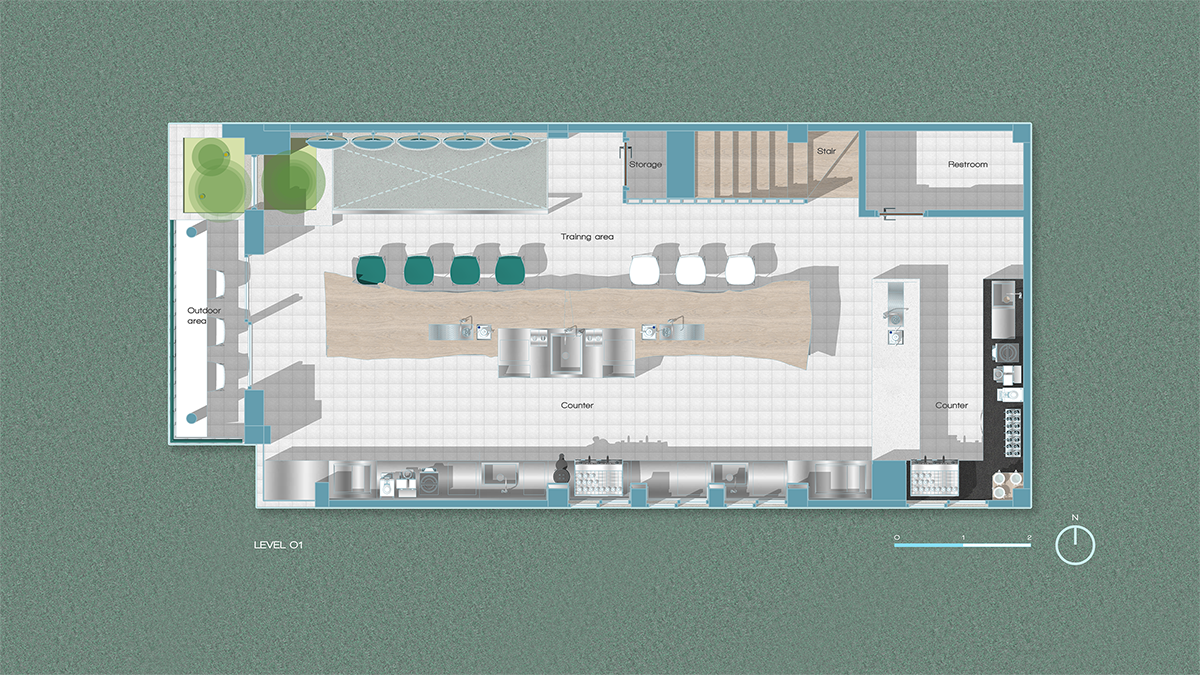 Để giải quyết được bài toán trên, team thiết kế tạo những nguồn sáng bên trong không gian tượng trưng cho ánh sáng mặt trời, để đảm bảo đủ sáng cho bên trong công trình. Ánh sáng tự nhiên được kiểm soát qua hệ lam lá sách, vừa hạn chế bức xạ nhiệt vừa tạo hiệu ứng đổ bóng mềm. Trong khi đó, lớp ánh sáng nhân tạo được bố trí để bảo đảm độ sáng tiêu chuẩn cho hoạt động đào tạo pha chế.