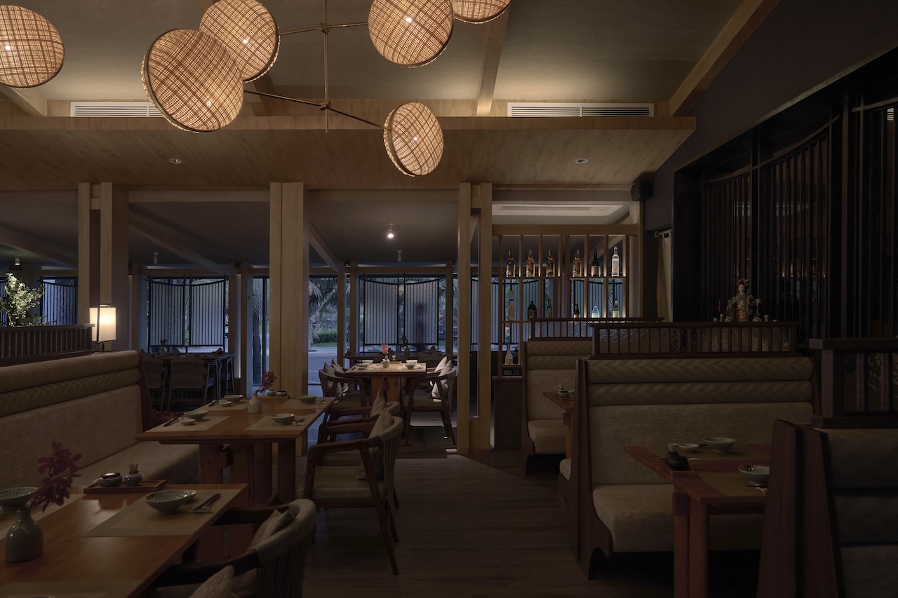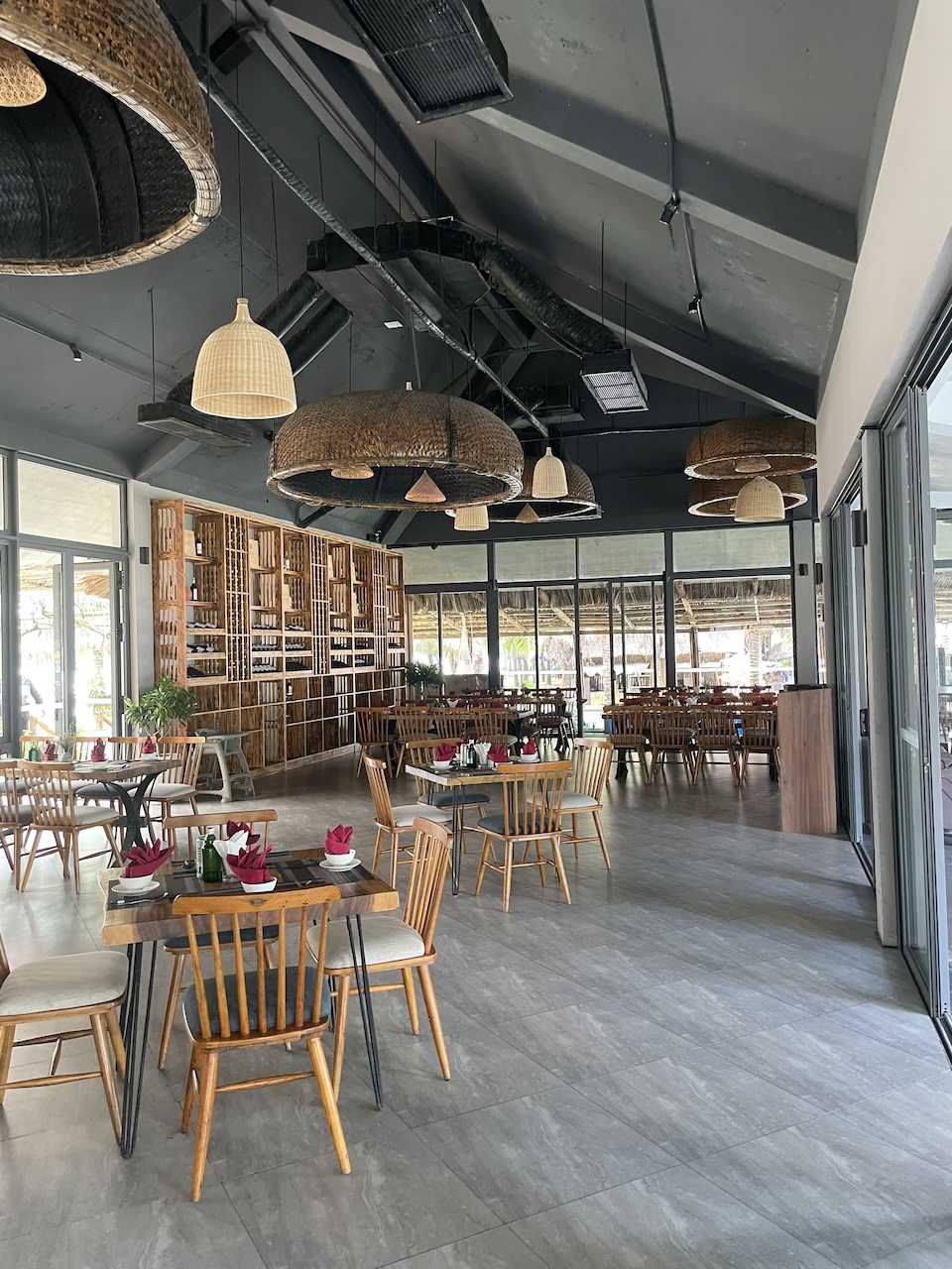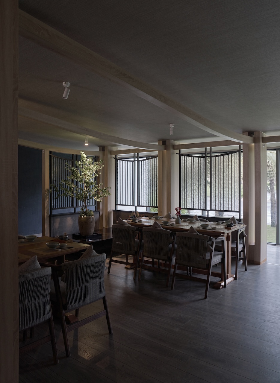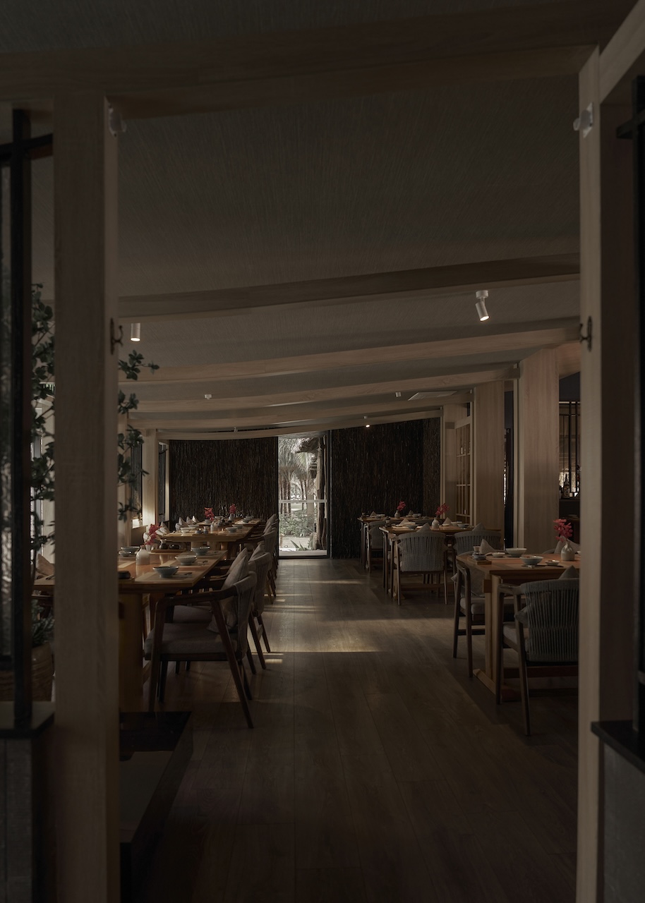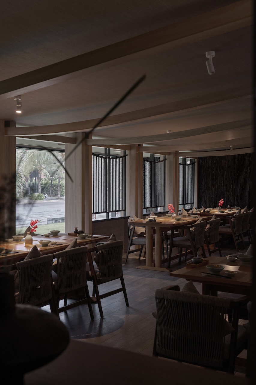 Việc tận dụng ưu thế view biển từ hệ vách kính hiện trạng, kết hợp với các vật liệu tự nhiên như gỗ, đá, mây tre cũng giúp khối nhà hàng hòa hợp với bao cảnh xung quanh.