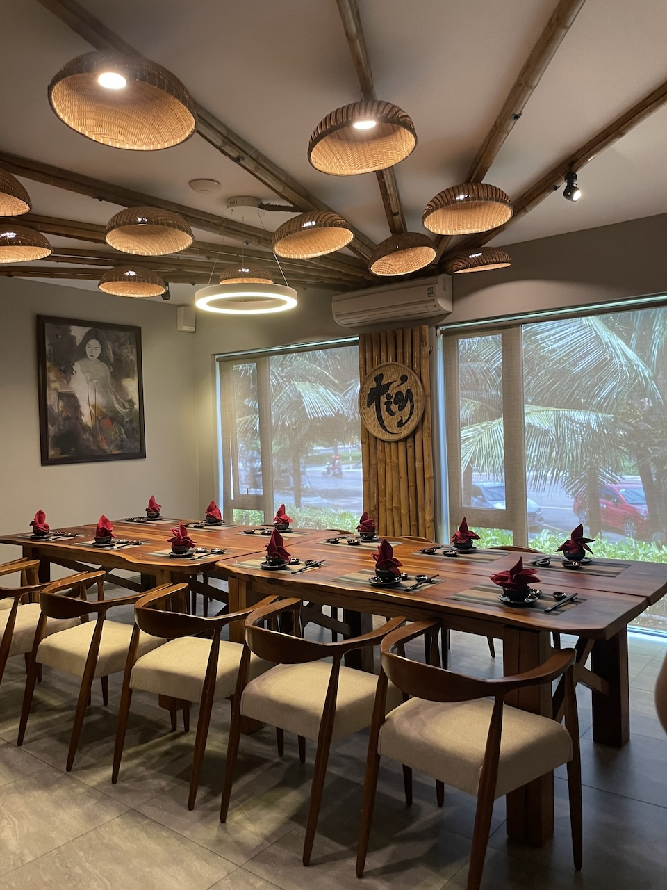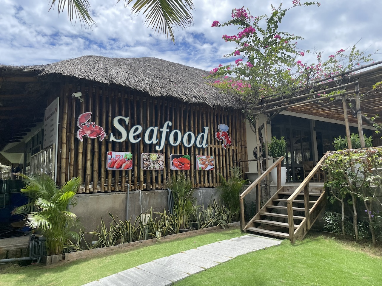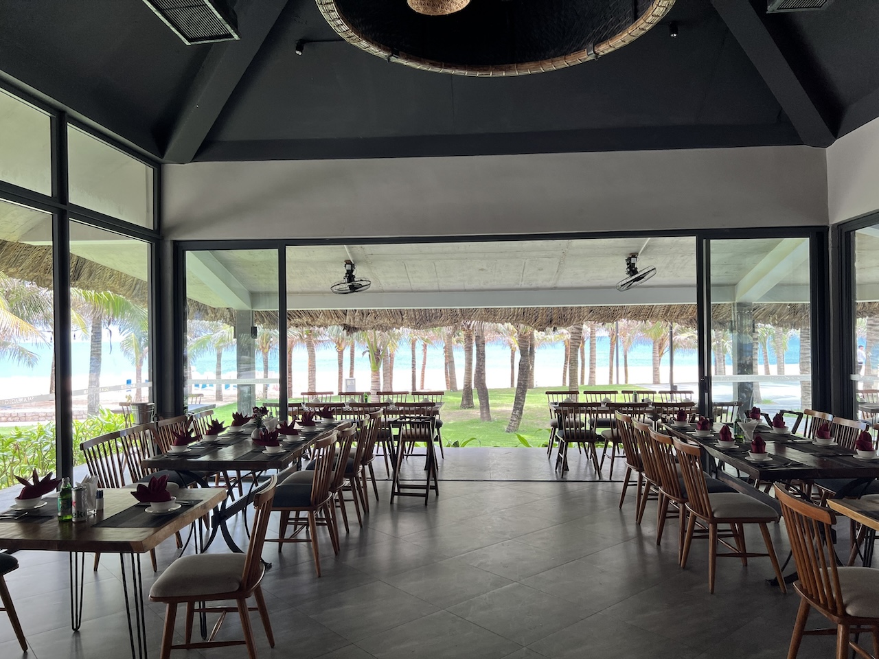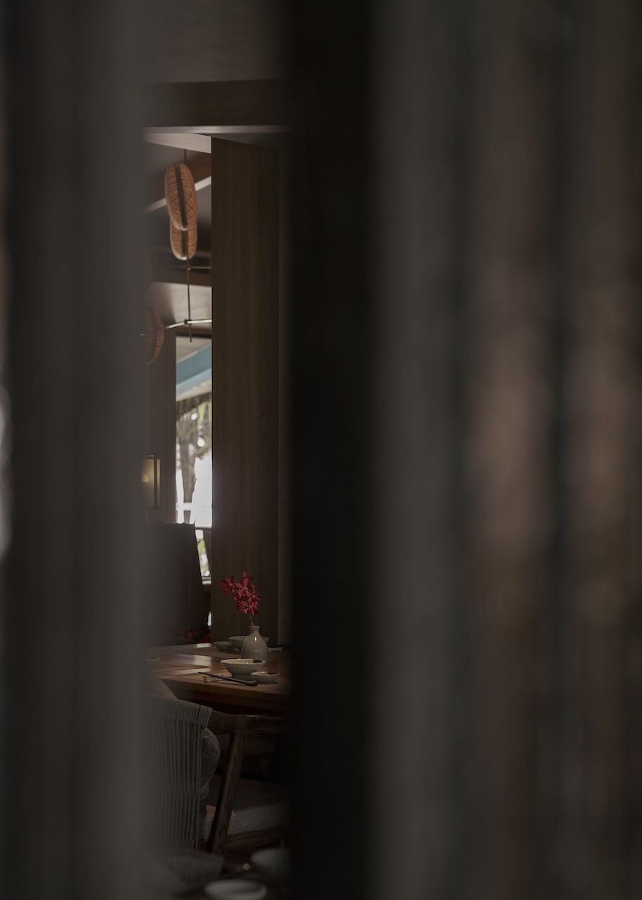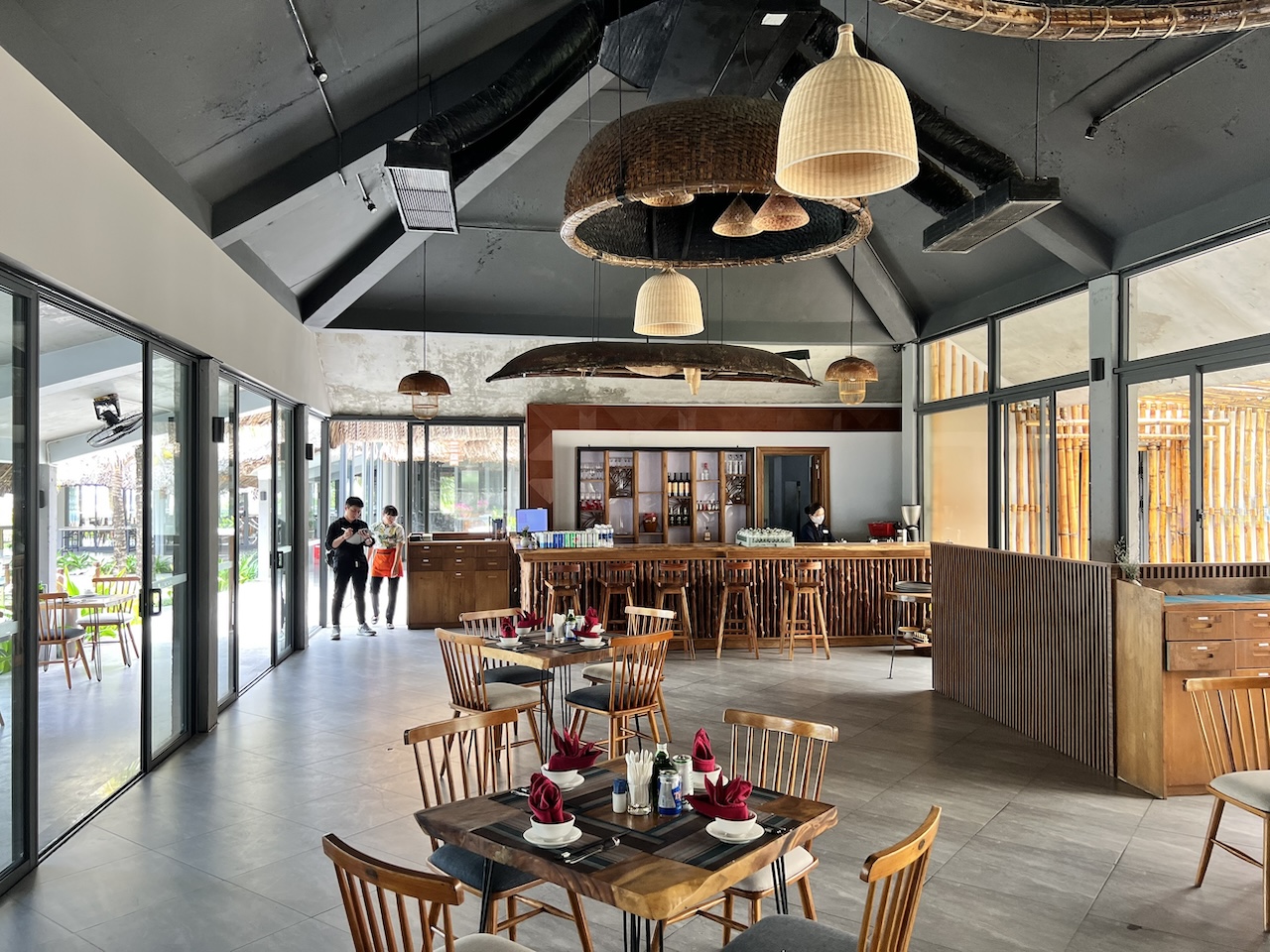 Việc tận dụng ưu thế view biển từ hệ vách kính hiện trạng, kết hợp với các vật liệu tự nhiên như gỗ, đá, mây tre cũng giúp khối nhà hàng hòa hợp với bao cảnh xung quanh.