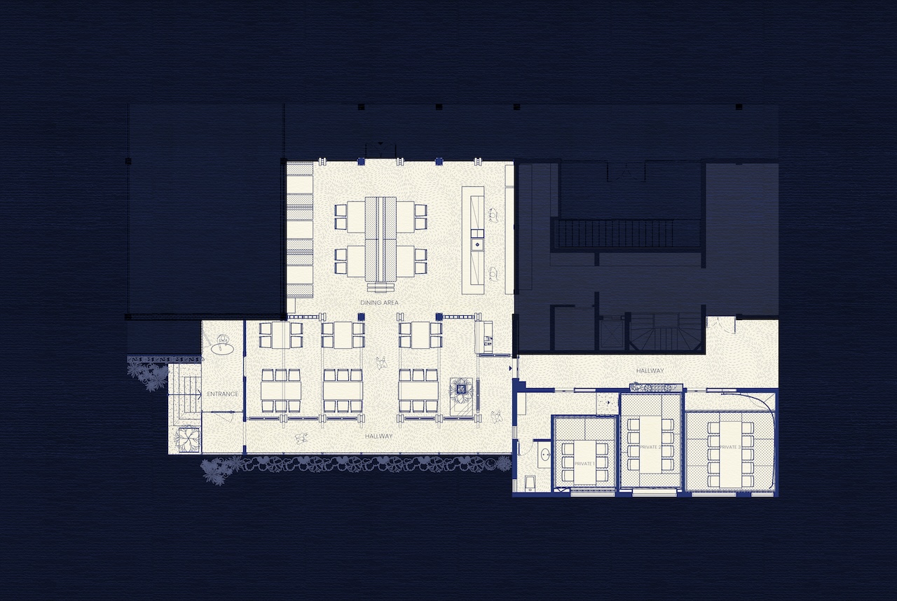 Dự án được lấy cảm hứng từ mặt biển lấp lánh buổi đêm dưới ánh trăng để tạo ra sự tương phản về màu sắc và chất liệu, đem lại chiều sâu và sự thú vị cho không gian. Tổng thể không gian gợi lên cảm giác một màu xanh đêm phủ lên toàn bộ không gian dù xuất hiện dưới hình thực vật liệu nào cũng tạo nên đa sắc độ xanh. Bên trên nền màu xanh là sự tương phản của các vật liệu với chủ đích bề mặt thô, mộc mạc nhưng độ hoàn thiện tinh xảo.