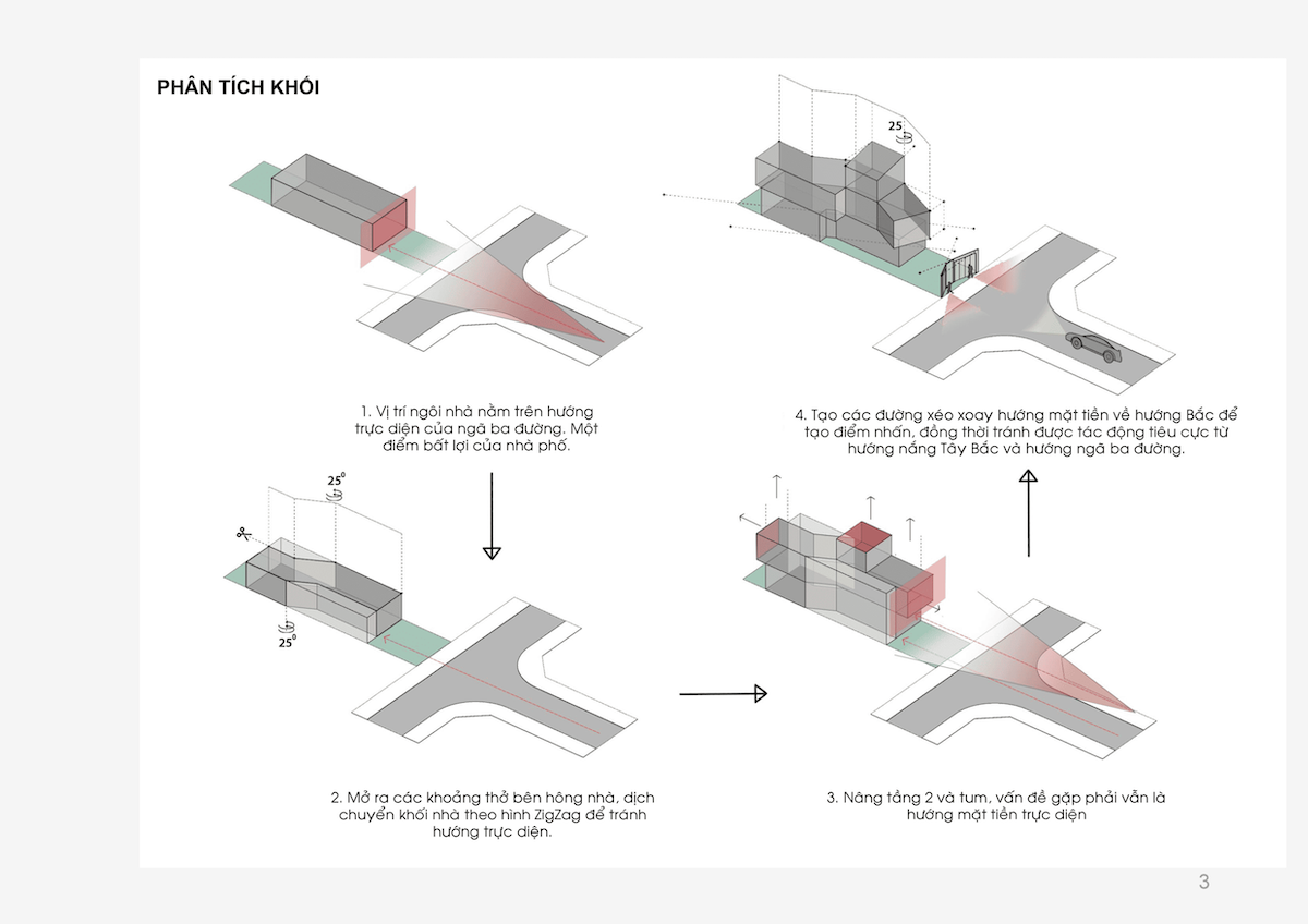 Zig House nằm giữa nhịp sống hối hả của khu dân cư, sở hữu vị trí đắc địa nhưng cũng đầy thách thức: Mặt tiền đối diện ngã ba đường và chịu ảnh hưởng trực tiếp của nắng hướng Tây Bắc.